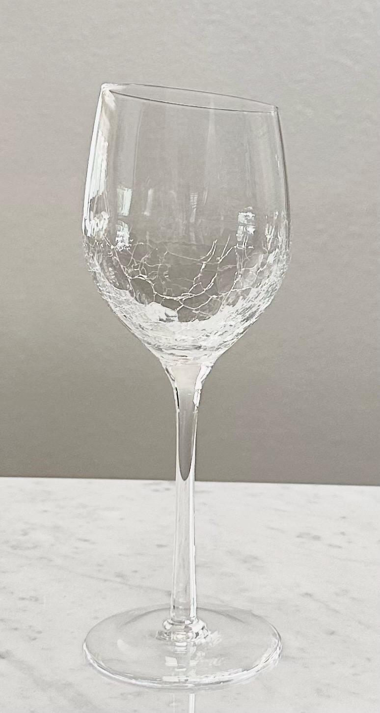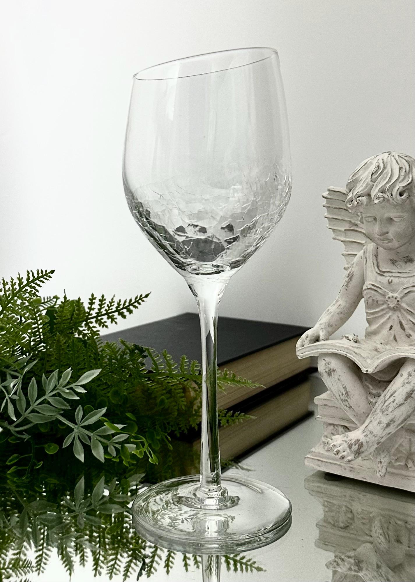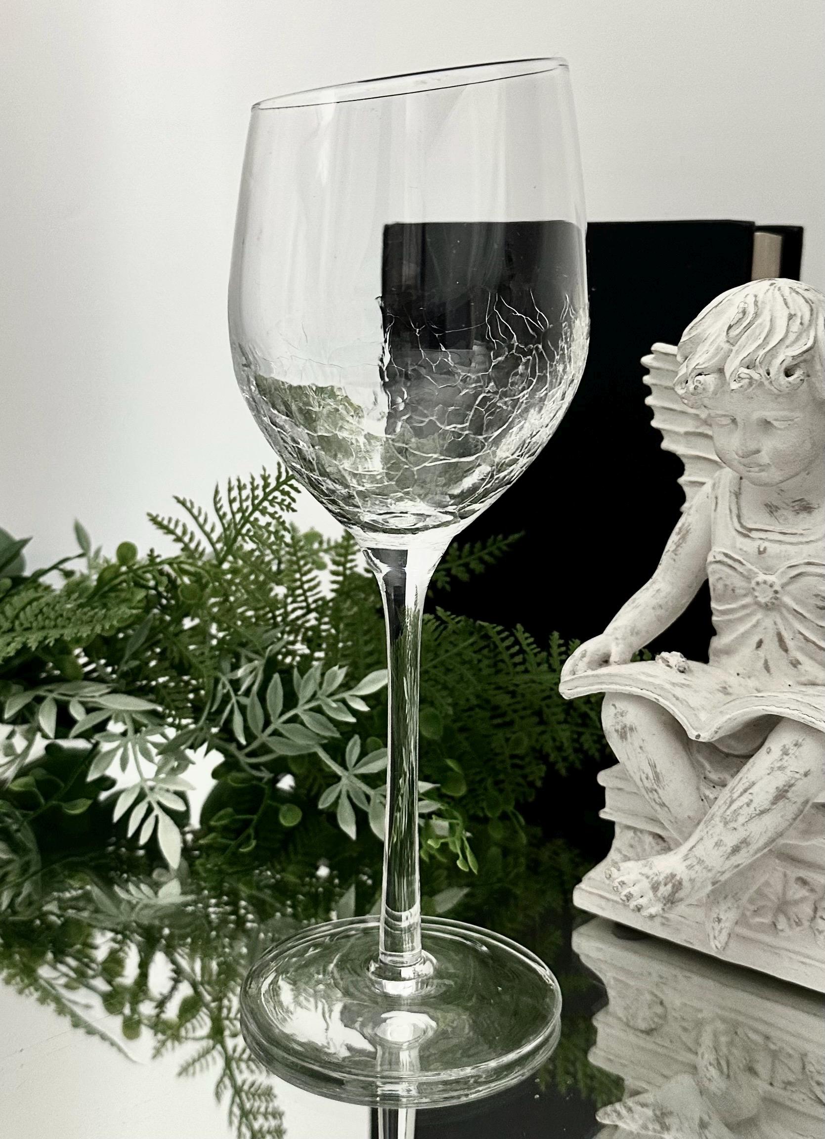 This is for 1 Vintage Angled Rim Pier 1 Crackle White Wine Glass. This glass measures: 8 7/8 inches tall x 2 3/4 inches in diameter.