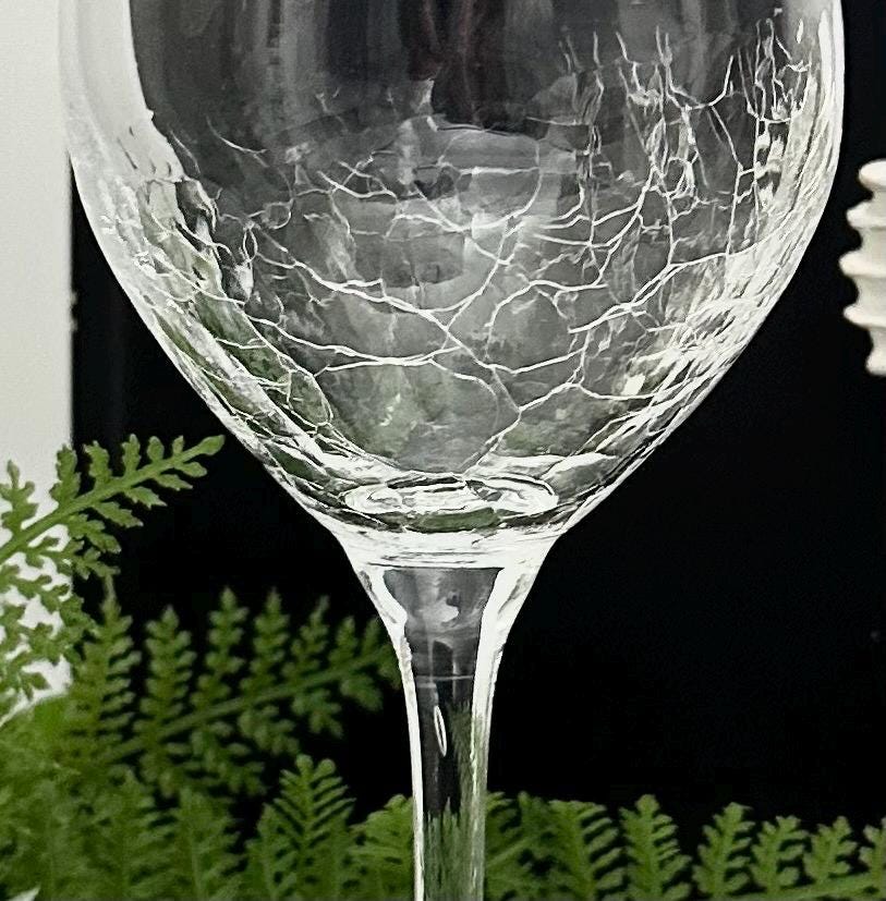The bowl is clear with the crackles at the base of the bowl and a round clear stem. This wine glass size and holds 12 Oz of liquid. This line was produced from 2007 to 2017 and now discontinued.