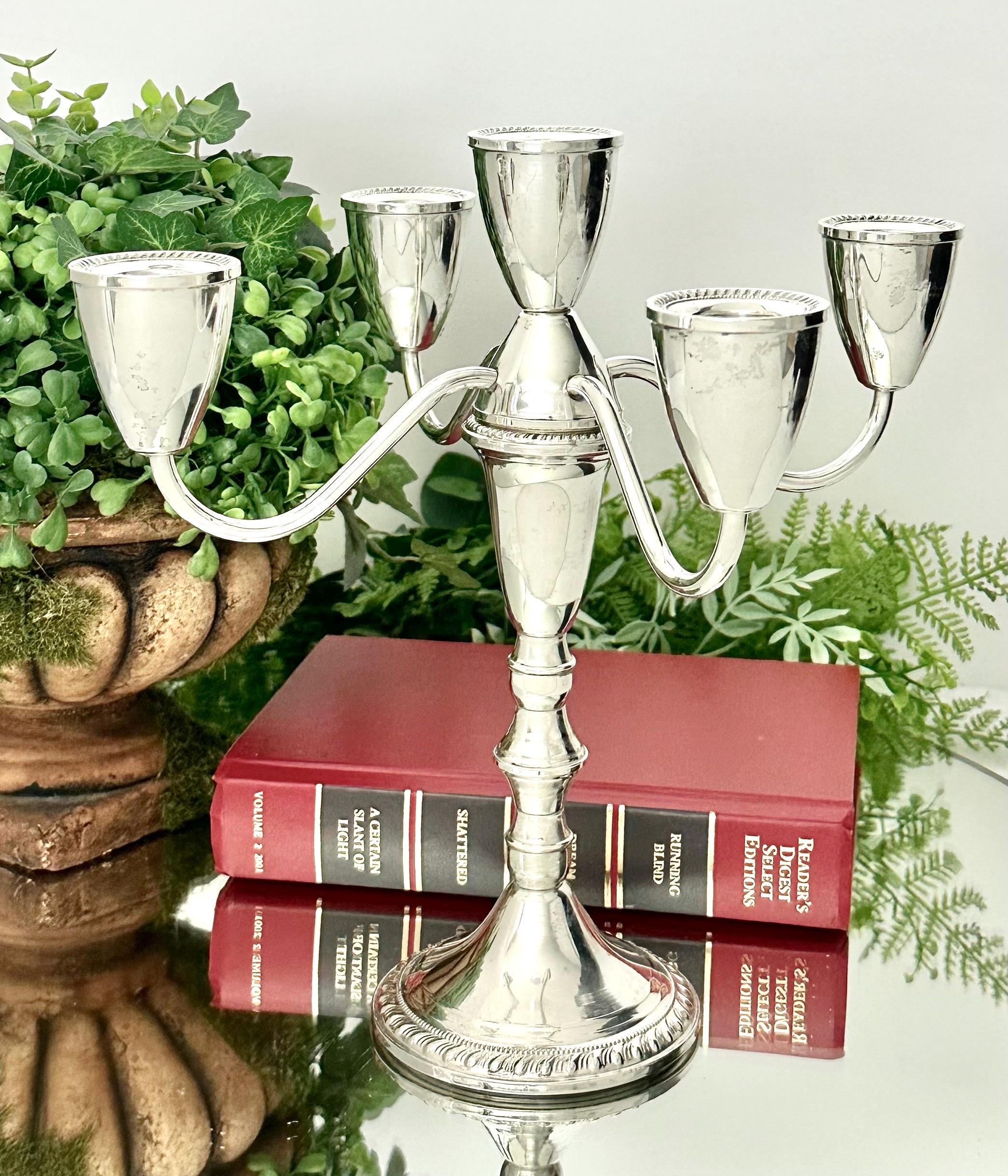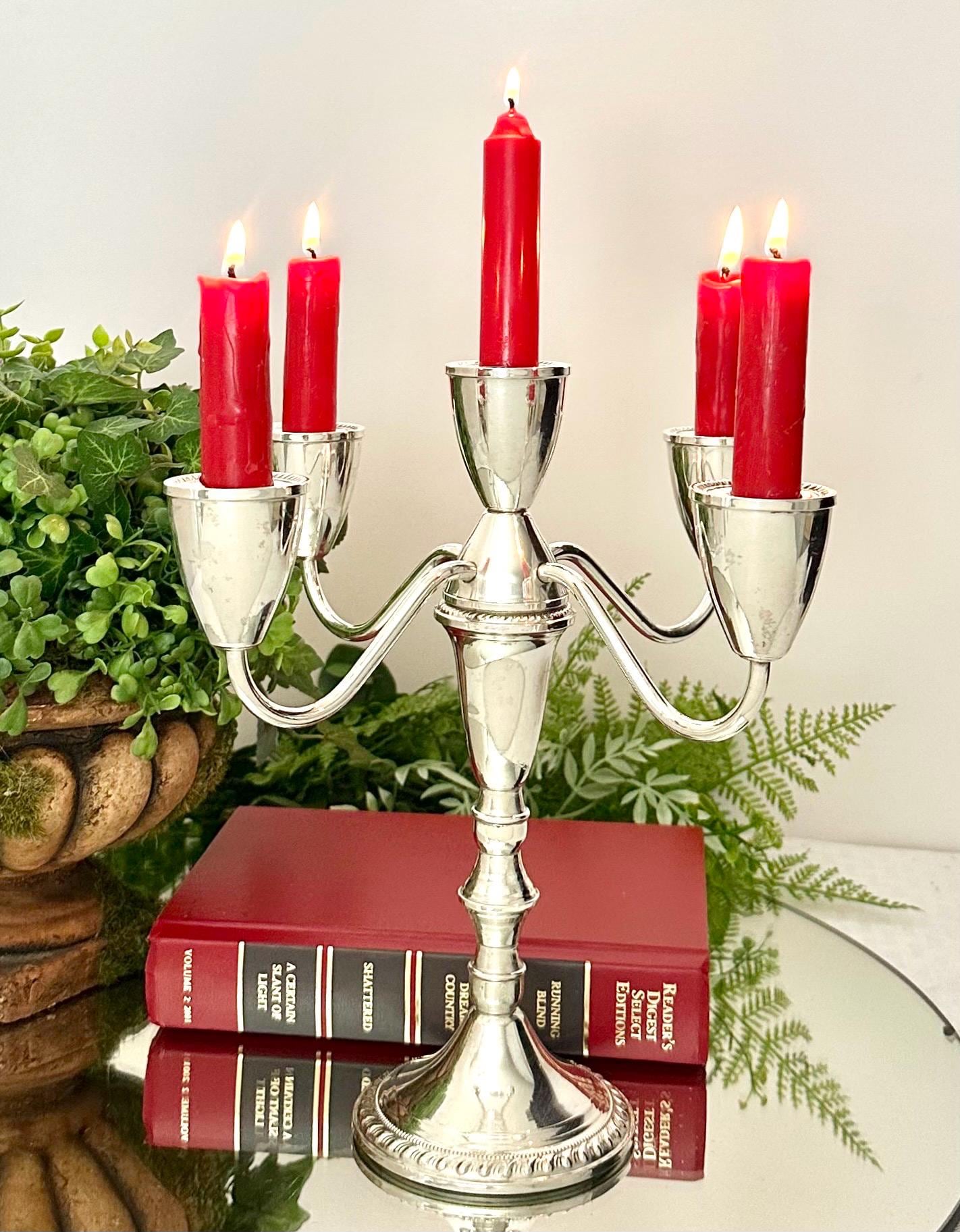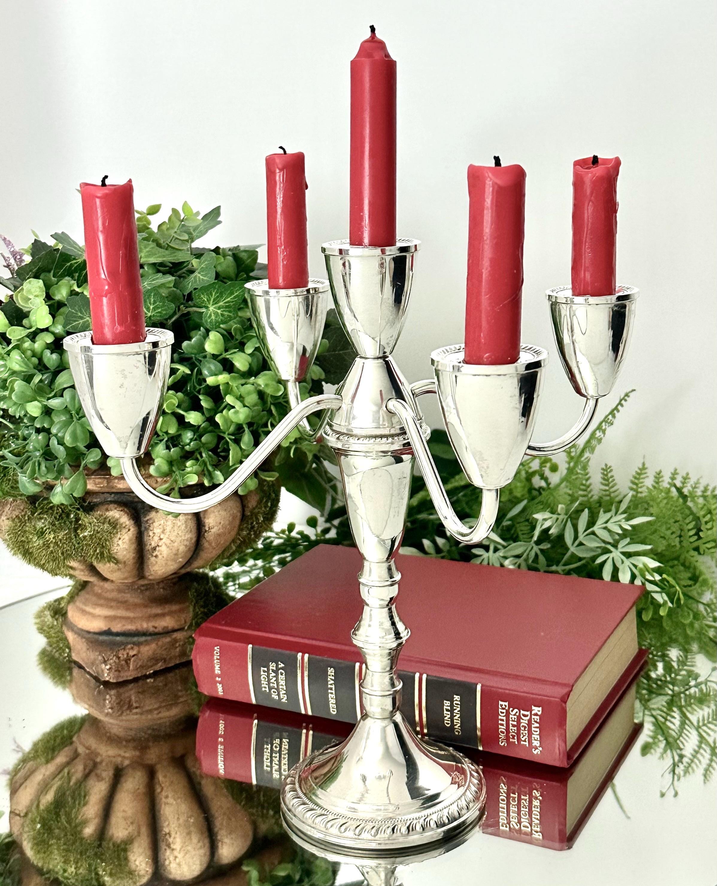 This is for a beautiful a vintage Duchin Creations 5 Arm candelabra made of sterling silver (.925) with a traditional style. It is a convertible candle holder, suitable for 1 taper candle or use as shown with the arm and will hold 5 dinner taper candles.