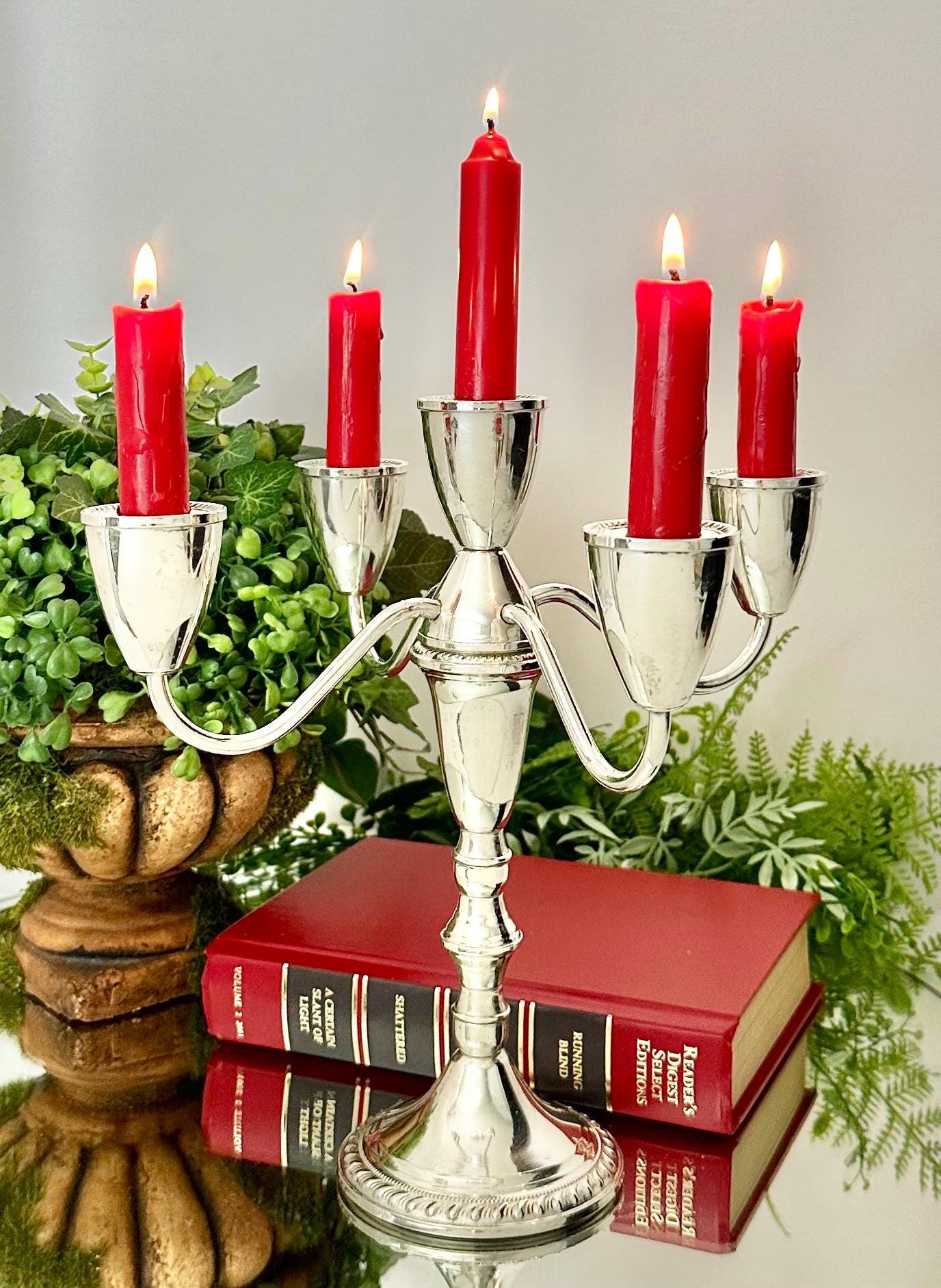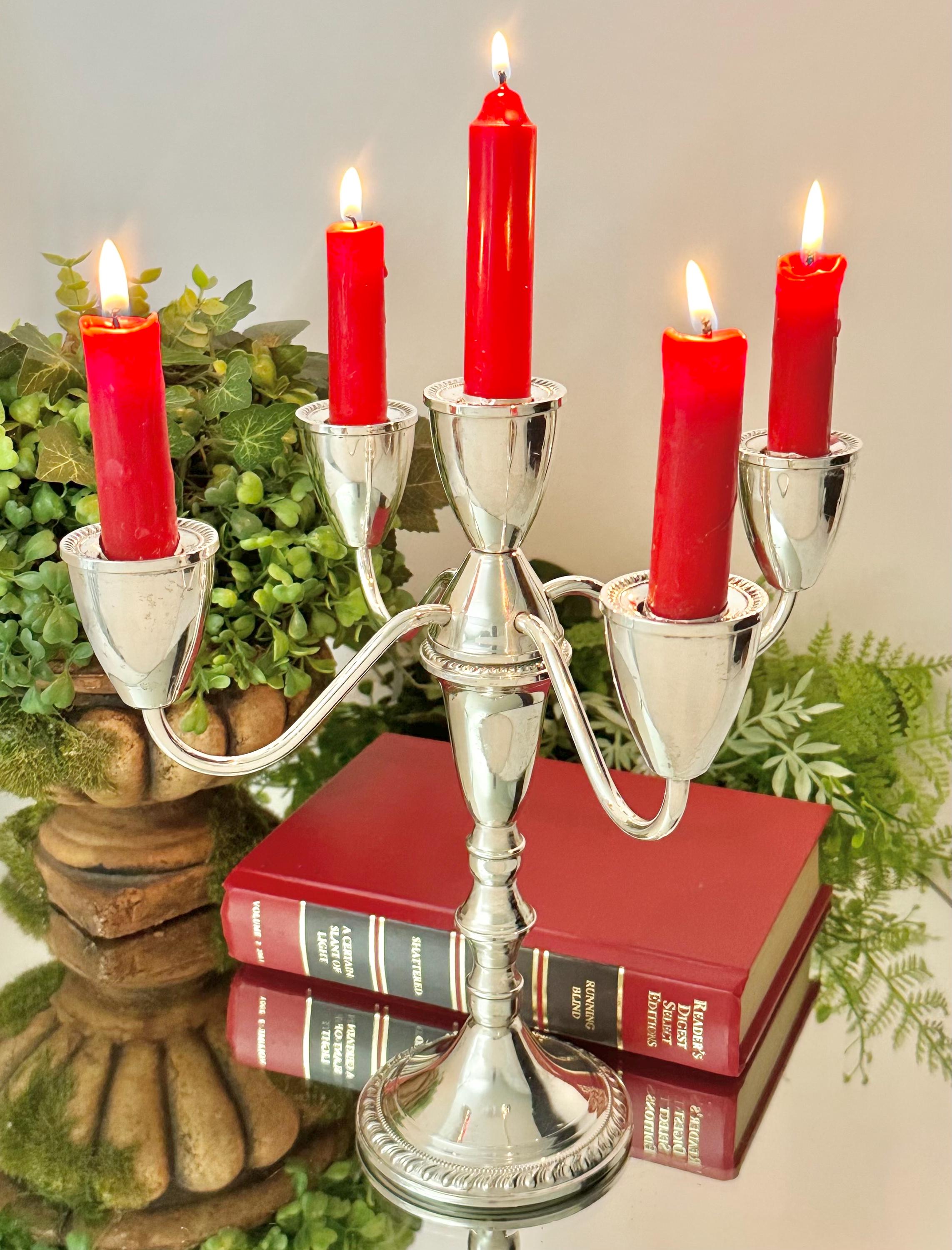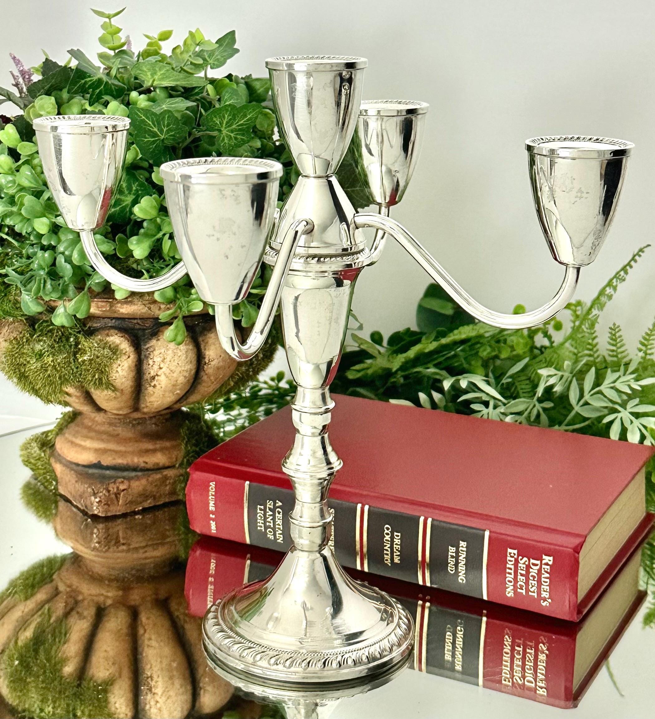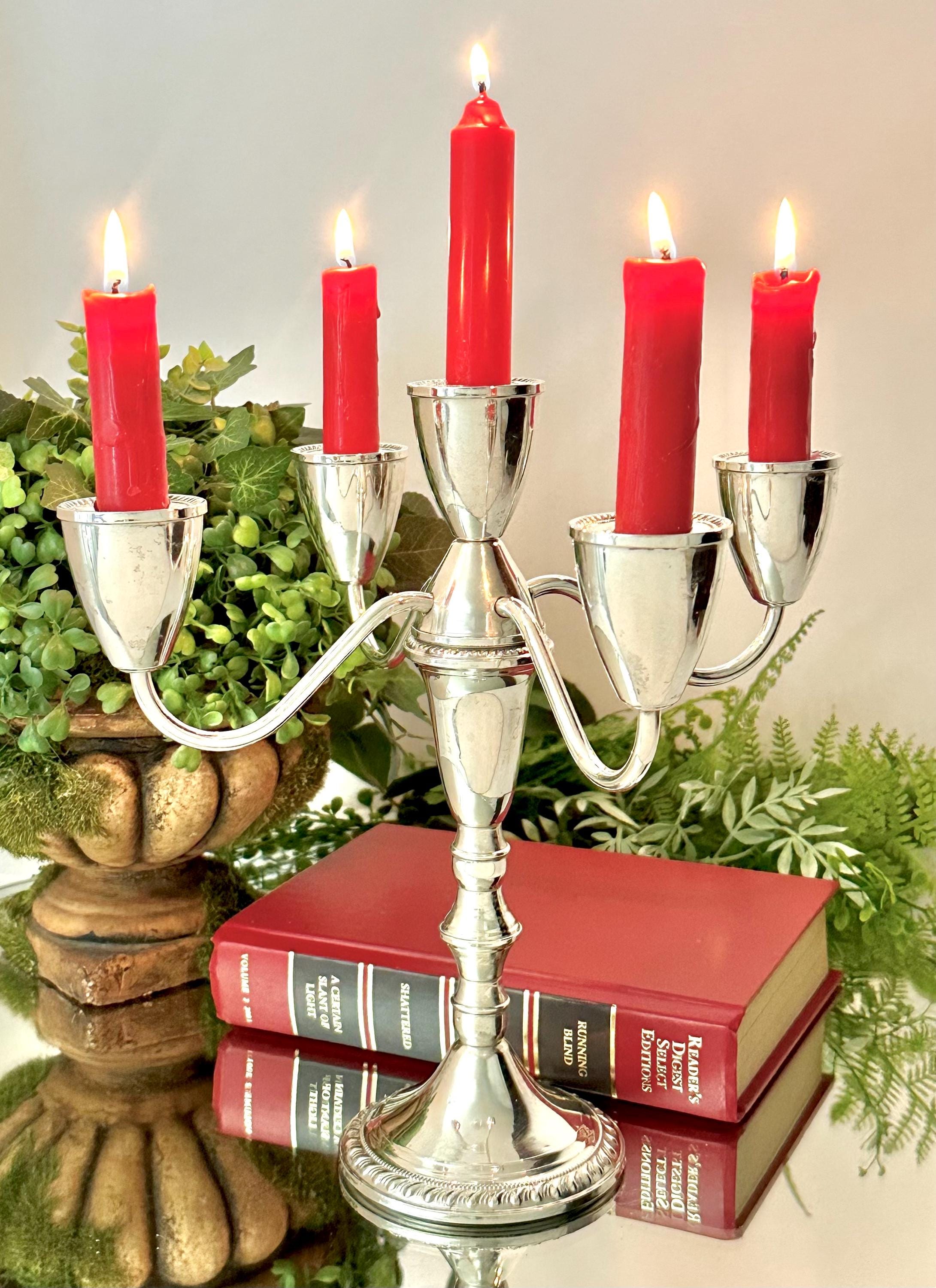 This is for a beautiful a vintage Duchin Creations 5 Arm candelabra made of sterling silver (.925) with a traditional style. It is a convertible candle holder, suitable for 1 taper candle or use as shown with the arm and will hold 5 dinner taper candles.