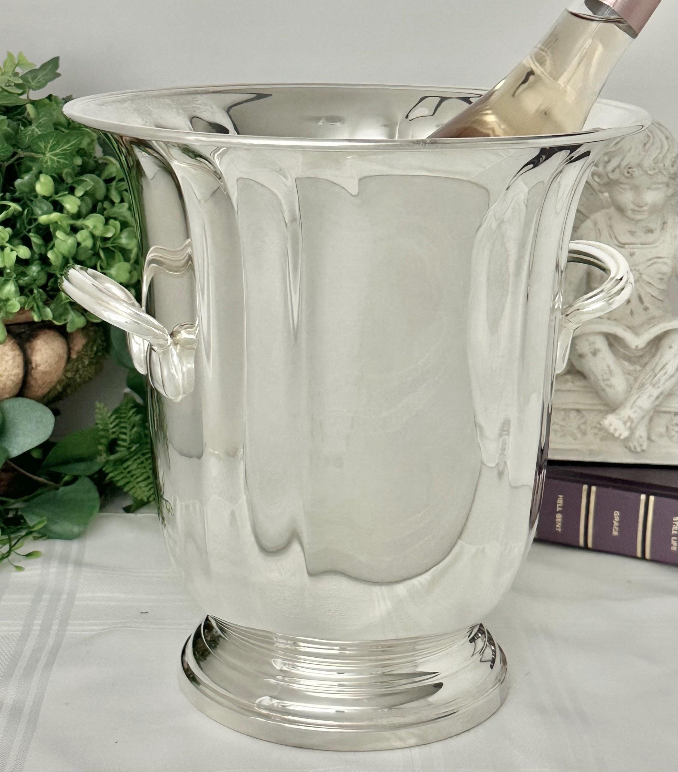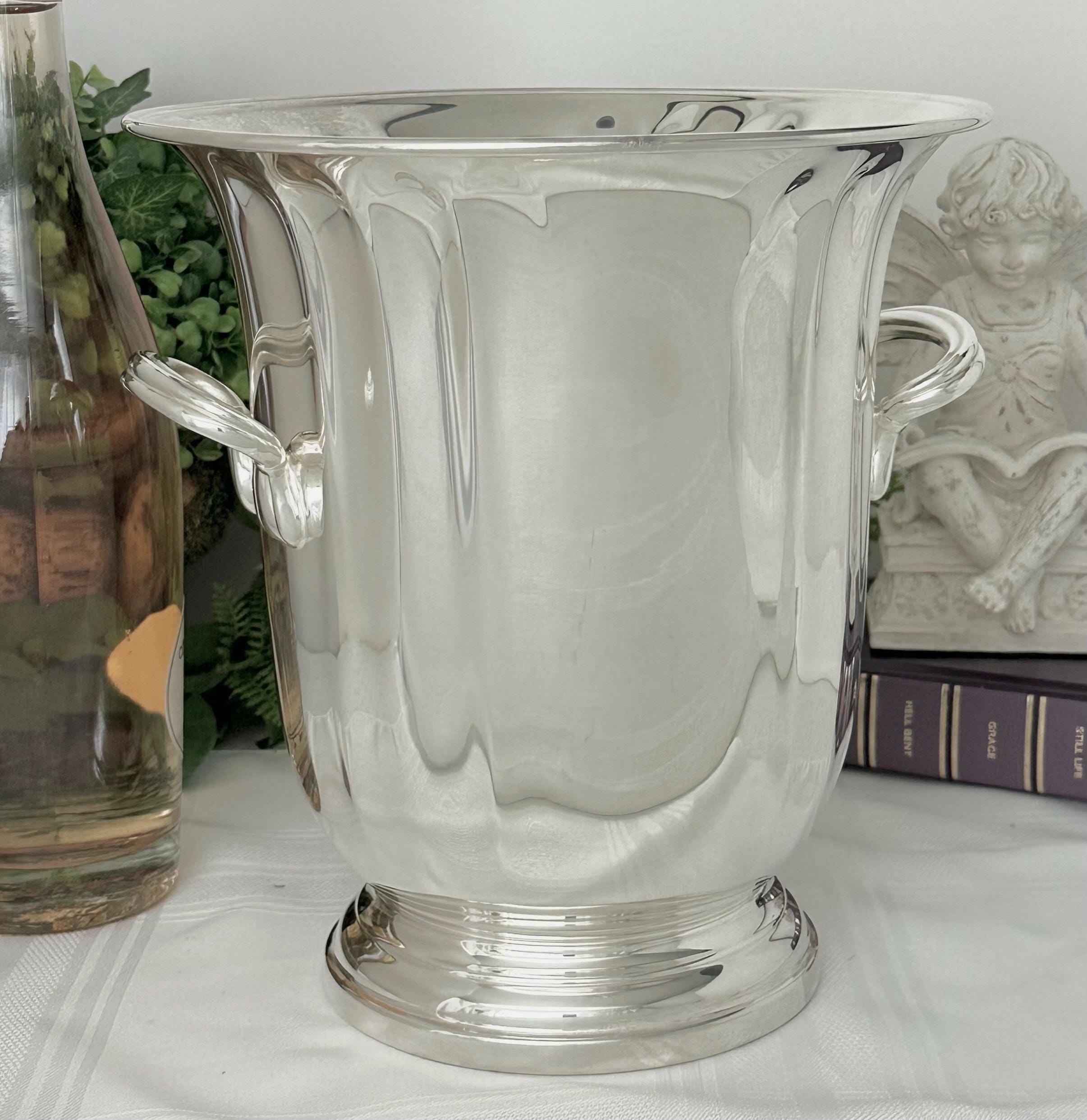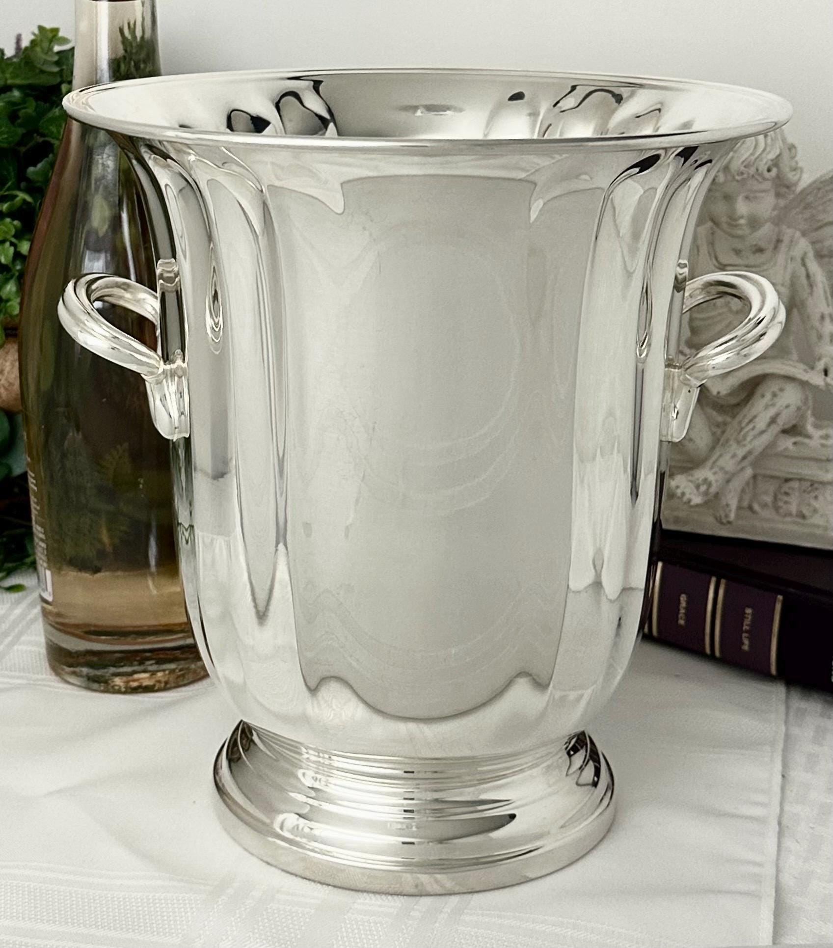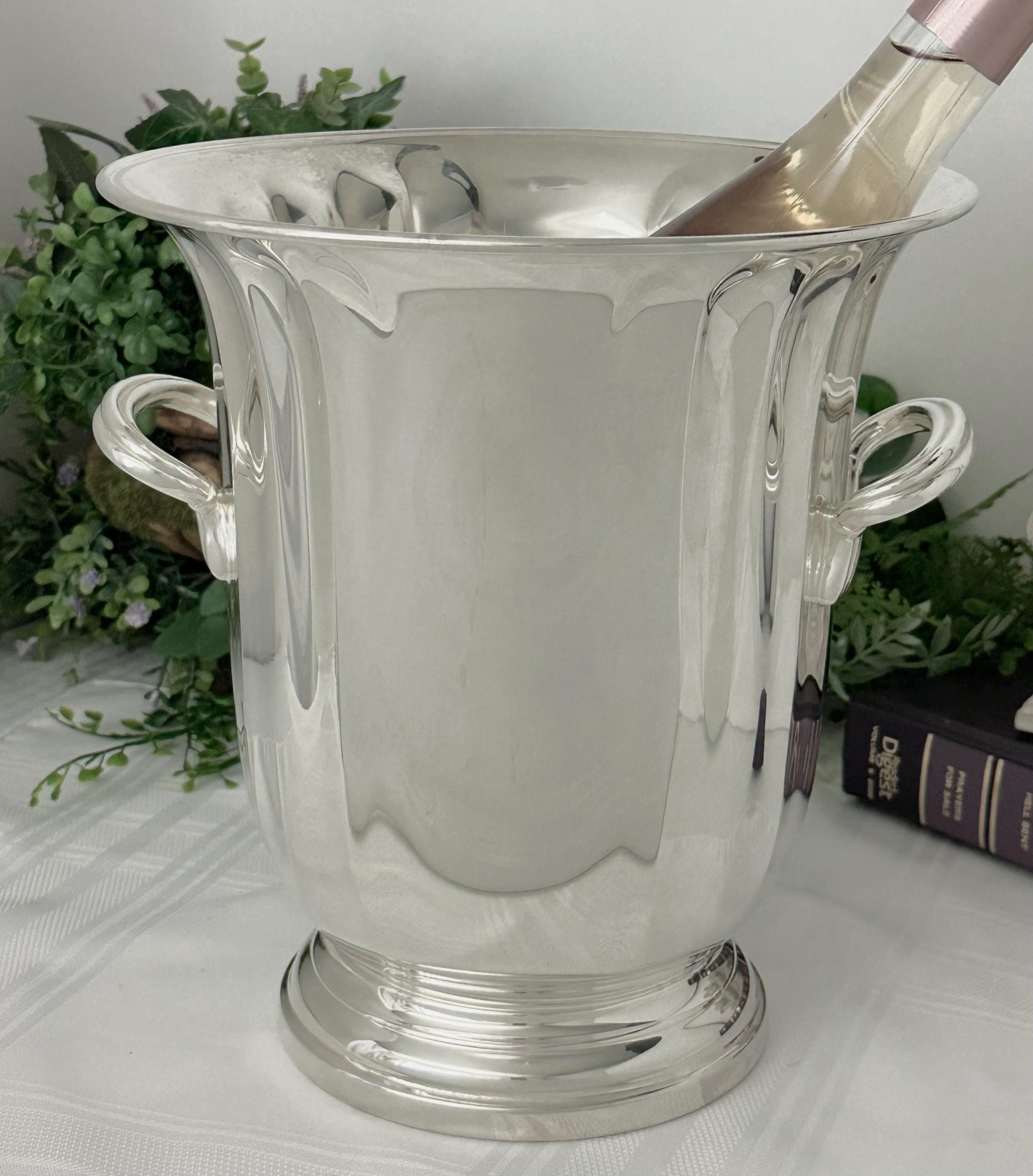 The vintage champagne bucket has handles on the sides a fluted style rim, the makers marks on the base while measuring approx 9.5 inches tall x 9.5 inches wide x 9 inches in diameter.