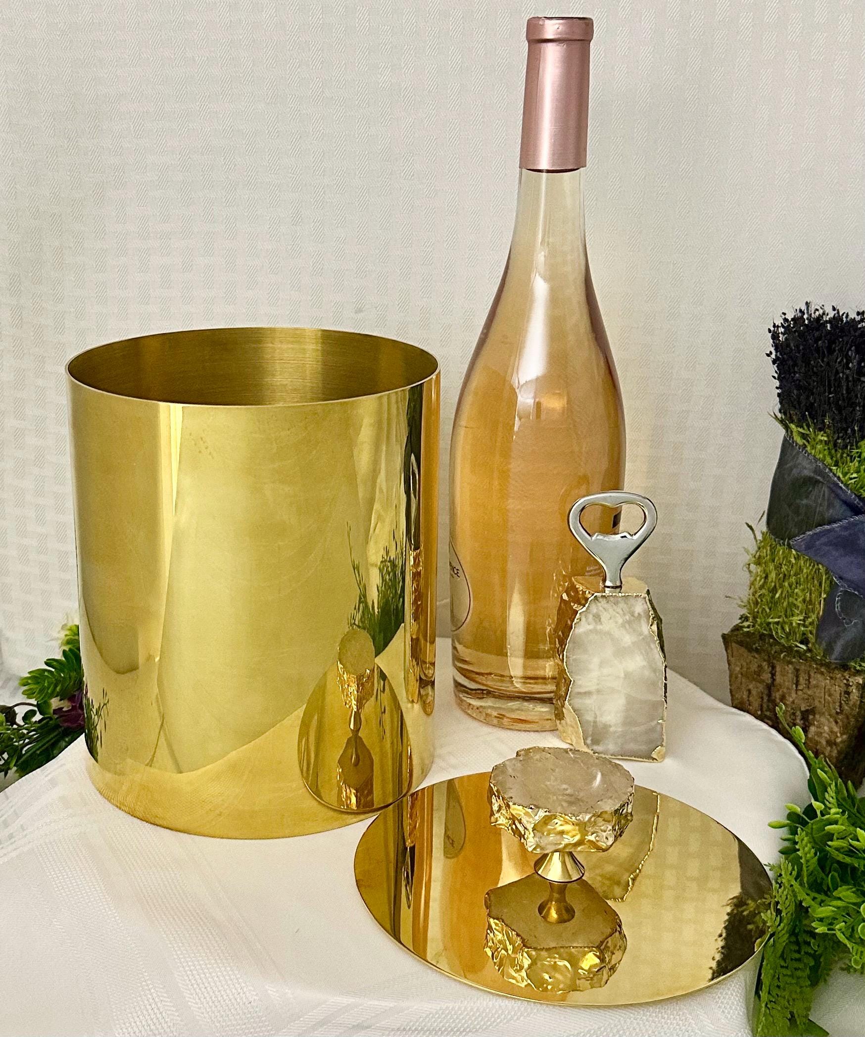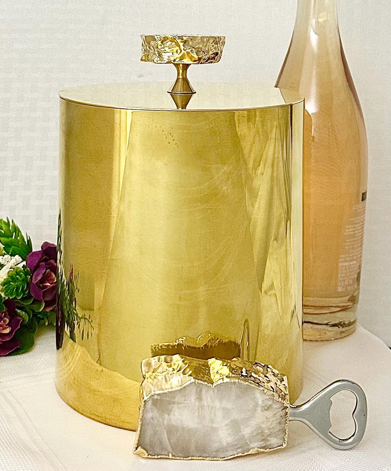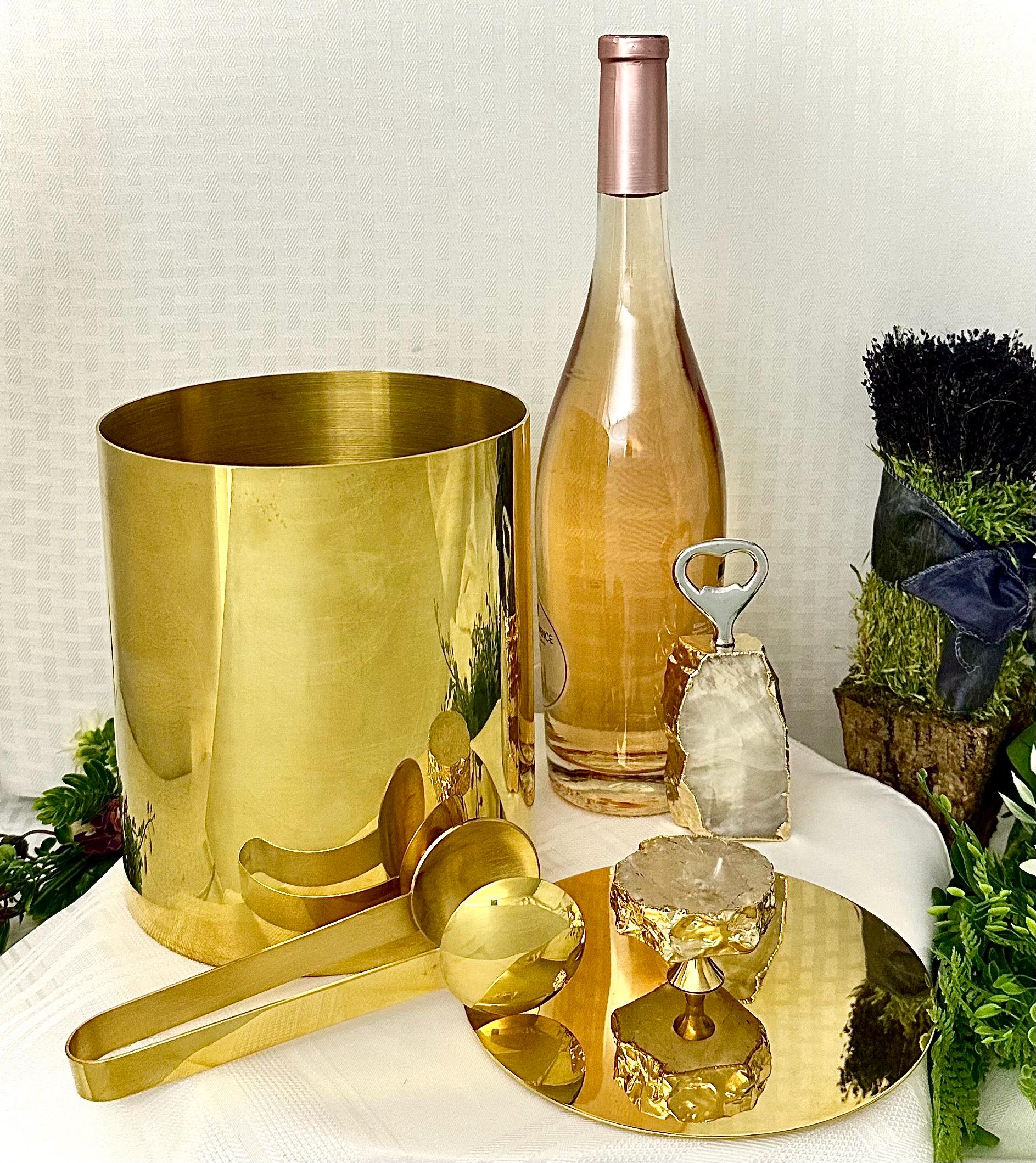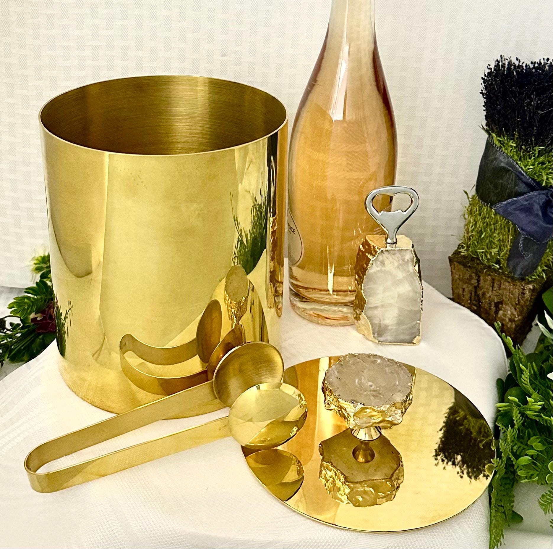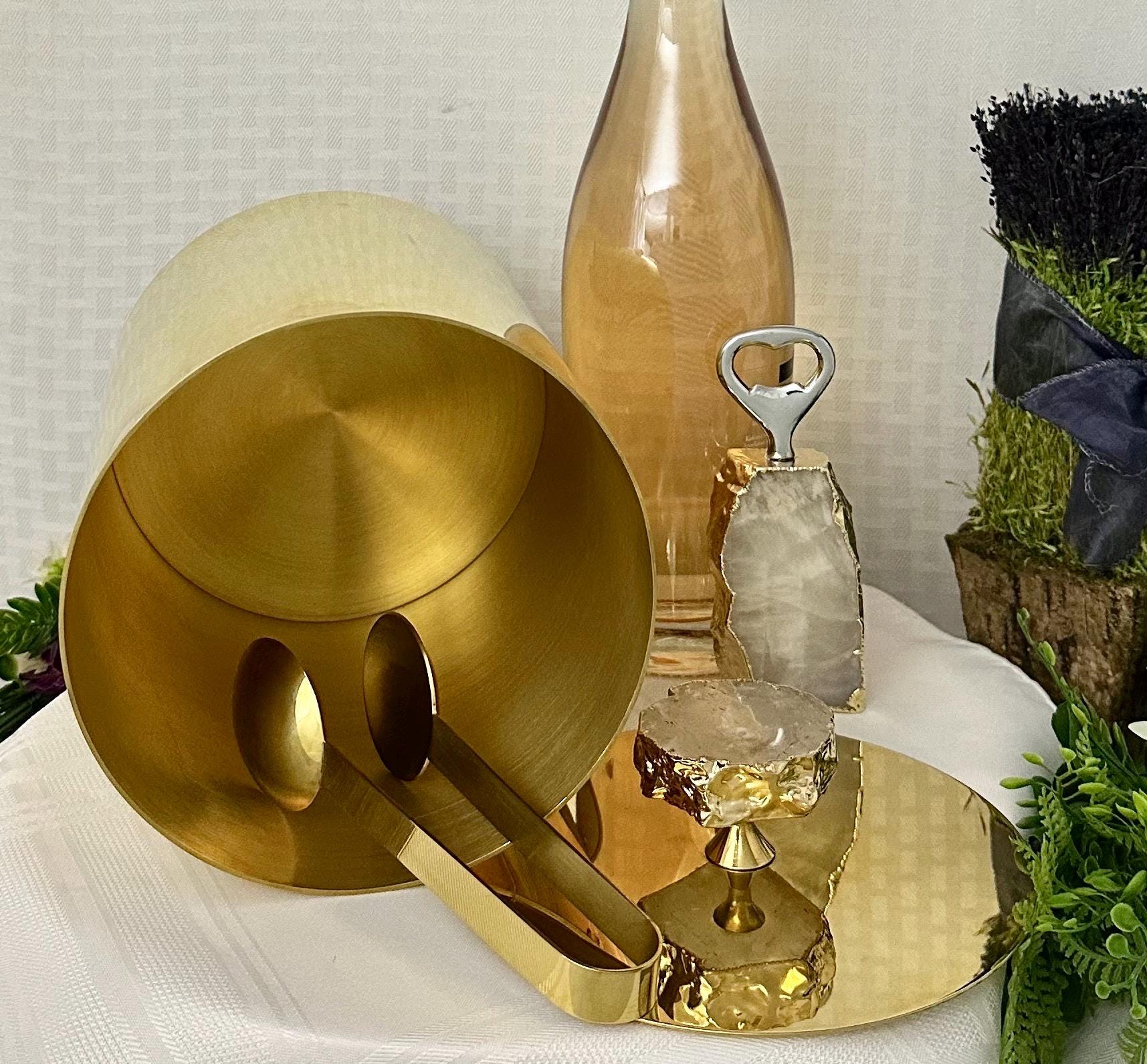 This set is a luxurious and stylish addition to any barware collection. Made with 24K gold plated metal, this set includes an ice bucket with a matching lid, bottle opener, and a pair of ice tongs with a natural gemstone knob. (Brazilian agate or crystal and electroplated with the gold on the edges.