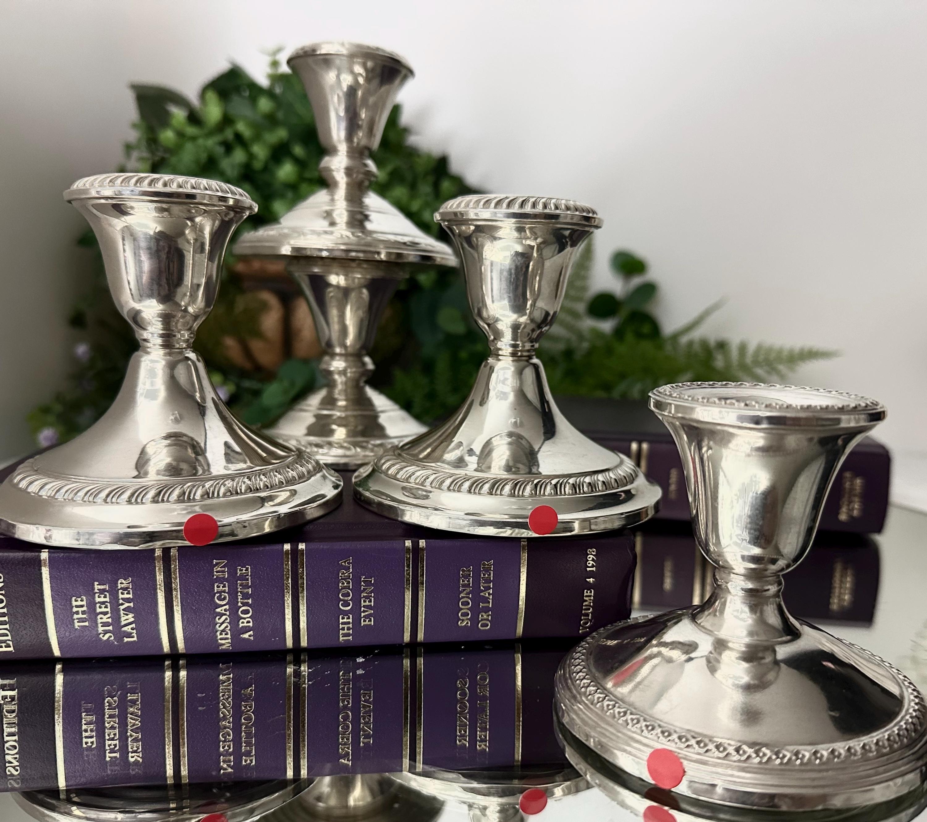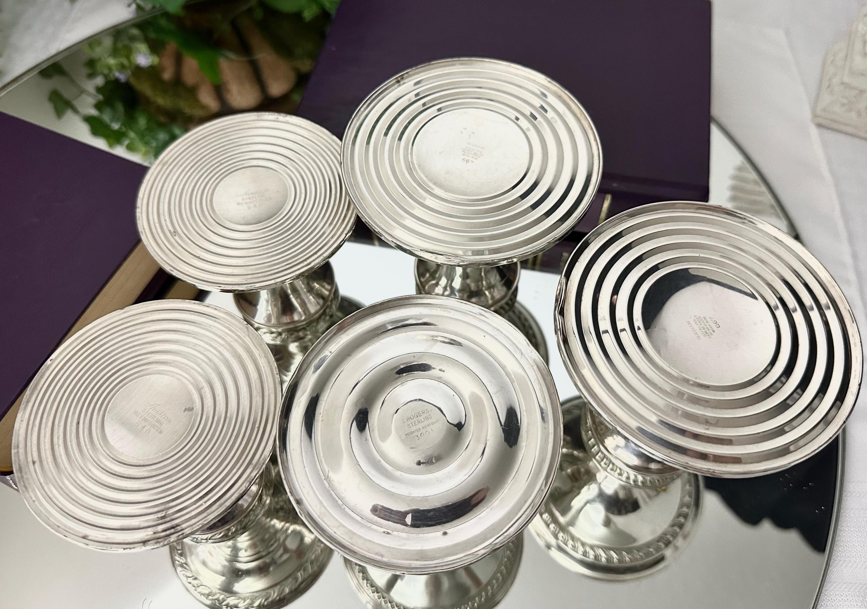 This is for a lovely set of 5 Sterling Silver console candle holders. All pieces are designed with an American Classic style. These are from various makers and Made in the United States. **There are some very small dents on the bases shown in the pictures with dots.