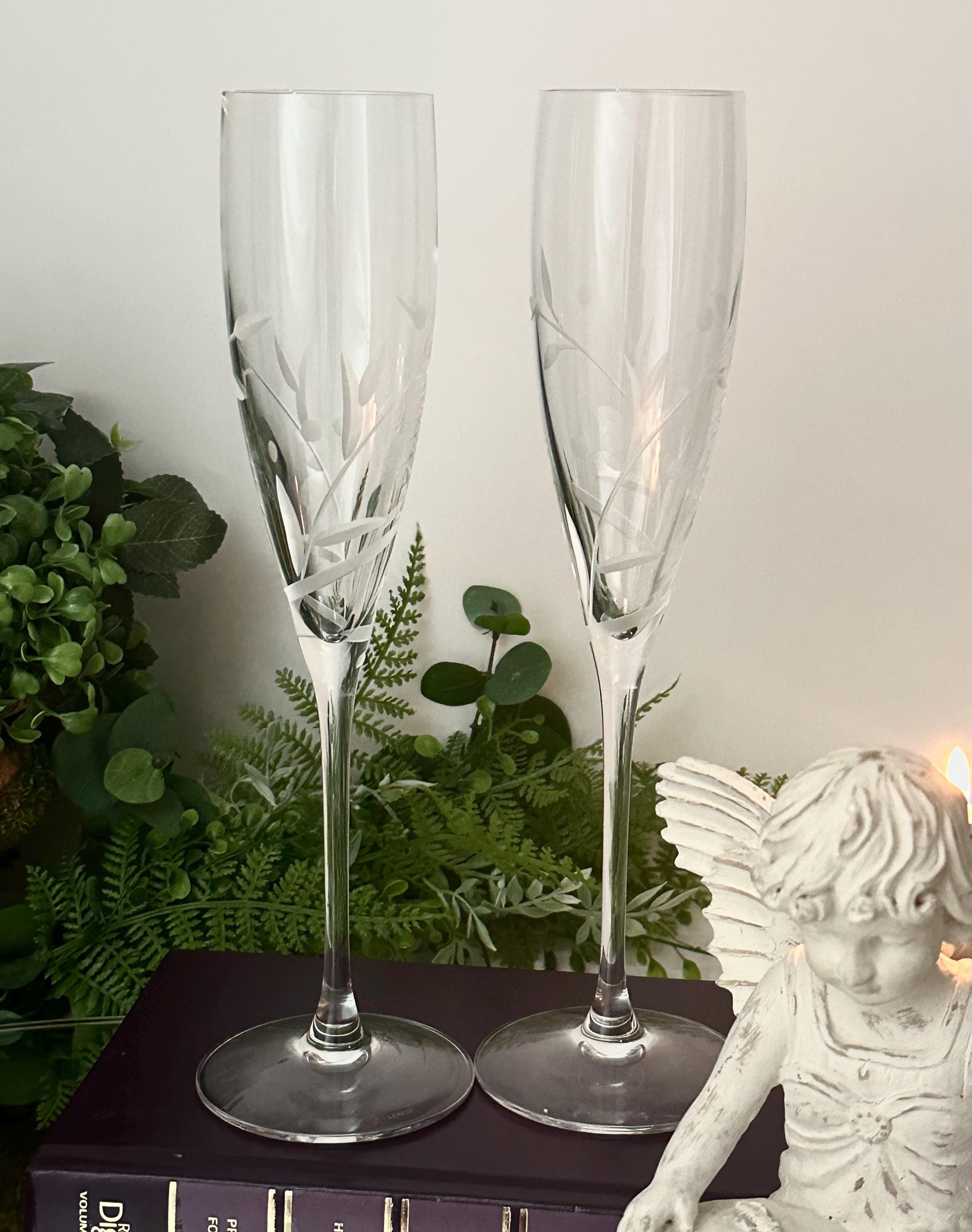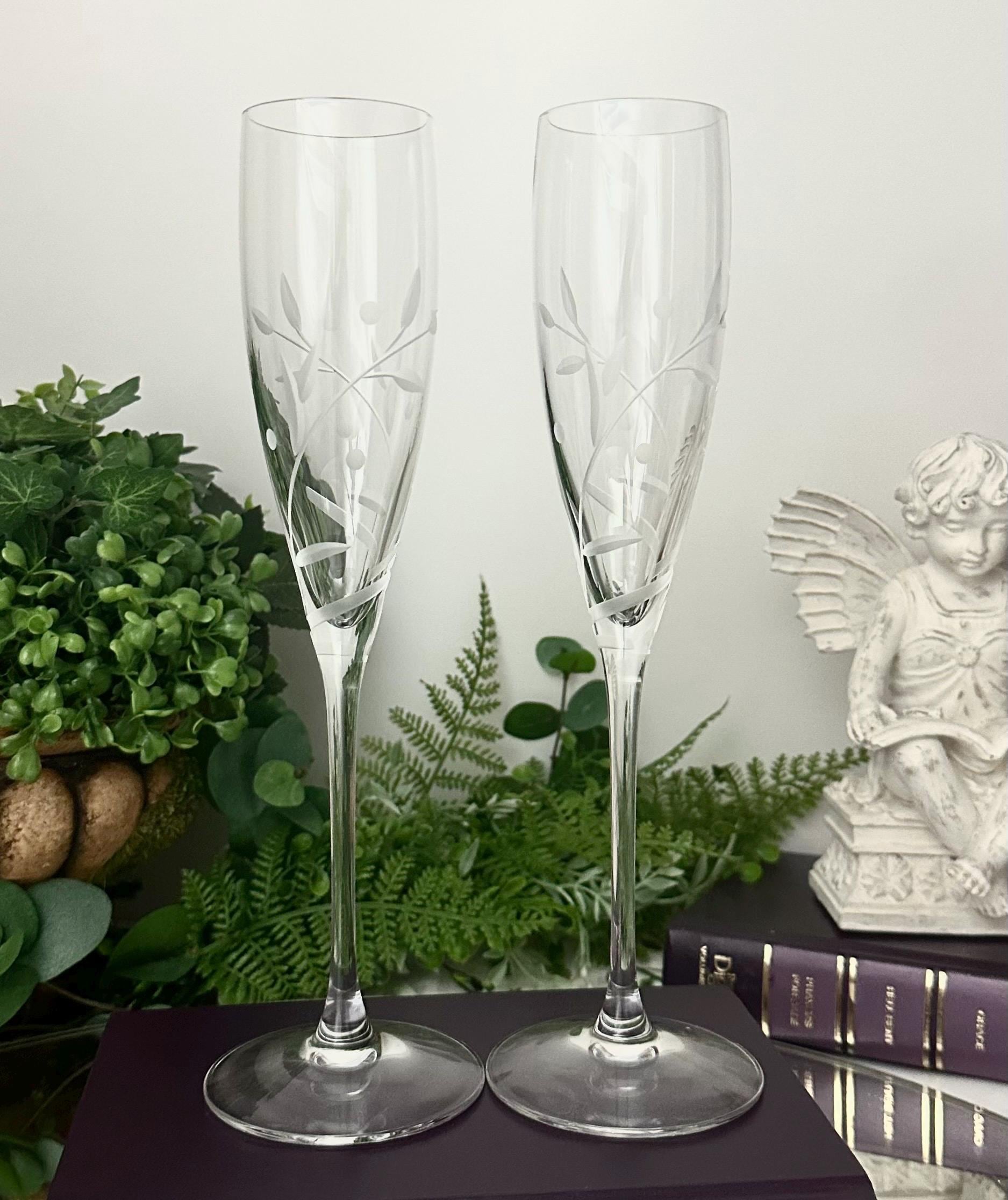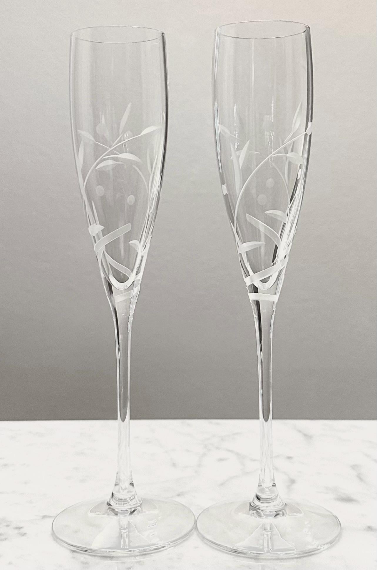 This is for 2 lovely Lenox Opal Innocence Champagne Flutes. These elegant and contemporary toasting glasses are perfect for weddings or any special occasion. Made of clear cut glass with a plant pattern and a round shape, these champagne flutes stand at 10 3/8 inches tall and have a 2-inch diameter.