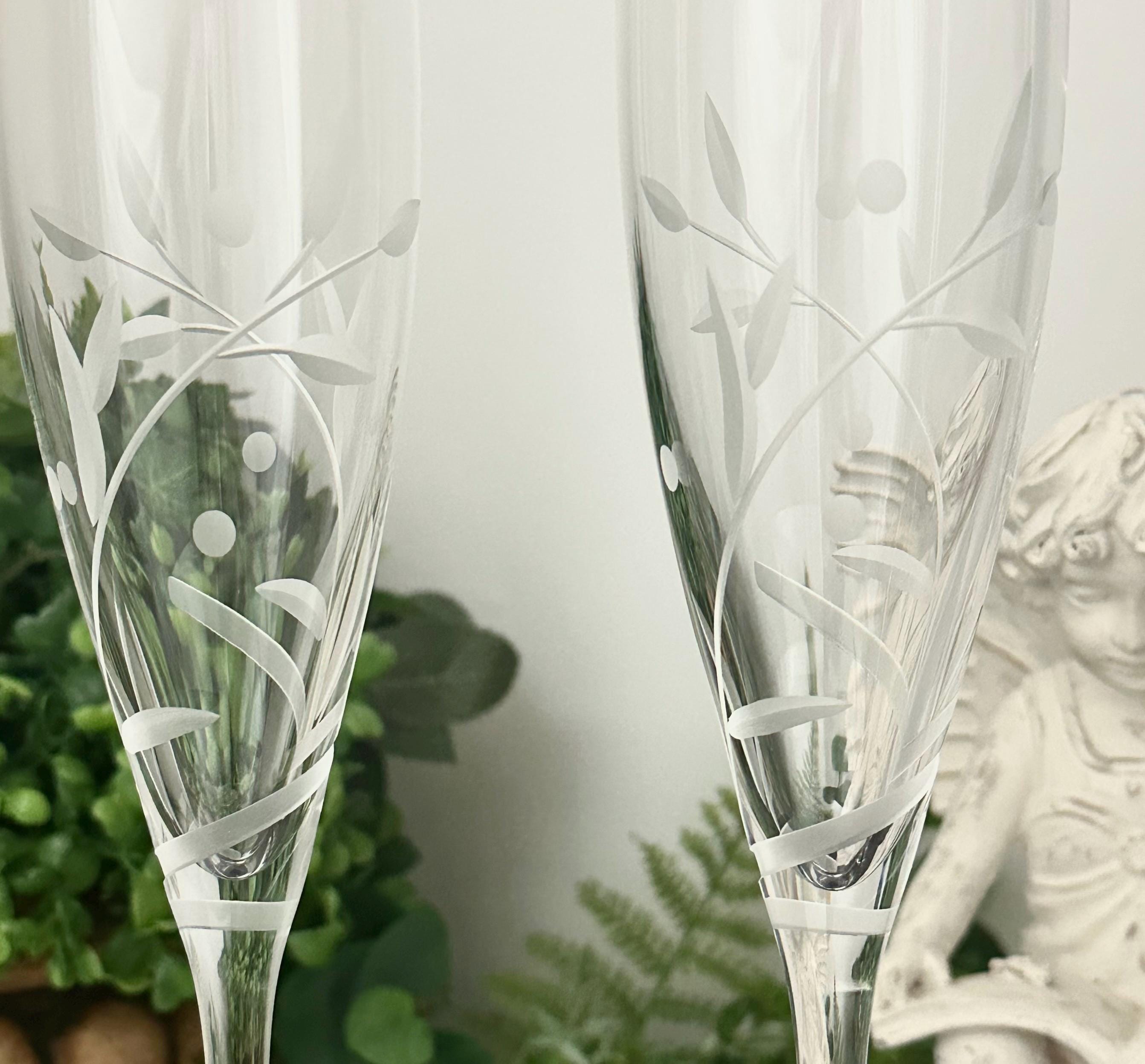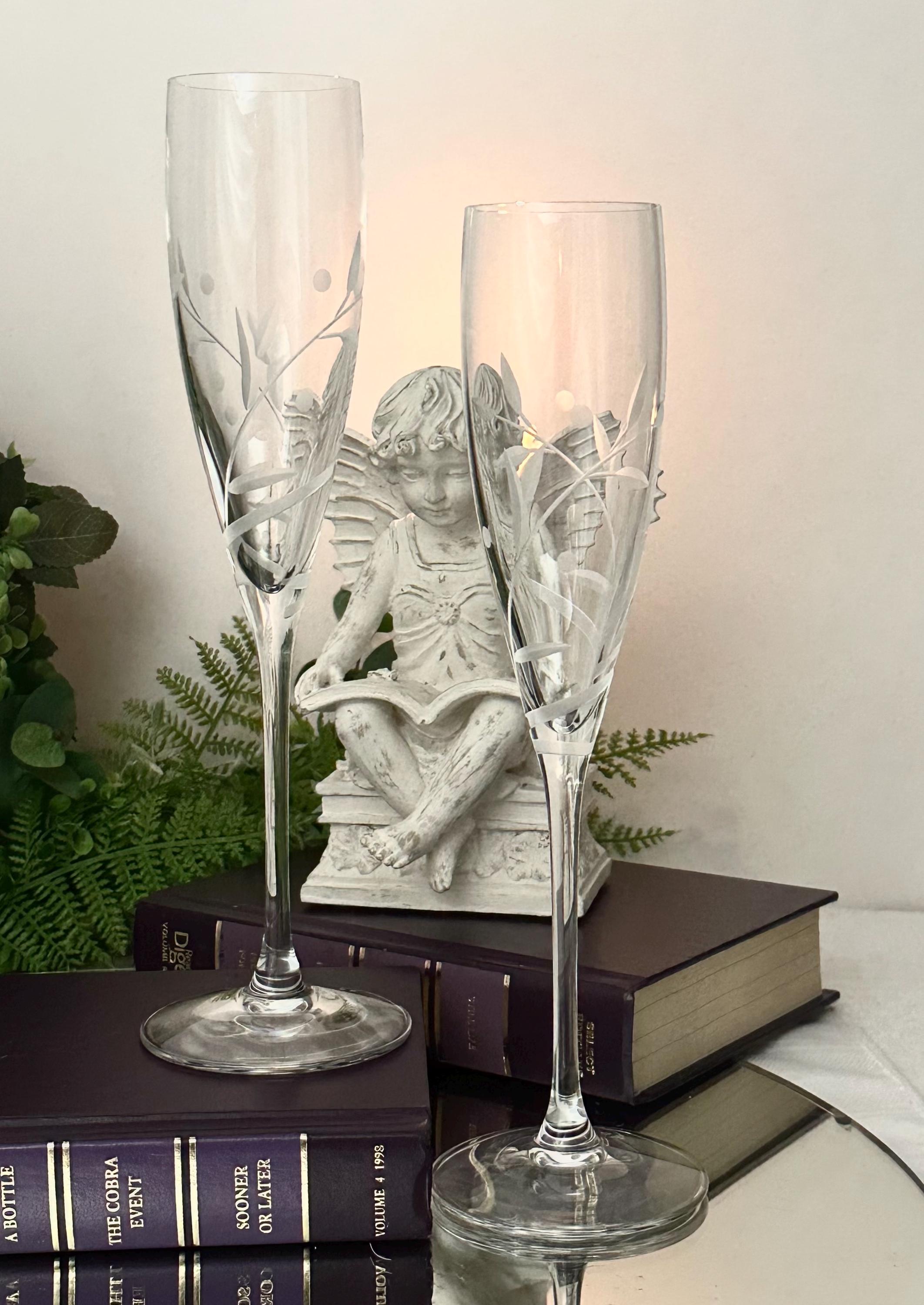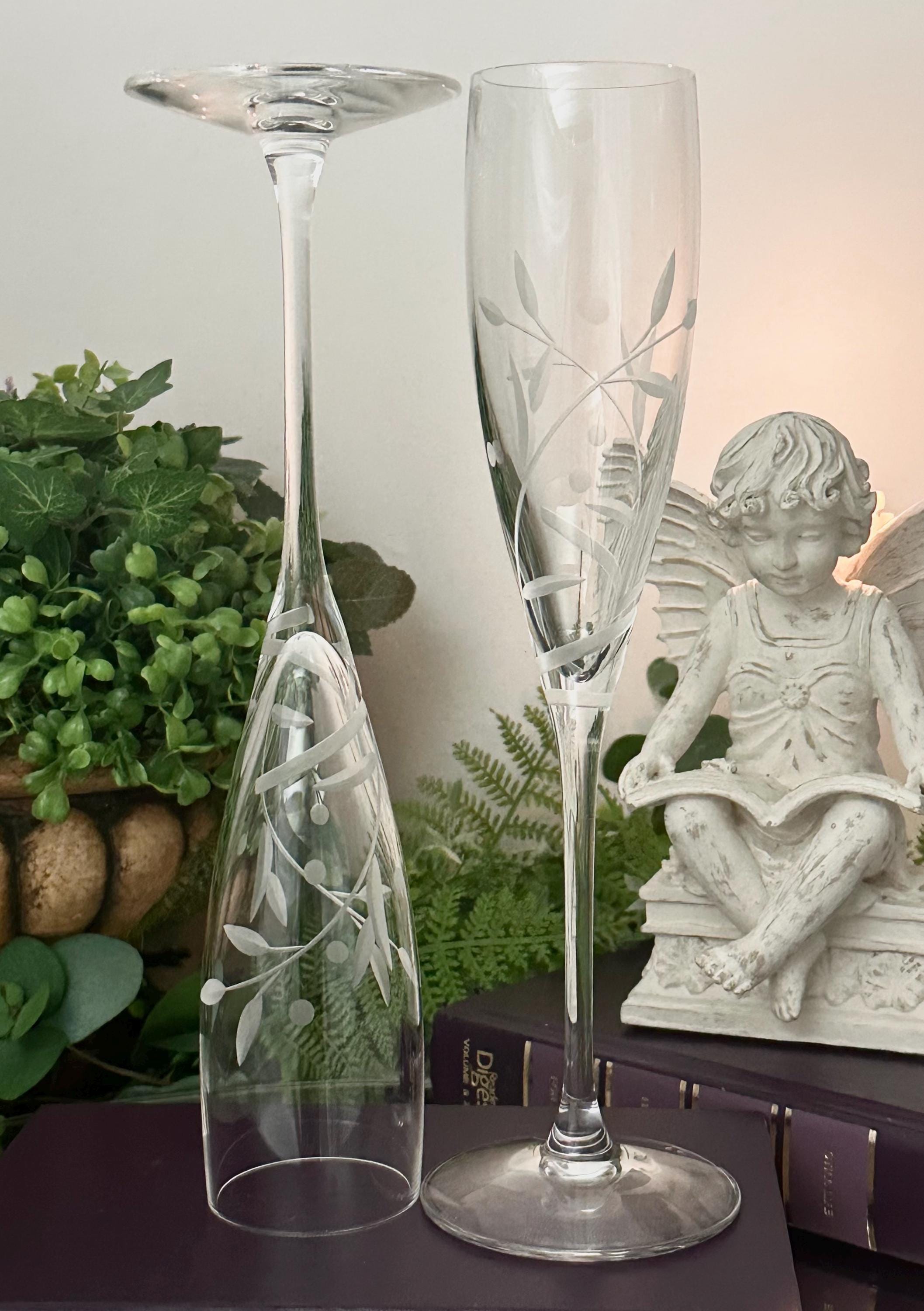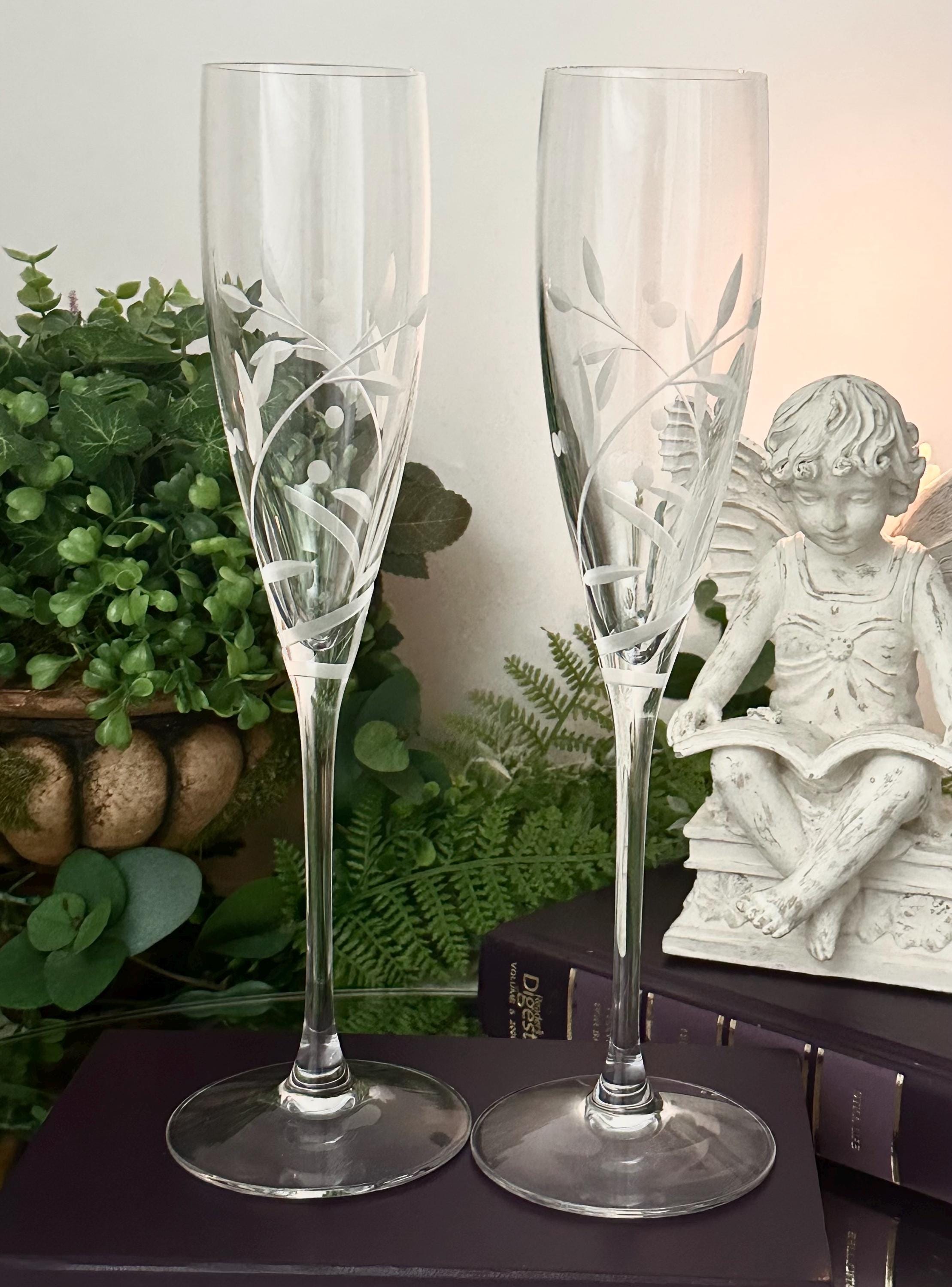 This is for 2 lovely Lenox Opal Innocence Champagne Flutes. These elegant and contemporary toasting glasses are perfect for weddings or any special occasion. Made of clear cut glass with a plant pattern and a round shape, these champagne flutes stand at 10 3/8 inches tall and have a 2-inch diameter.