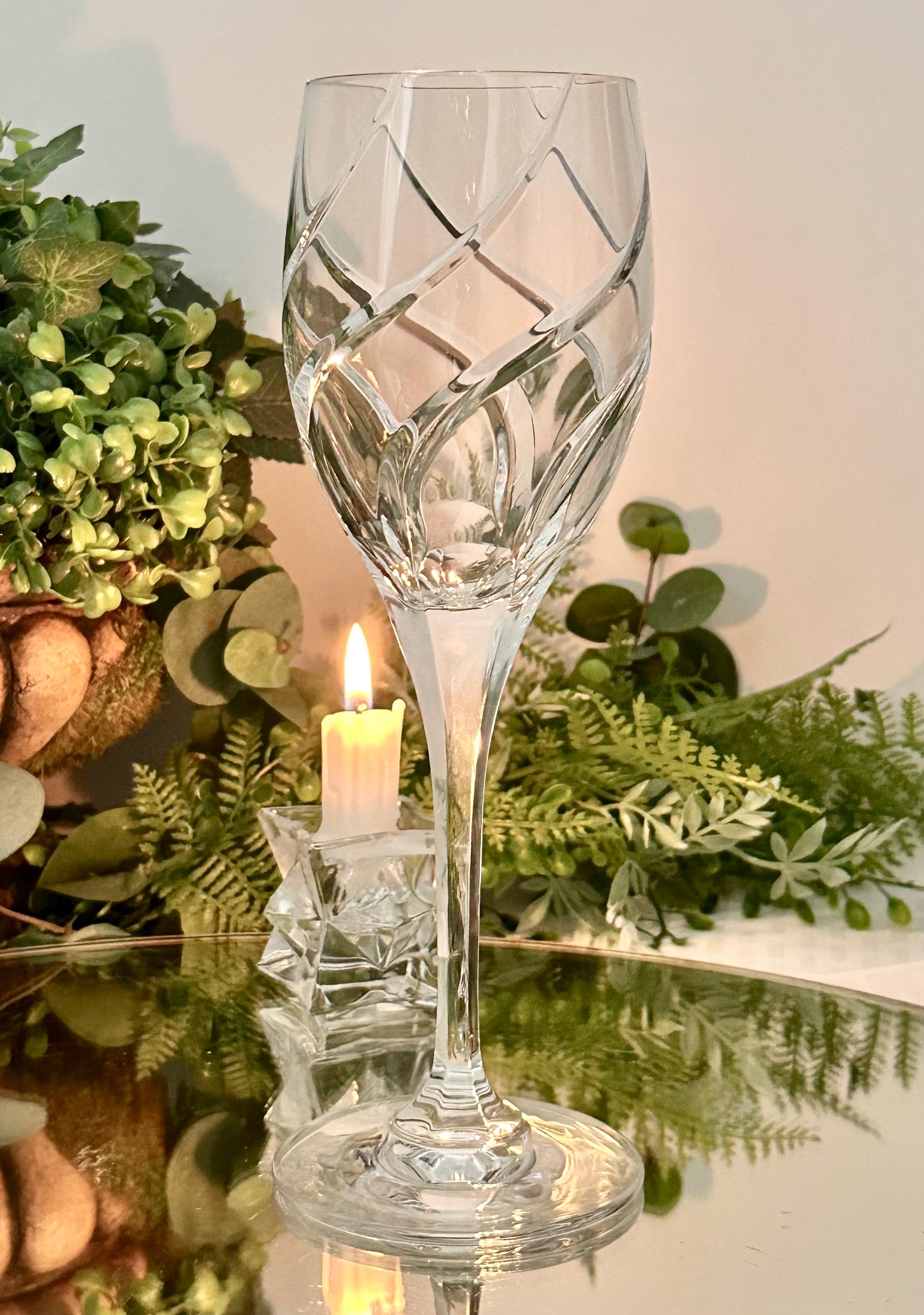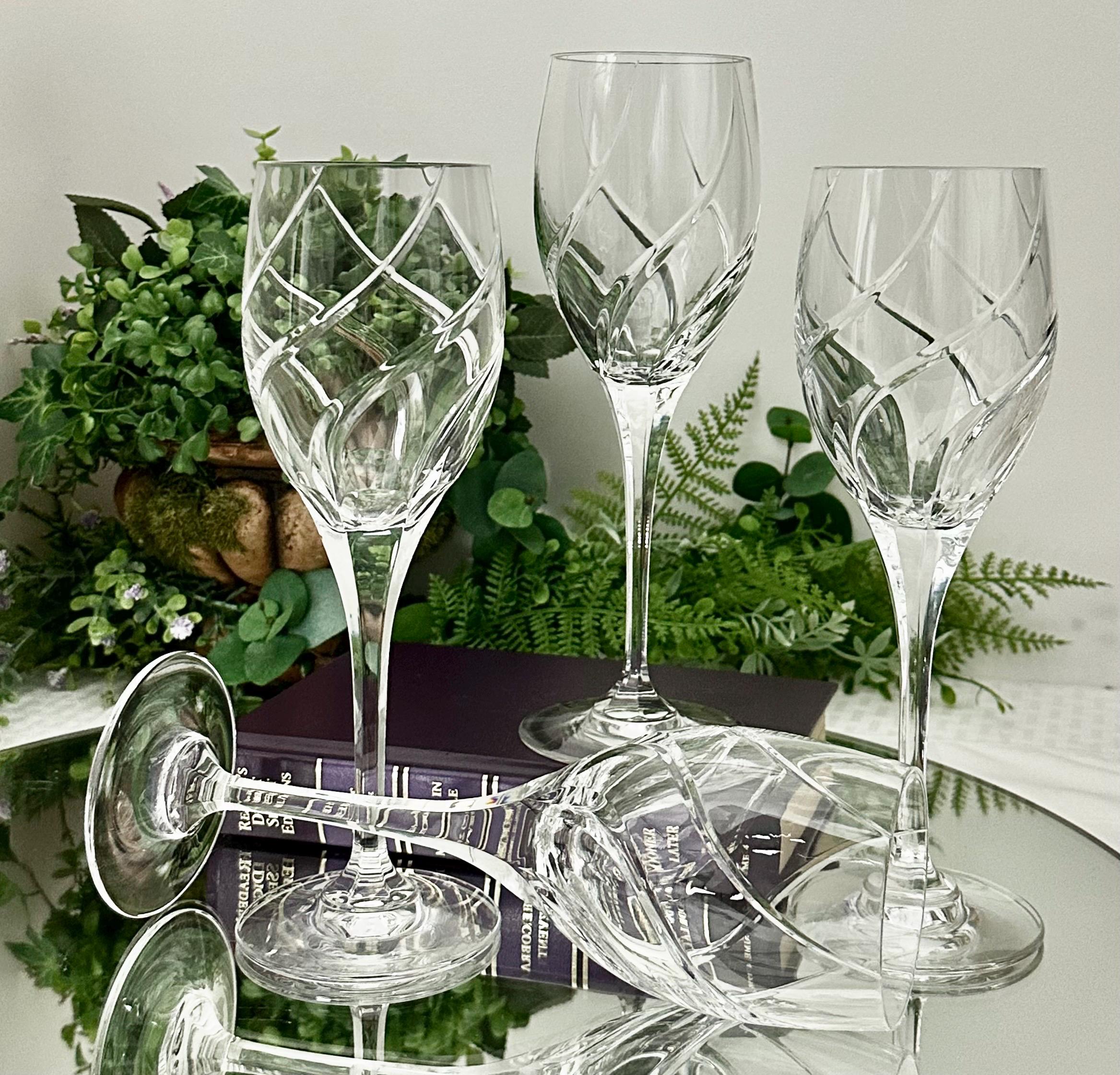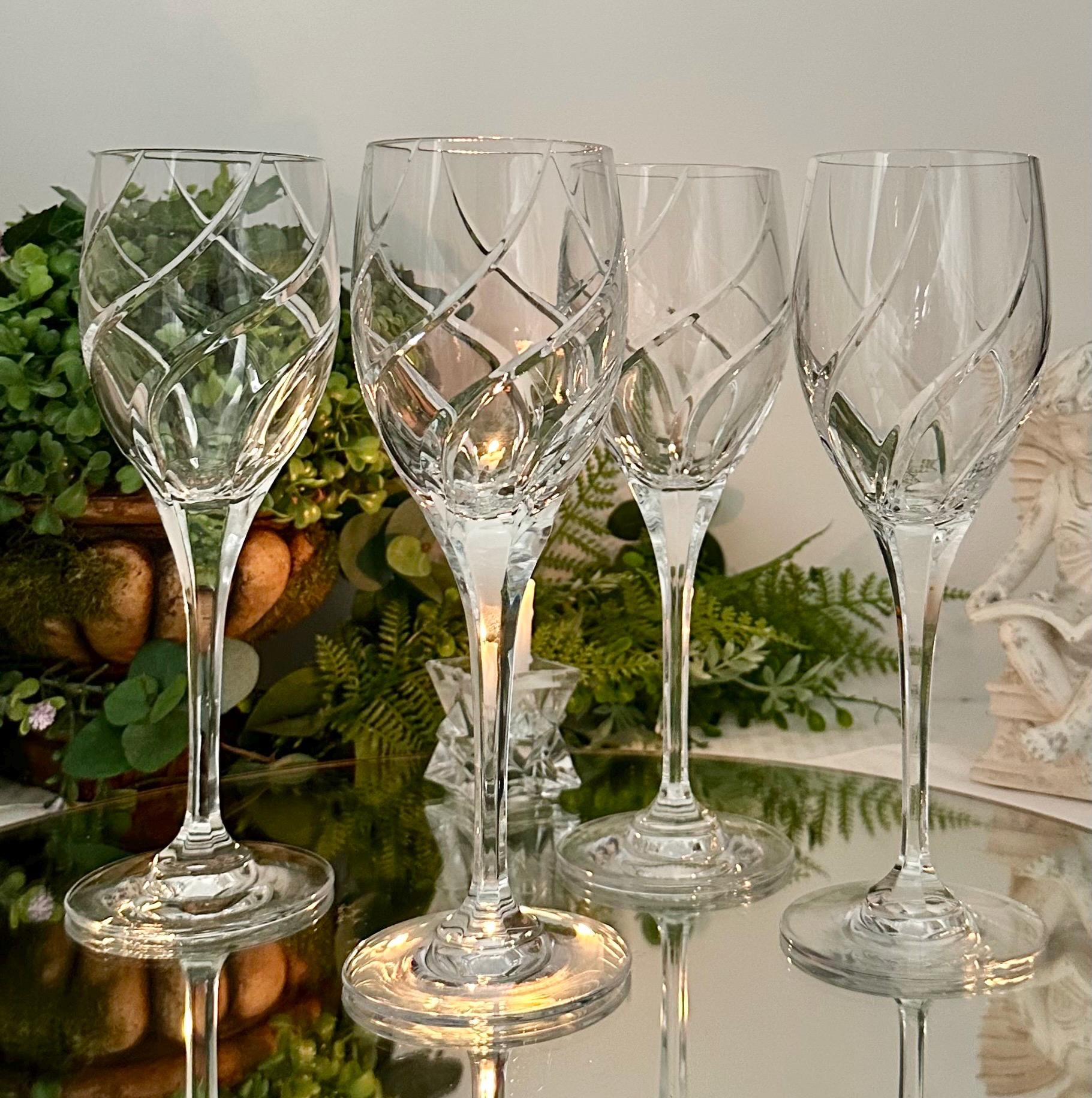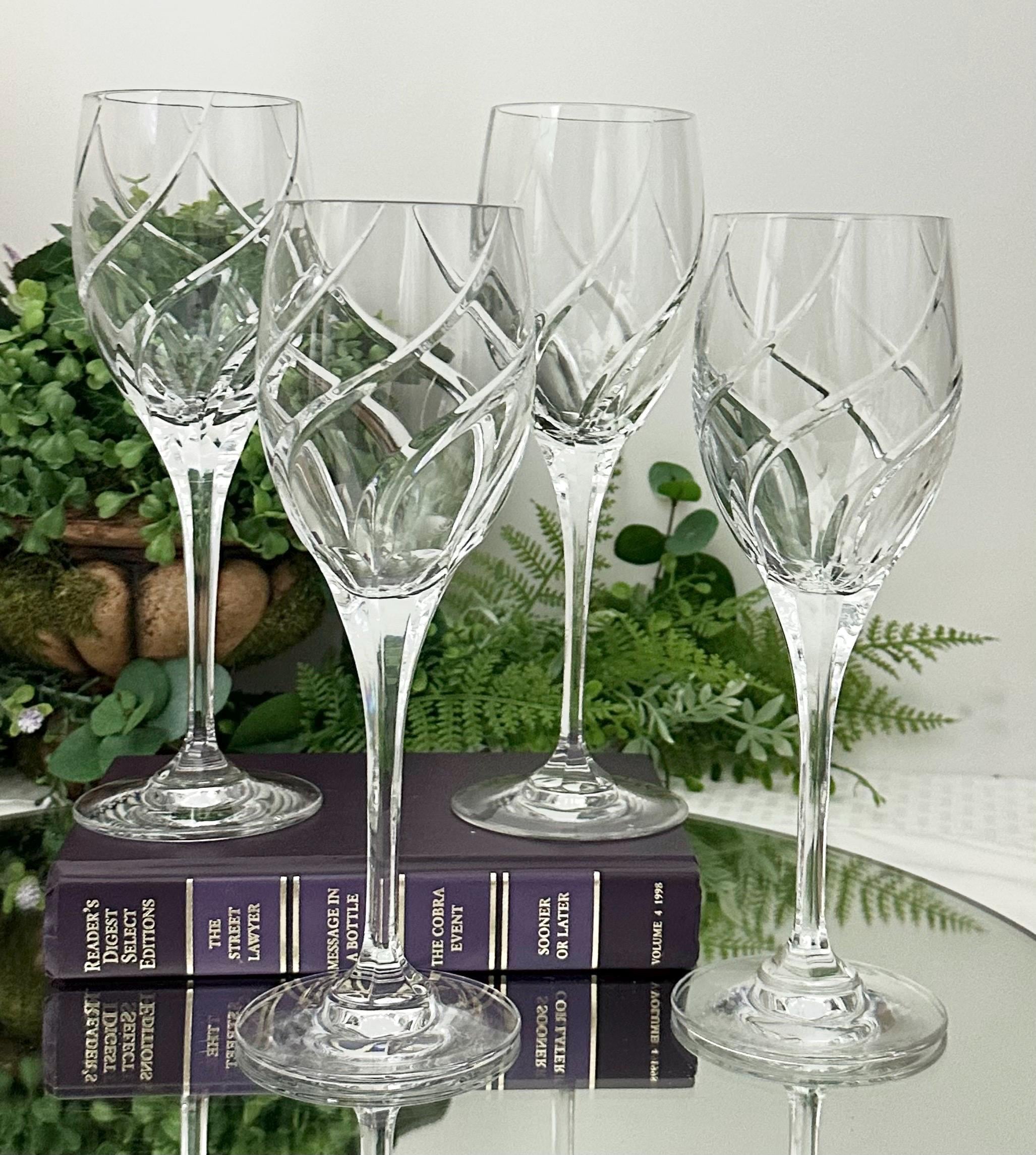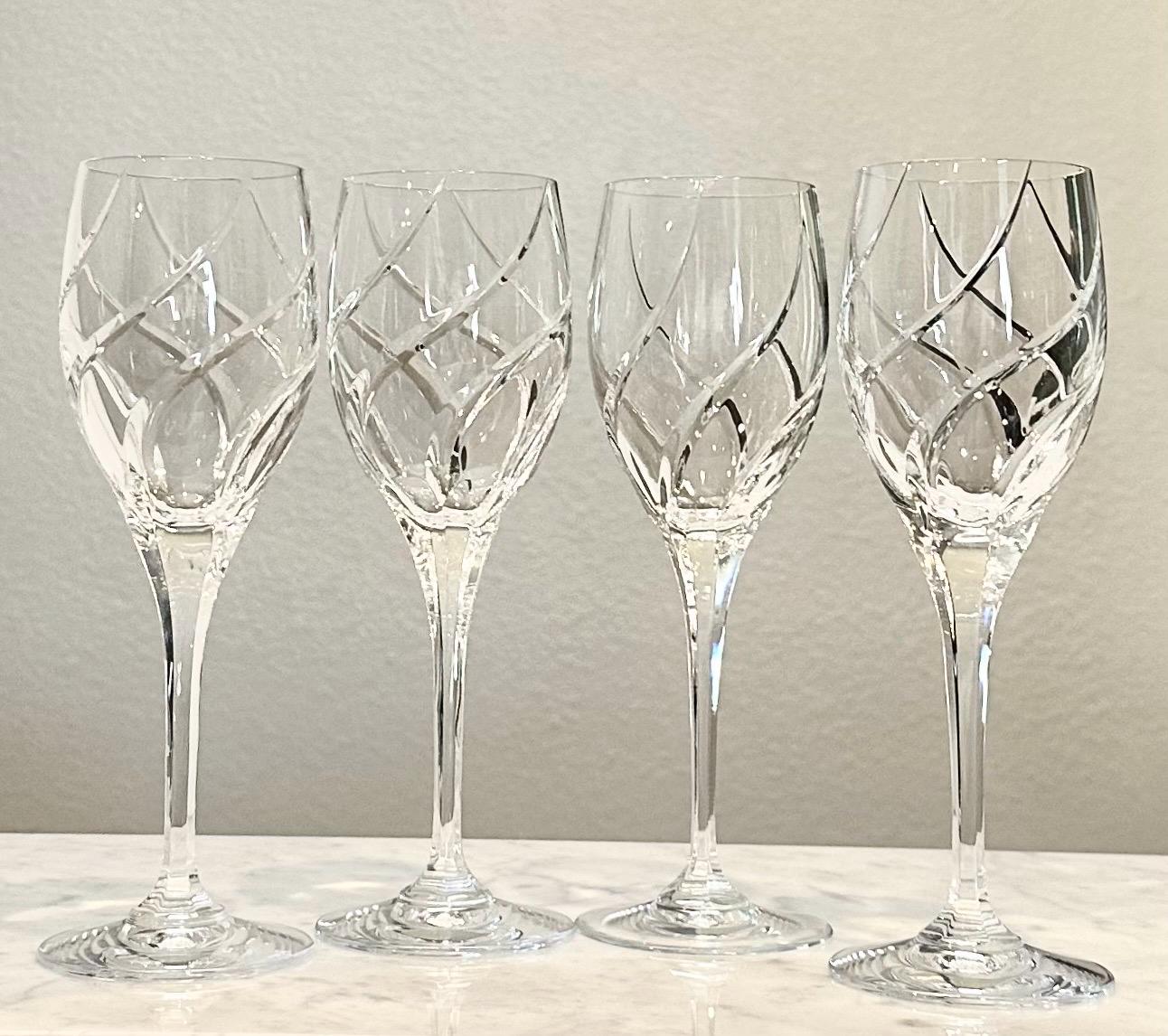 This is for a lovely Vintage set of 4 Mikasa Olympus Water Goblets that measure 9 inches tall x 2 5/8 inches in diameter. These are blown glass that was crafted in Slovenia from 1987 to 2019 and are now discontinued. These have beautiful full swirl cuts on the bowl with a multisided stem and very light reflective.