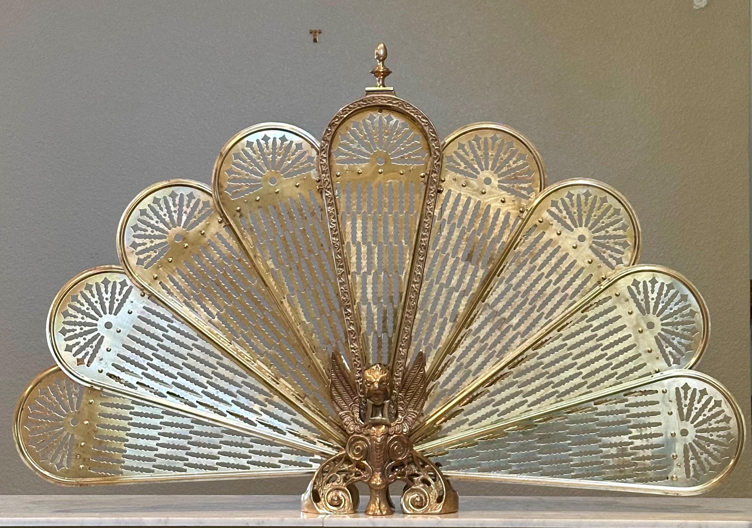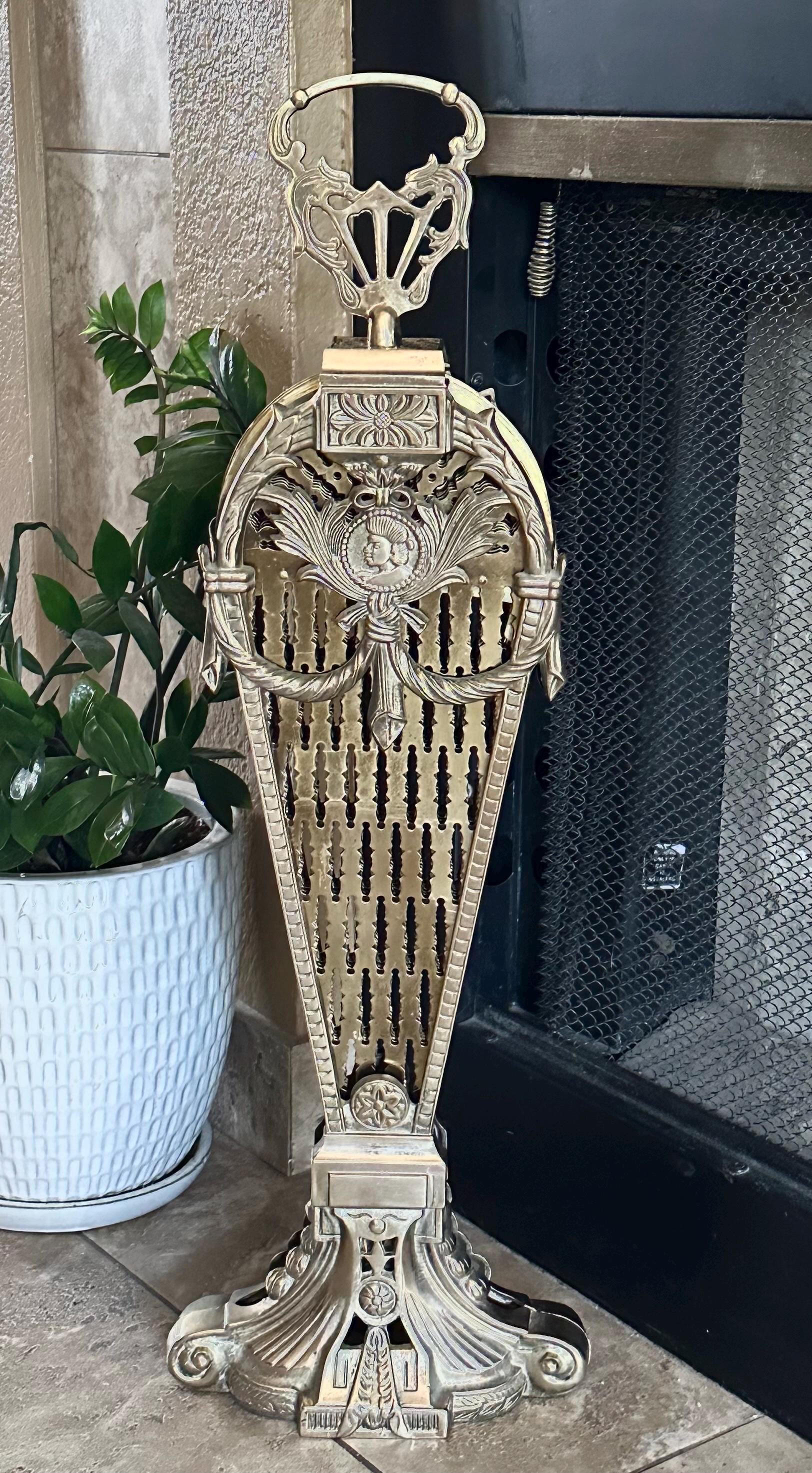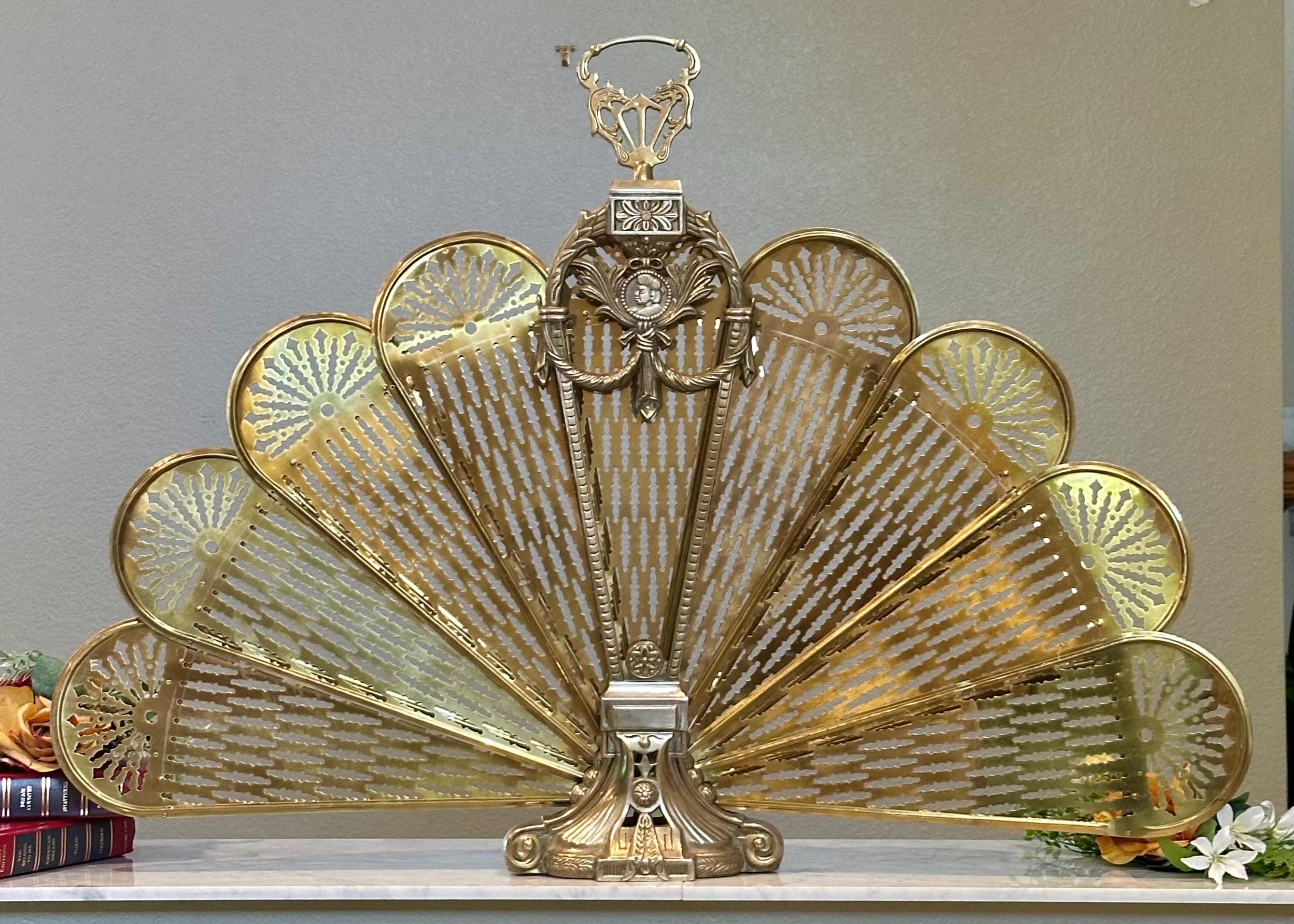 This is for a wonderful Vintage brass "peacock fan" fireplace screen. It looks lovely open and yet still very decorative when sitting closed. This lovely piece has an ornate design and is two sided with a Vintage style Cameo Face mounted on the front with a raised motif. It also is adorned with a Finial/handle in a dragon motif on the top for carrying it.