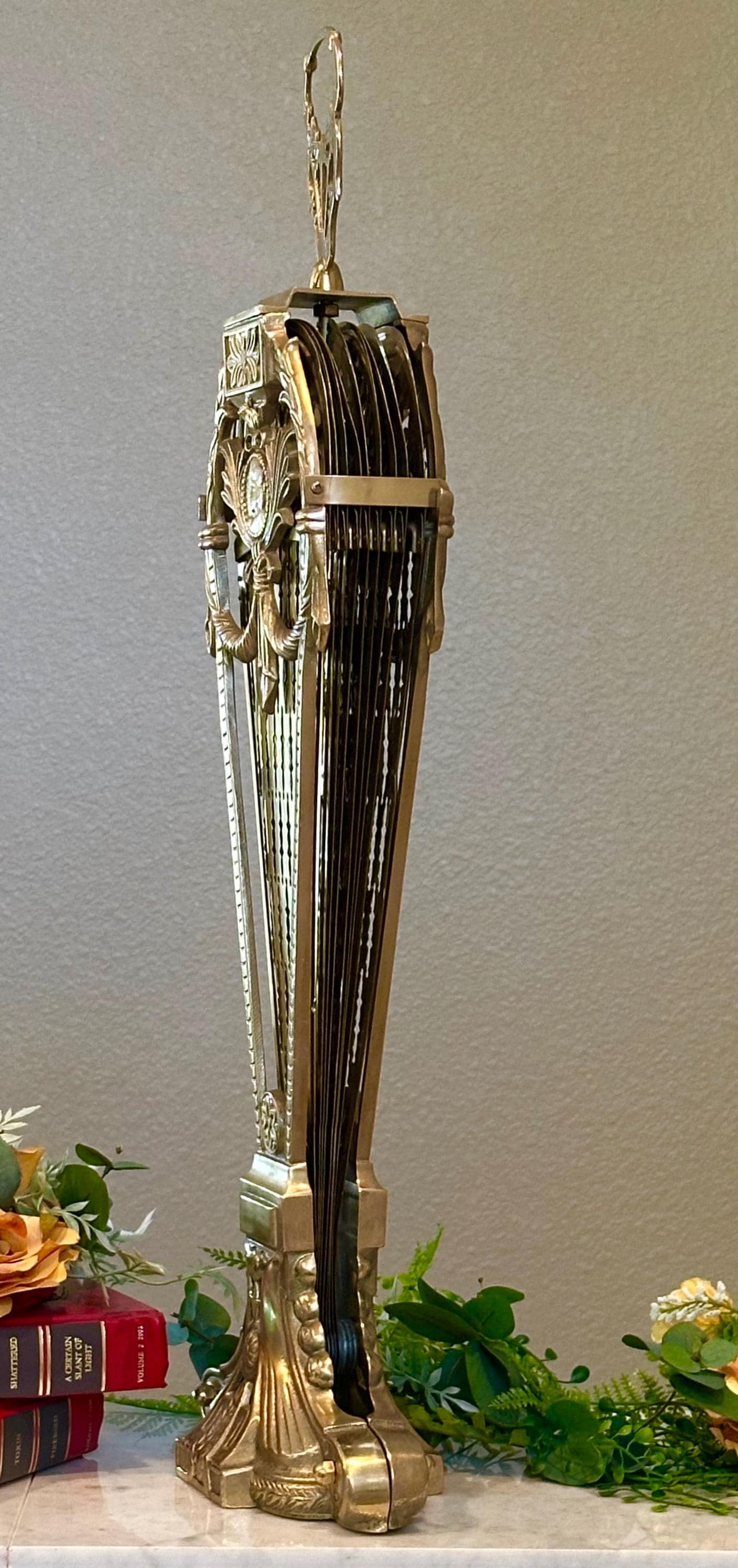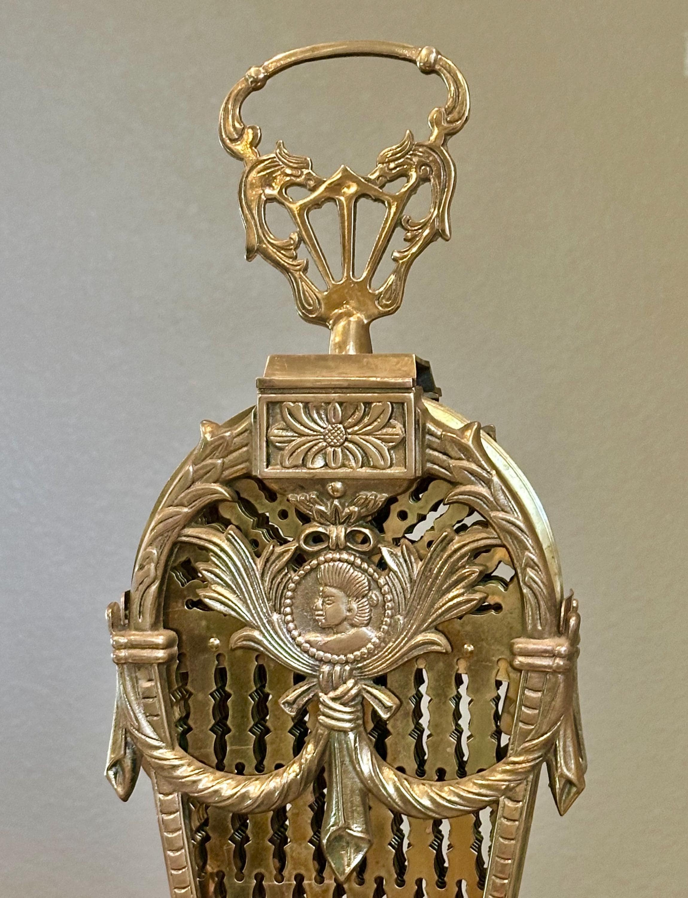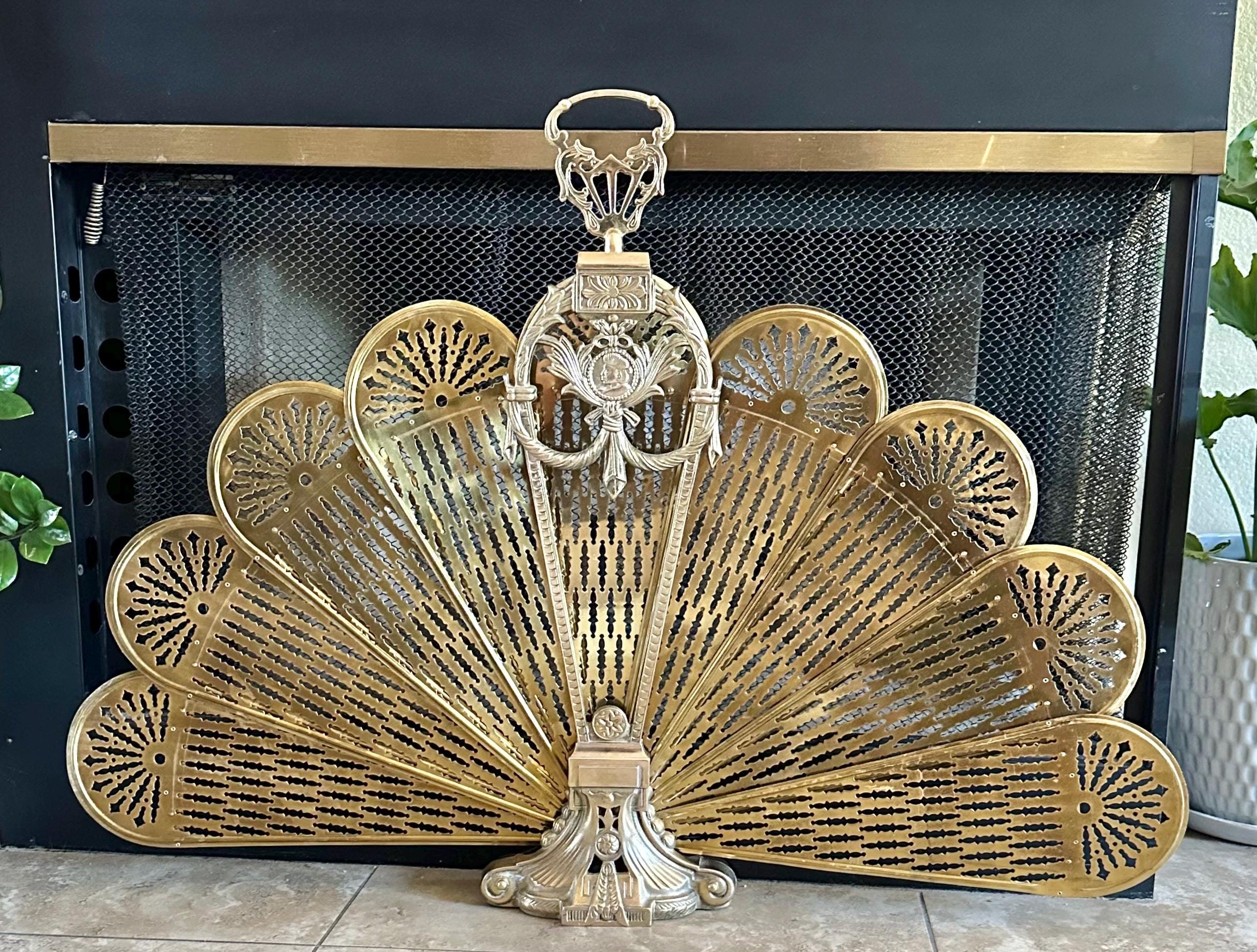 This is for a wonderful Vintage brass "peacock fan" fireplace screen. It looks lovely open and yet still very decorative when sitting closed. This lovely piece has an ornate design and is two sided with a Vintage style Cameo Face mounted on the front with a raised motif. It also is adorned with a Finial/handle in a dragon motif on the top for carrying it.