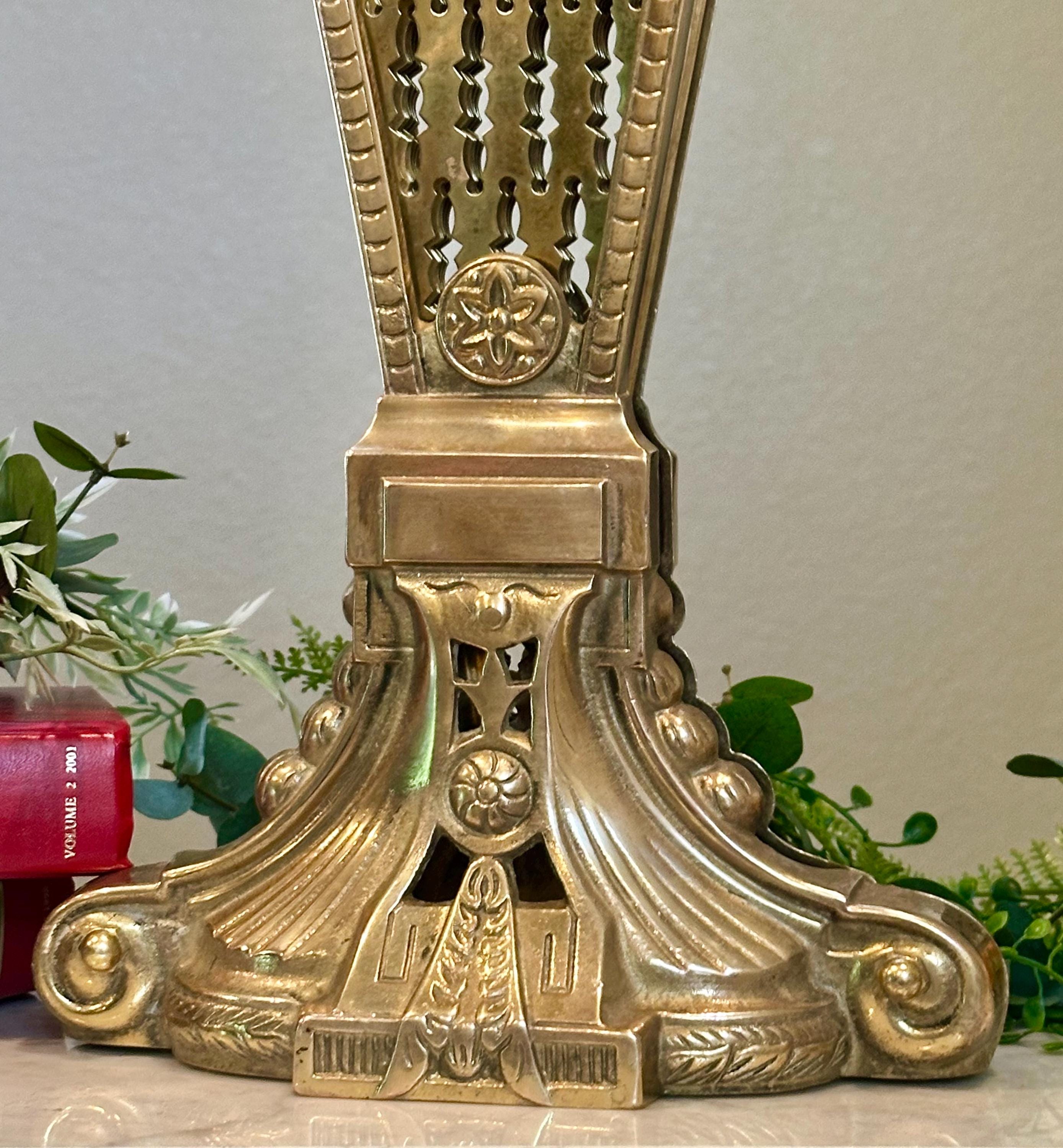 The fireplace fan has an Art Deco, Neoclassical, Hollywood Regency feel to the design. The total height with the handle is 27 inches tall and the fan when open has a width of 38 inches. While the base is 4 inches deep.