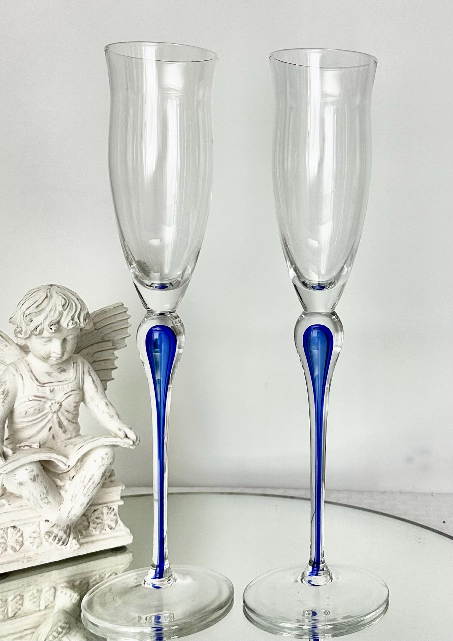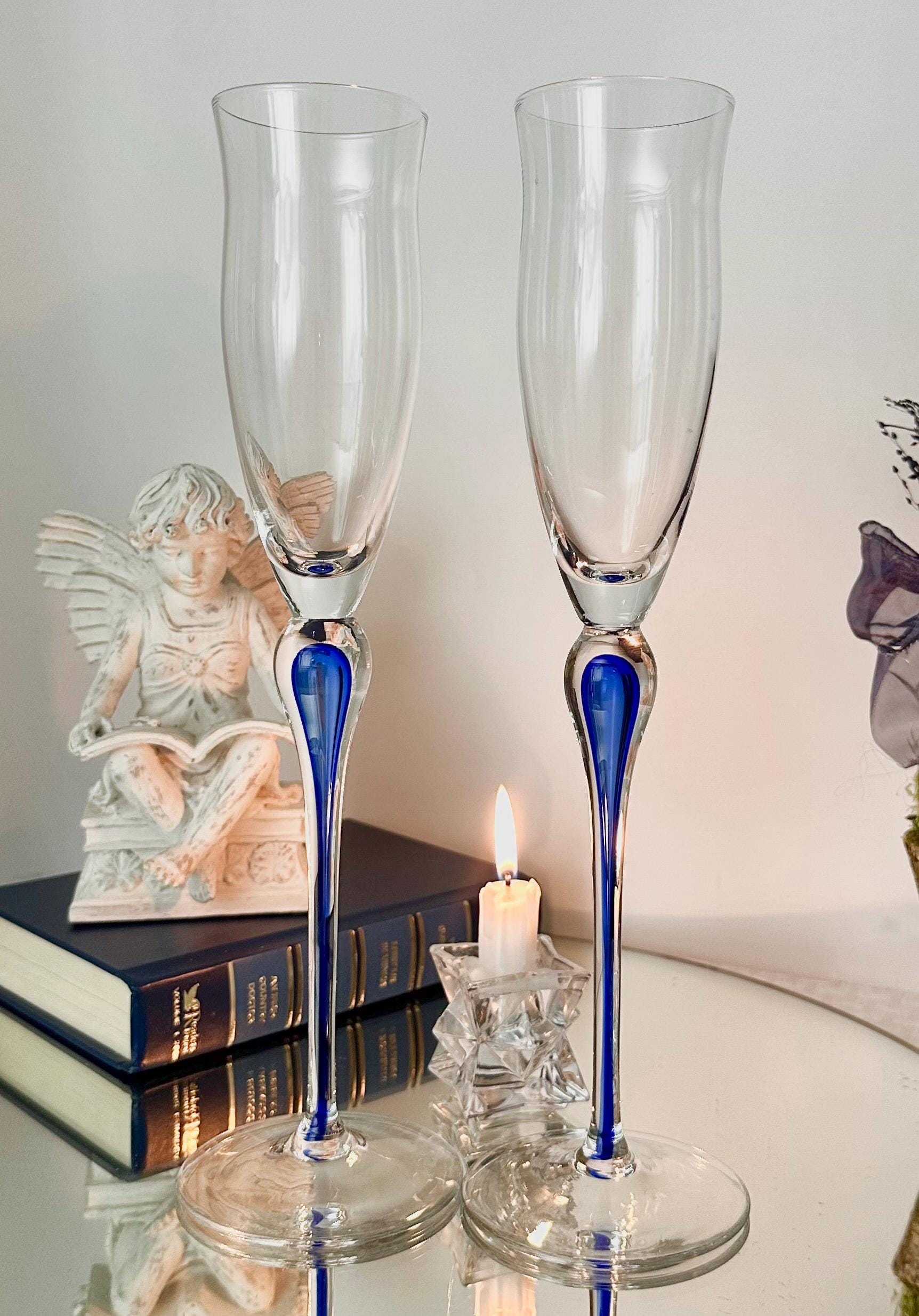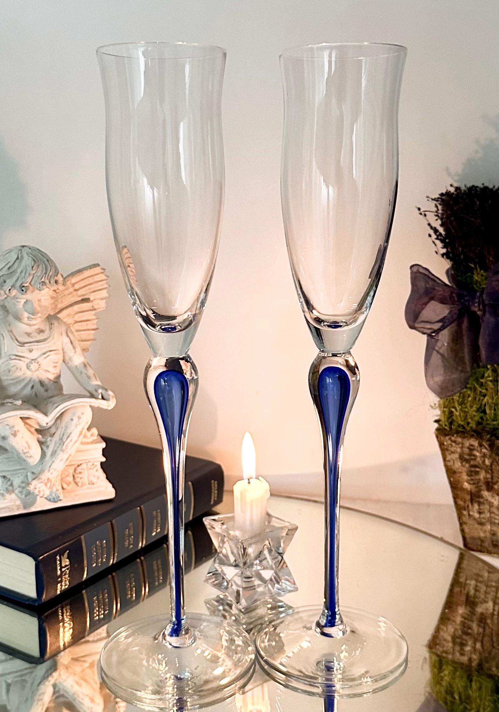 This is for 2 Champagne Flutes from Mikasa in the Julliard pattern with a Cobalt Blue tear drop Stem. These vintage champagne glasses exudes elegance and sophistication with its unique design.