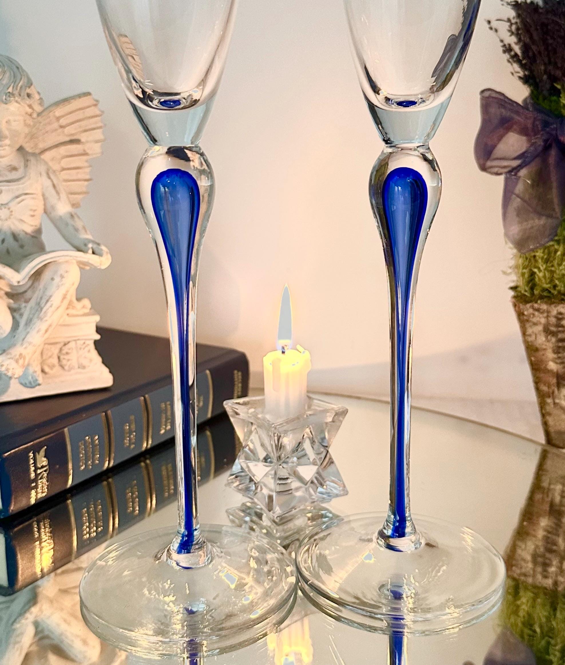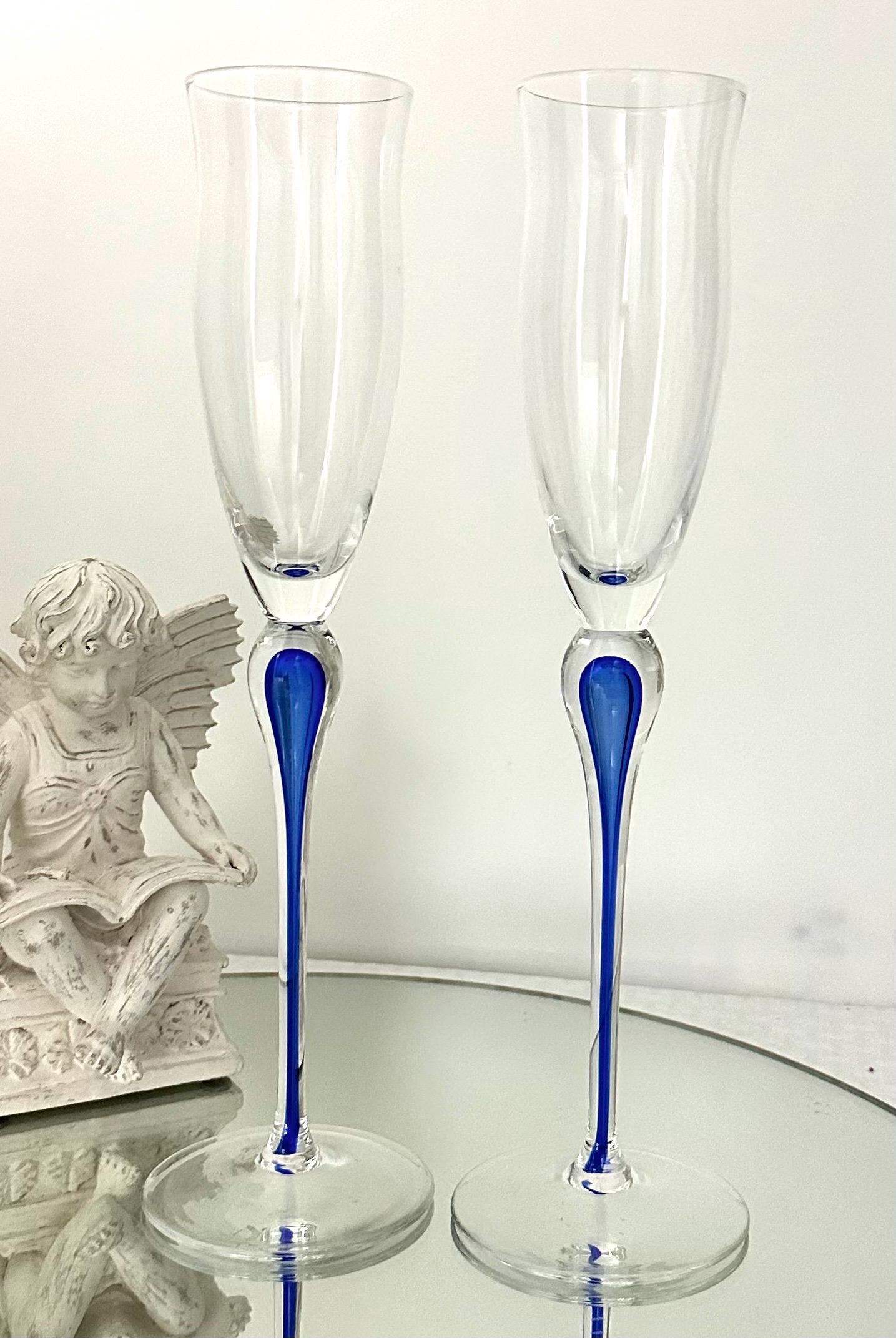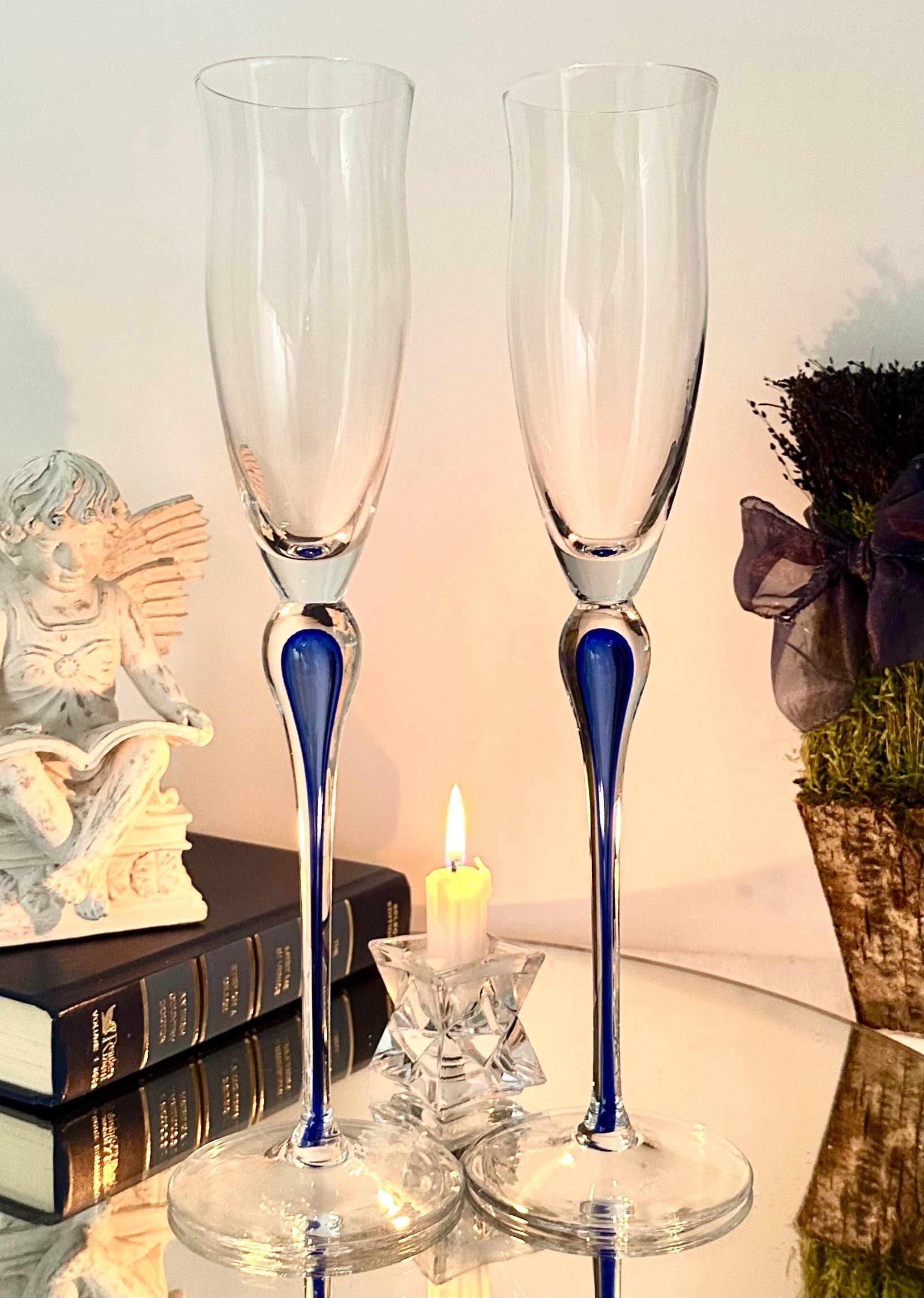 This is for 2 Champagne Flutes from Mikasa in the Julliard pattern with a Cobalt Blue tear drop Stem. These vintage champagne glasses exudes elegance and sophistication with its unique design.