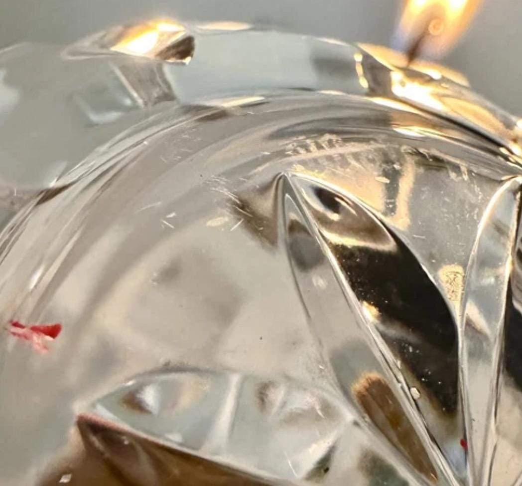 The Waterford name is on the foot of the perfume bottle. There is a small red fleck of some kind accidentally fuzed in the glass near the name. This vanity tray would have originally come with a glass perfume bottle from the Marquis line.