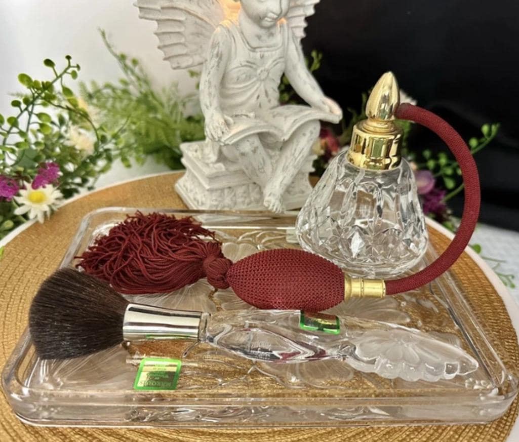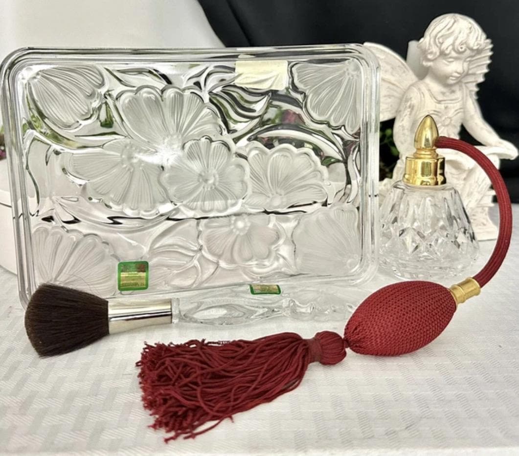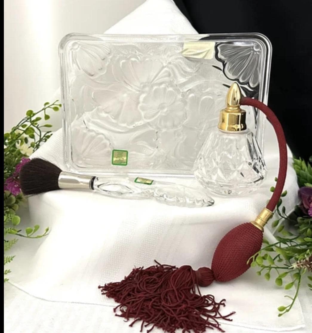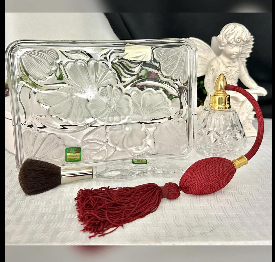 This is for a vintage Waterford Crystal floral Marquis Vanity tray. The Tray measures: 8.5 inches wide X 6 inches deep X .75 inches tall. Sitting on the tray there is the Waterford Marquis brush which measures: 7.5 inches long x 1.25 inches wide. These are then paired with a Waterford traditional Lismore perfume bottle with a maroon tassel Atomizer pump that measures: 4.25 inches tall with a 3 inch diameter.