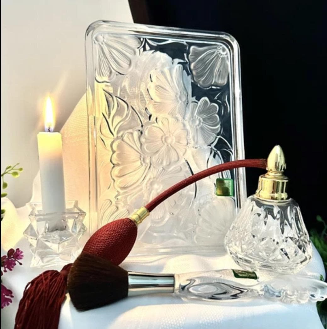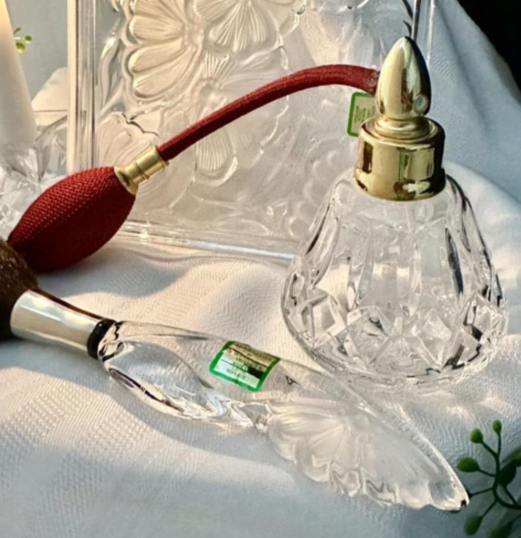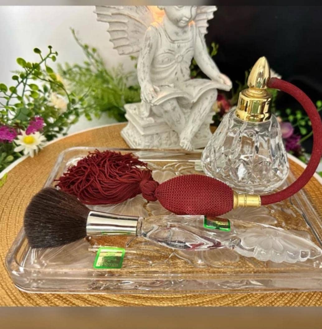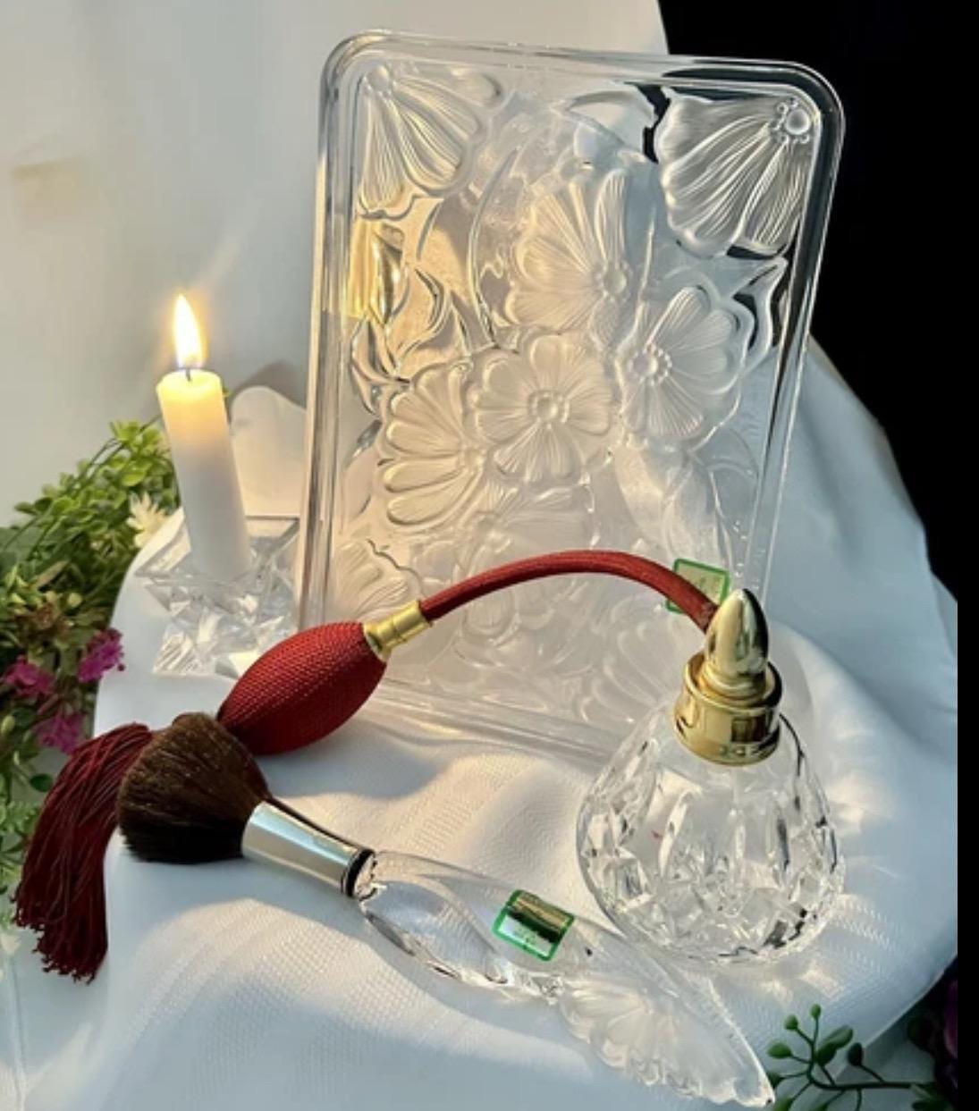 This is for a vintage Waterford Crystal floral Marquis Vanity tray. The Tray measures: 8.5 inches wide X 6 inches deep X .75 inches tall. Sitting on the tray there is the Waterford Marquis brush which measures: 7.5 inches long x 1.25 inches wide. These are then paired with a Waterford traditional Lismore perfume bottle with a maroon tassel Atomizer pump that measures: 4.25 inches tall with a 3 inch diameter.