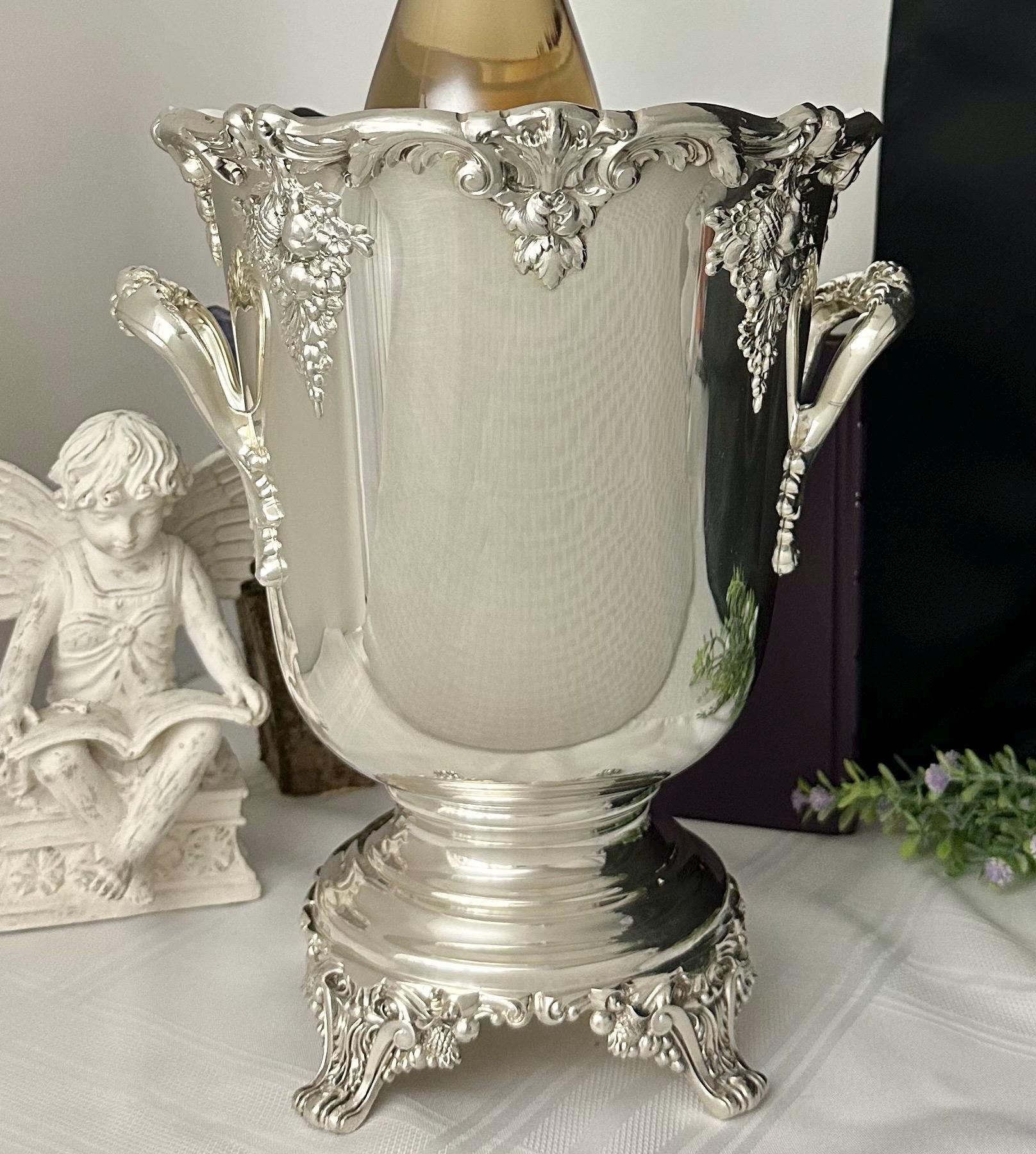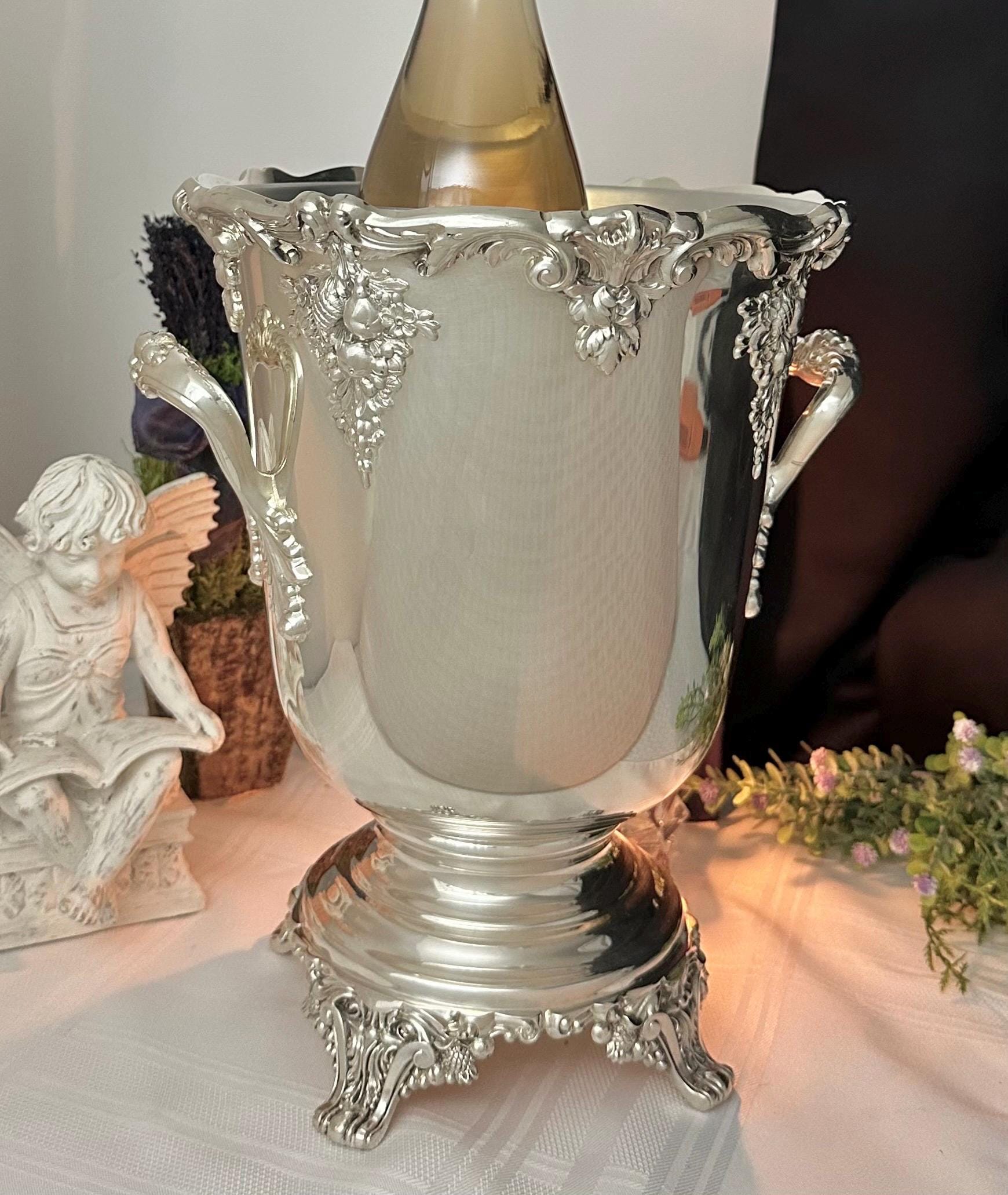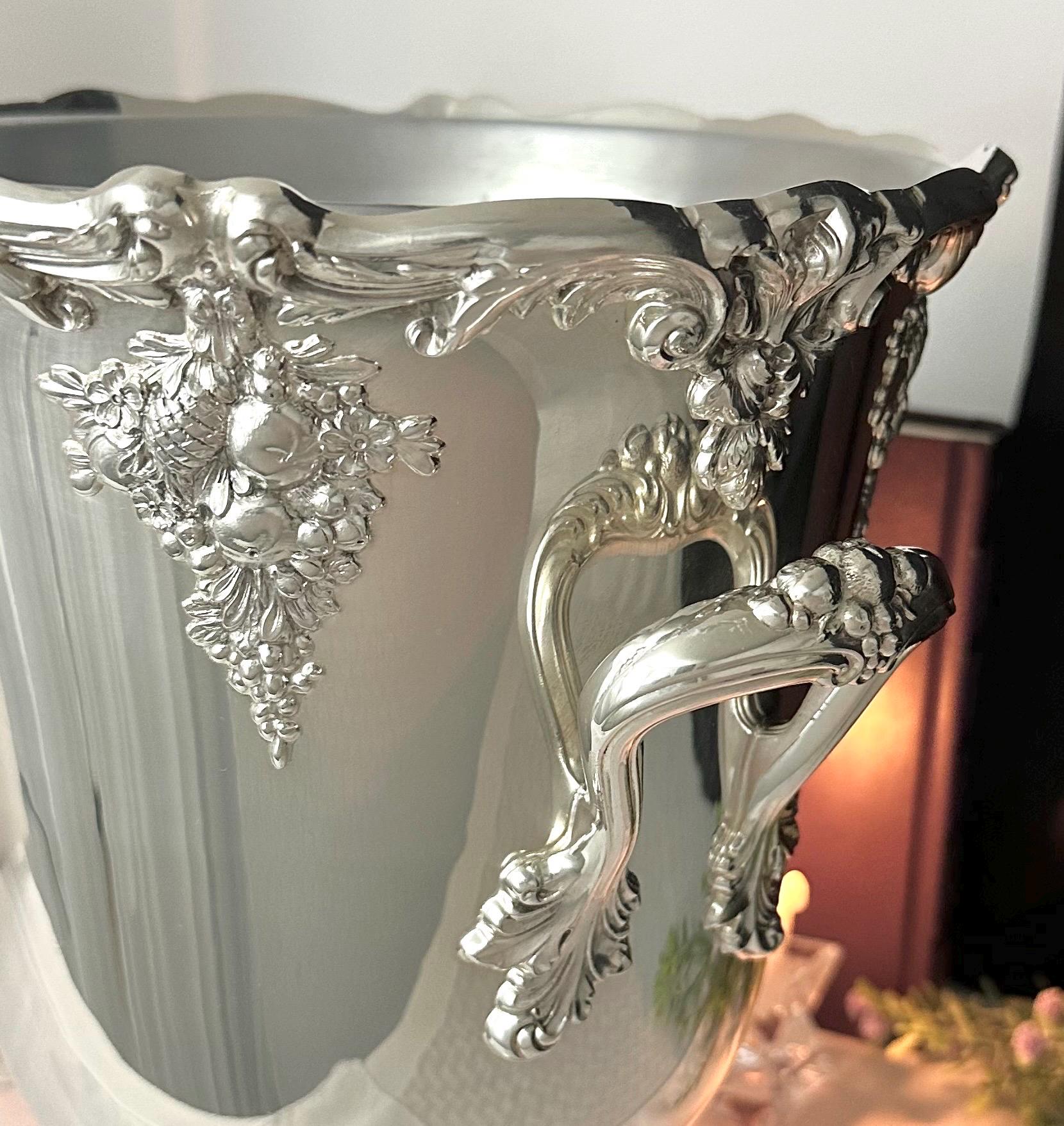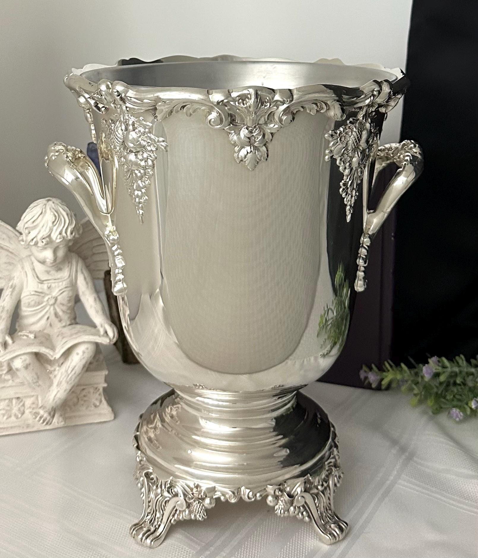 This is for an elegant and beautiful Vintage King Francis Wine Cooler by Reed & Barton. This is a luxurious silver plated champagne bucket with a floral pattern, perfect for all occasions from a wedding to an anniversary celebration. This lovely vintage piece has the original liner which is rare. This is in wonderful condition on the inside and on the outside and was very well cared for over the years.