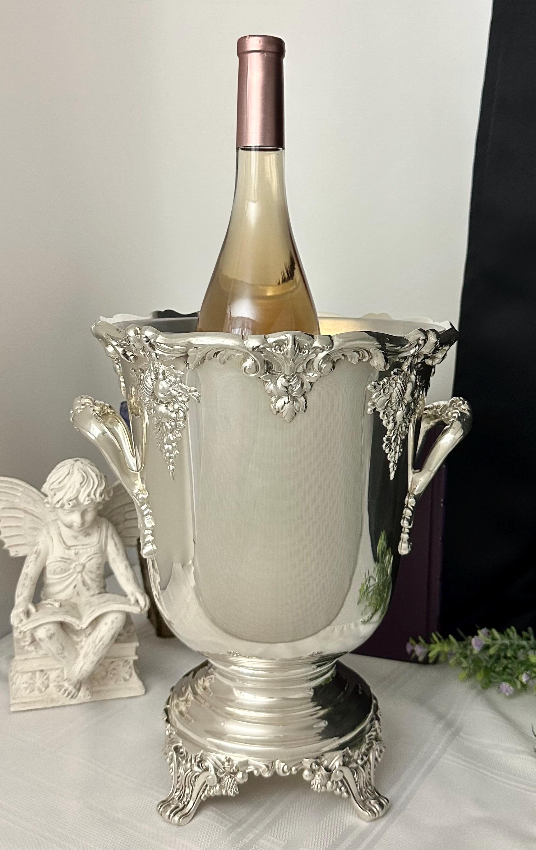 This round wine cooler stands at 11.25 inches tall and has a diameter of 8.5 inches, making it a stylish and functional addition to any barware collection. The intricate design and Victorian style make it a rare and elegant piece for cooling and serving champagne or wine in style.