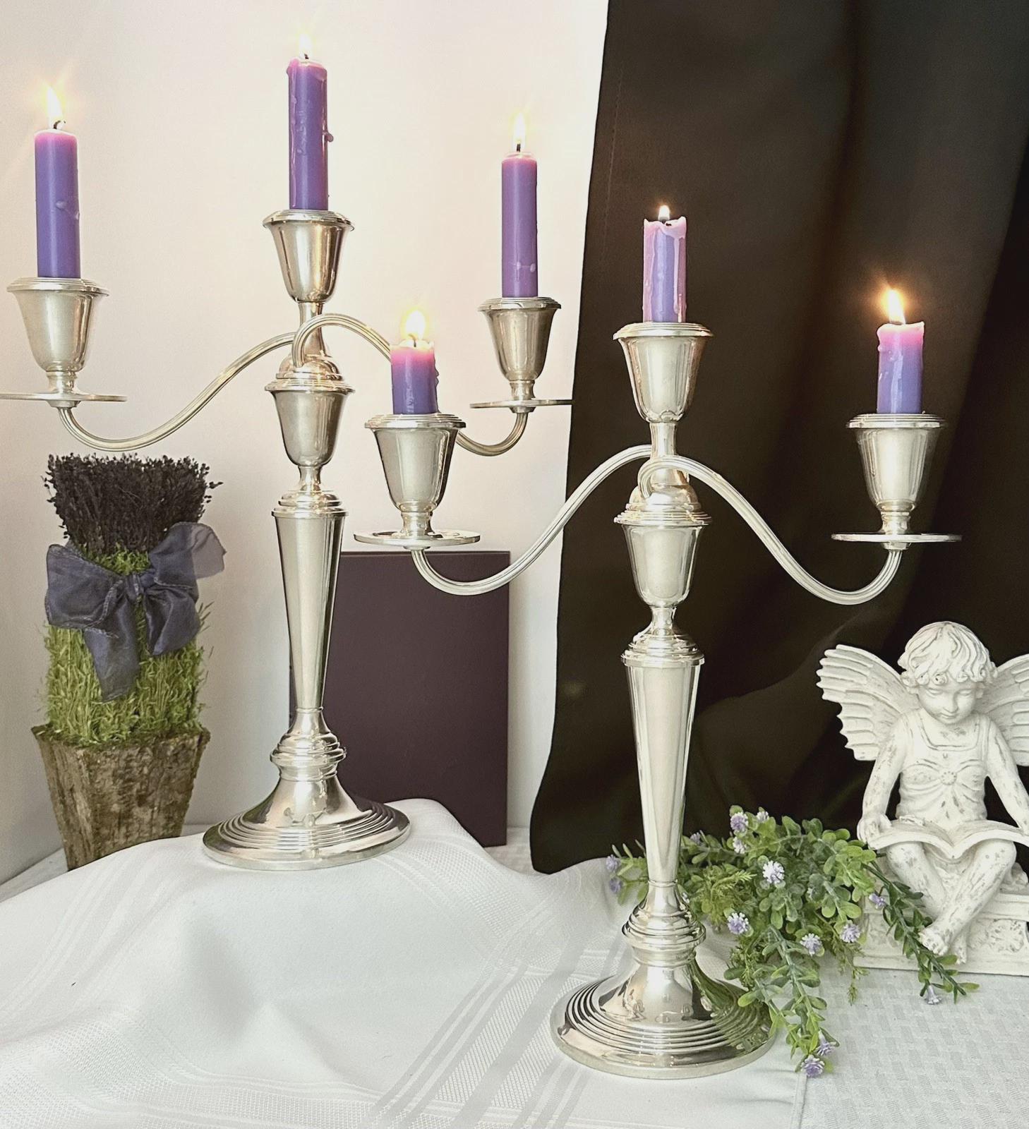 The 3 arm candelabras design adds a touch of vintage charm to any centerpiece, making them a valuable addition to any antique silver collection. These versatile convertible candle holders can also be used as single candle holders, providing flexibility in how you display your candles. Each tall candle holder is comprised of 4 separate pieces that screw together.