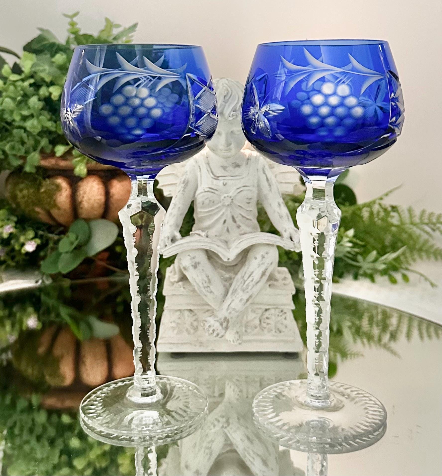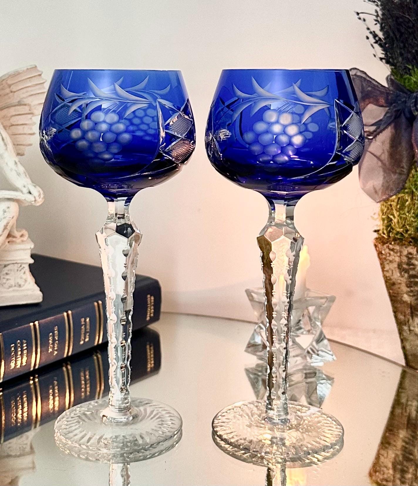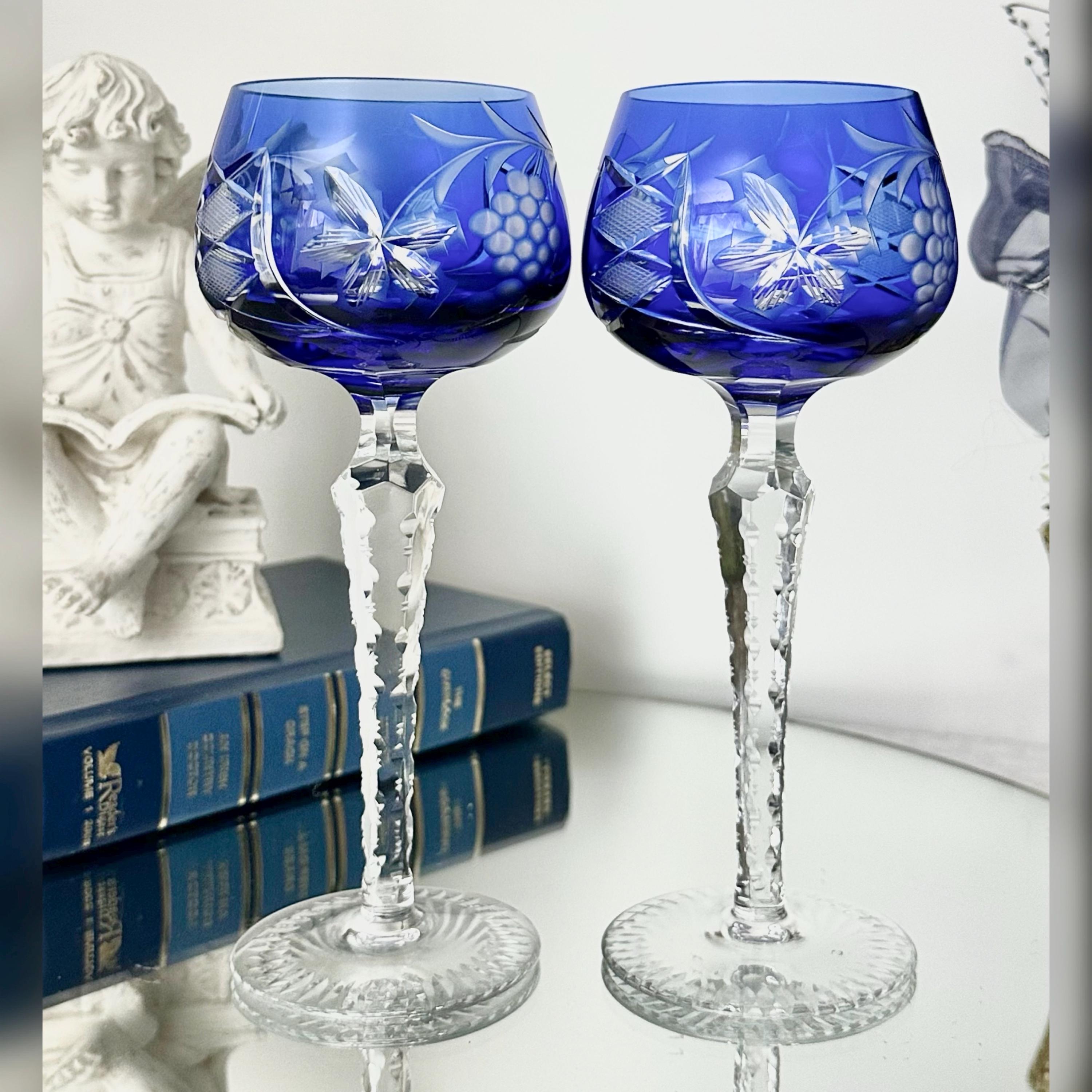 This is for a pair of lovely Lausitzer Blue Hock Wine Glasses. These are cobalt blue cut to clear glasses. This vintage two-piece stemmed wine hock set is crafted of hand-blown art glass in a Bohemian pattern of grapes, leaves and cross hatch cuts.