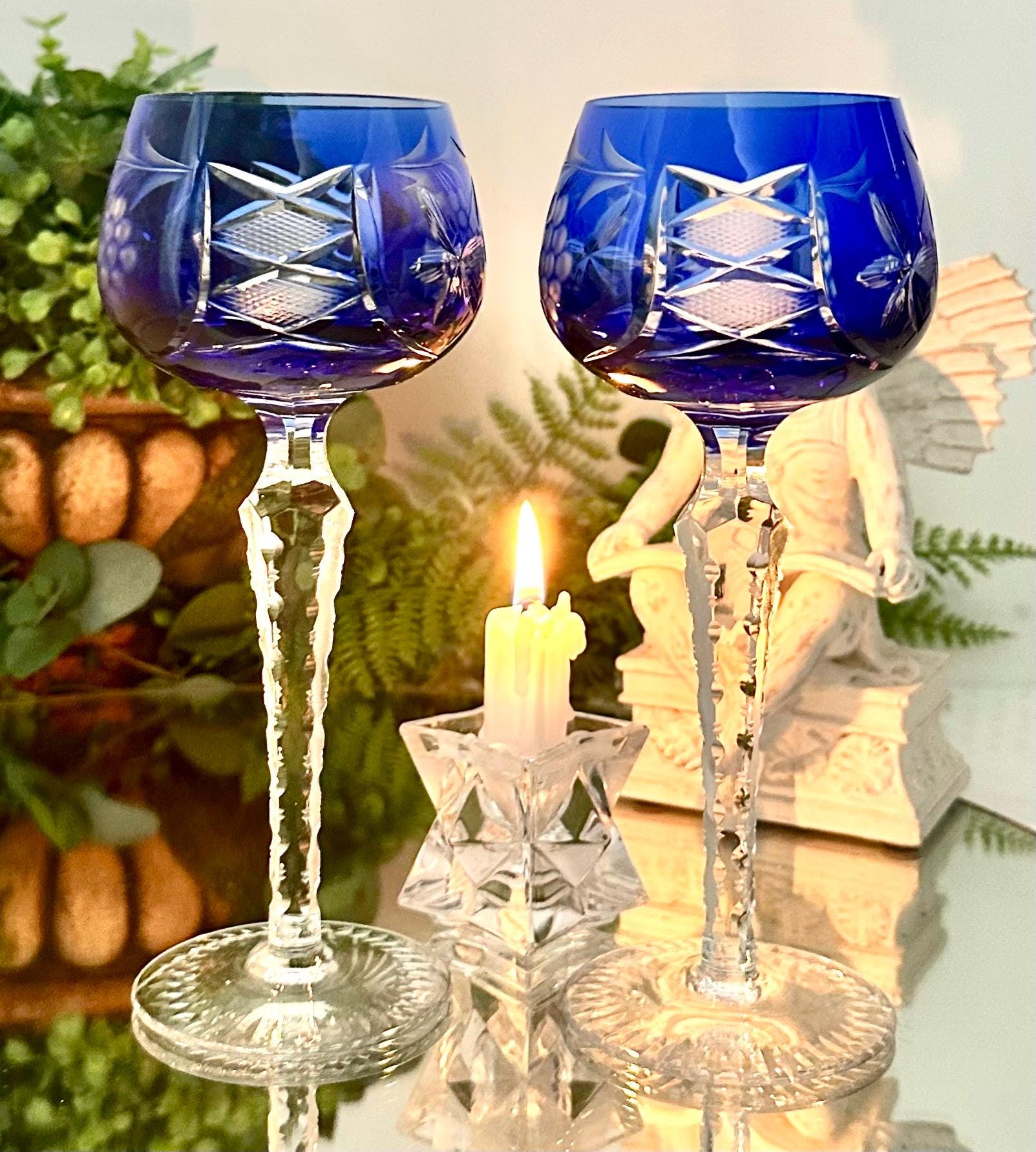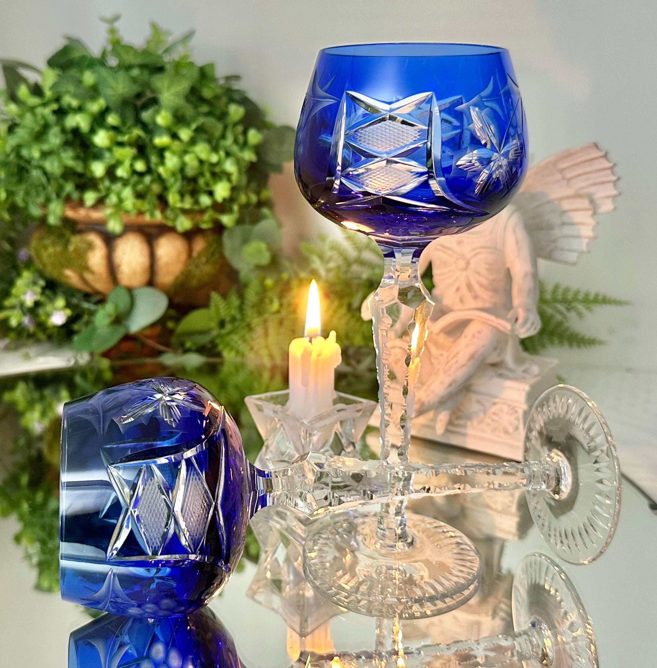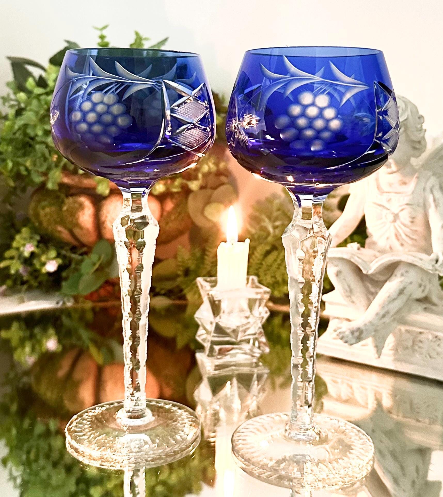 This is for a pair of lovely Lausitzer Blue Hock Wine Glasses. These are cobalt blue cut to clear glasses. This vintage two-piece stemmed wine hock set is crafted of hand-blown art glass in a Bohemian pattern of grapes, leaves and cross hatch cuts.