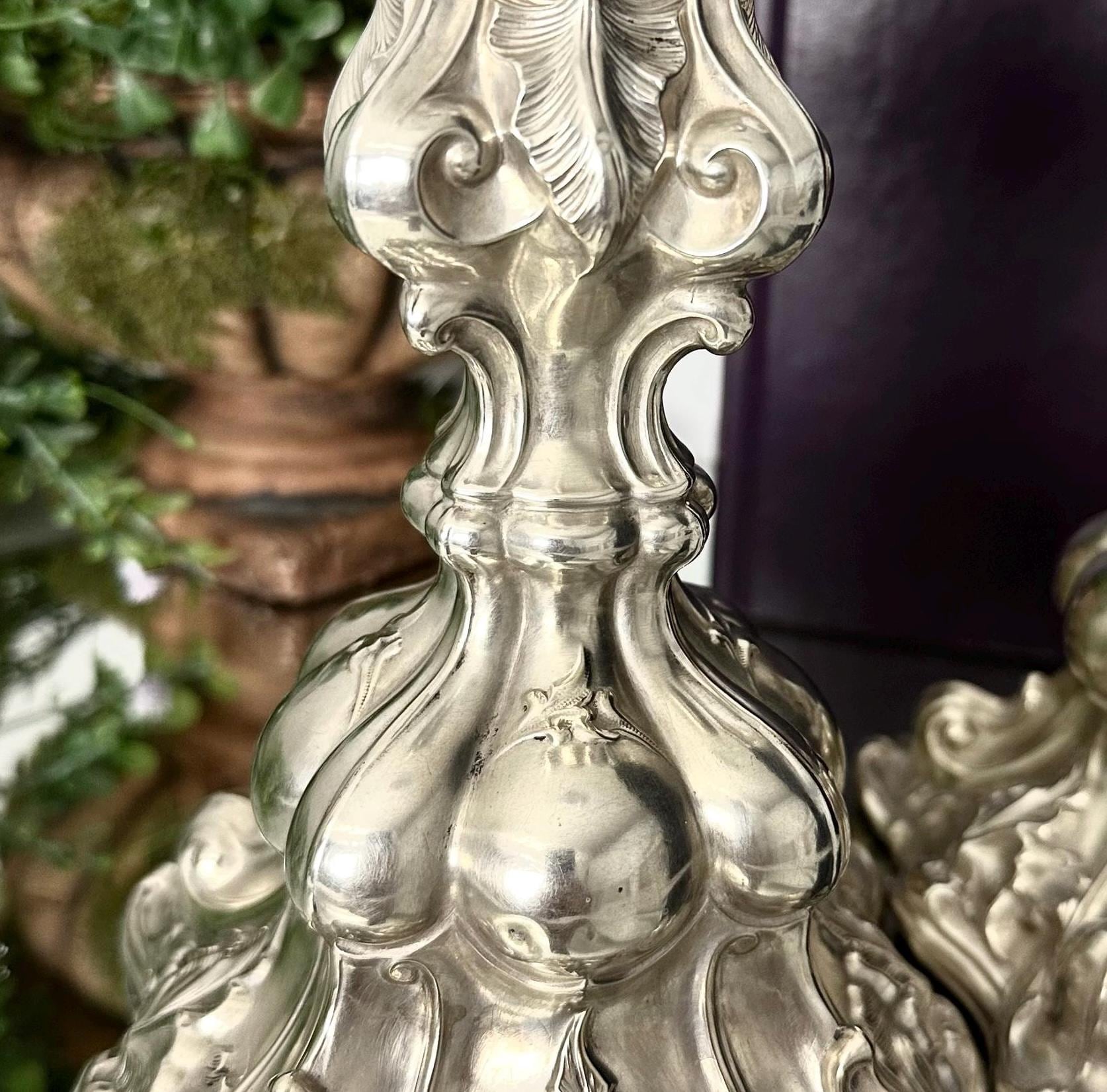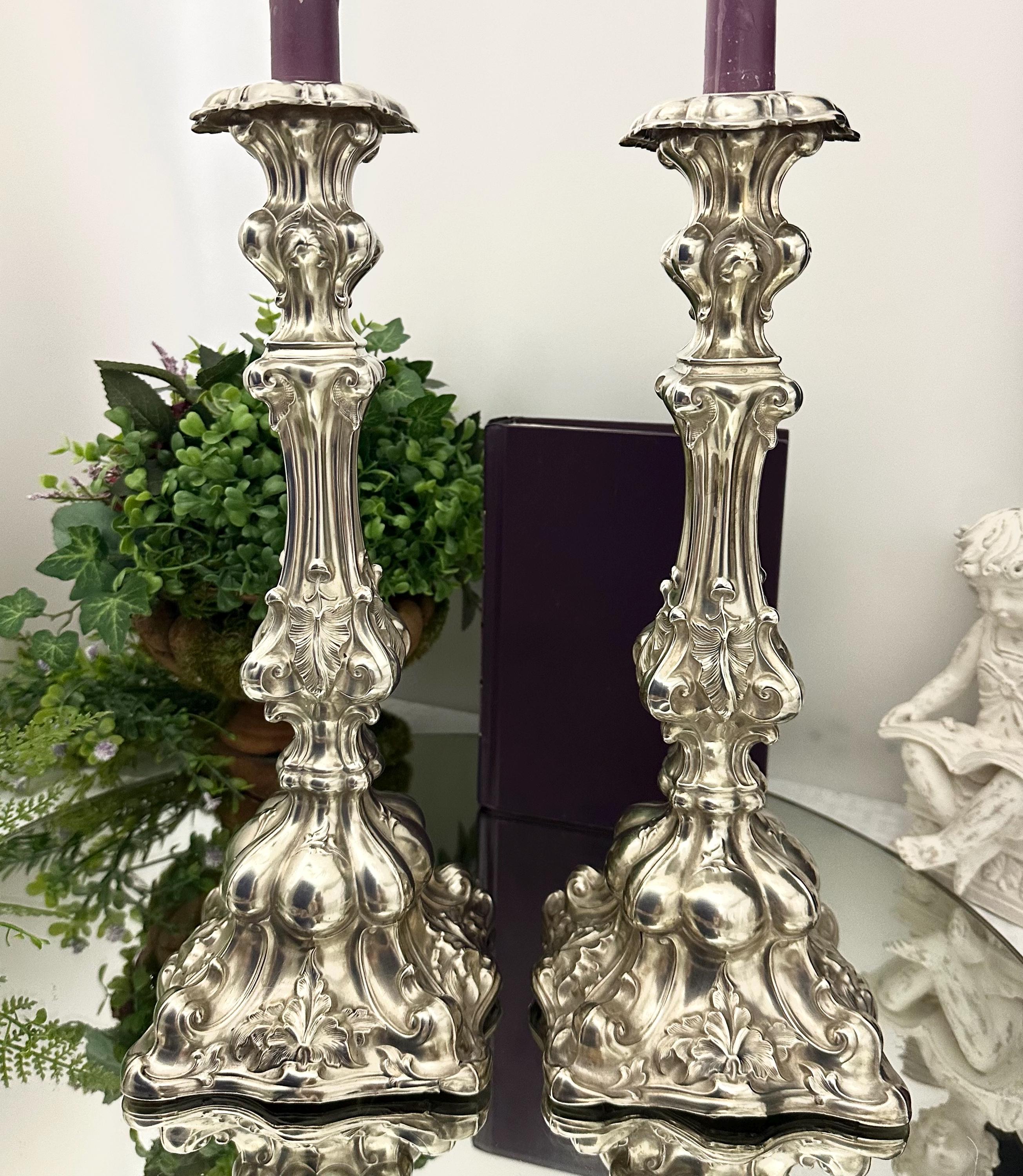 This is for a matched pair of Artistic 19th Century Rococo Revival Decorative Sterling Silver Tall Candle Holders. Each of these measures: 12.5 inches tall x 5 inches wide x 5 inches deep. These are hollow on the inside with no added weights. The total weight for the pair is 456 grams or 16.1 Oz. These are valued in the craftsmanship and the age.