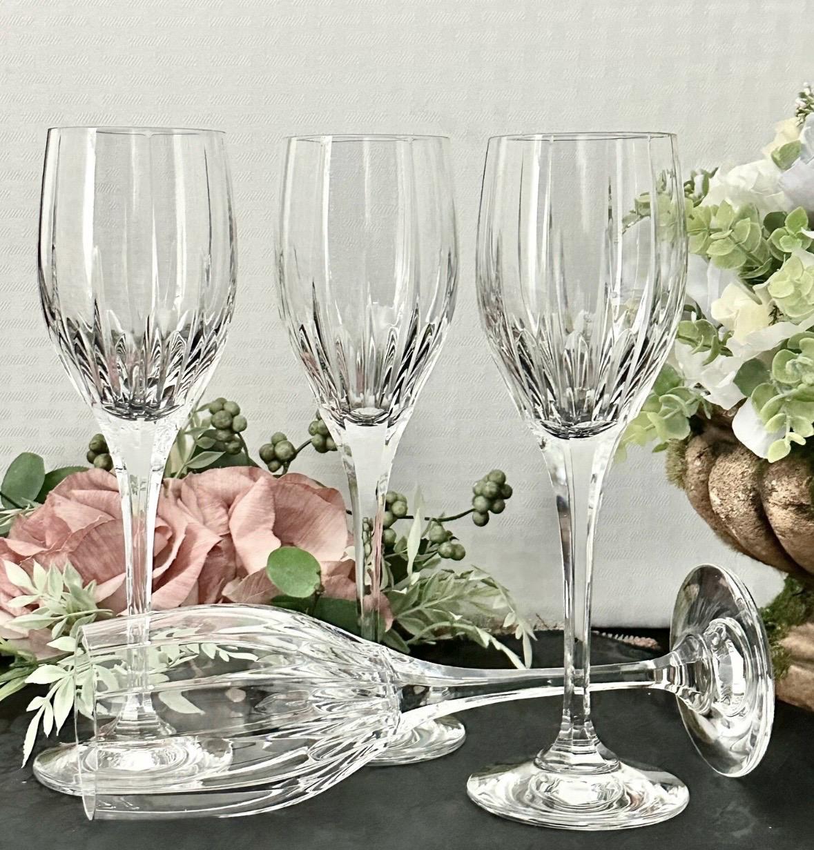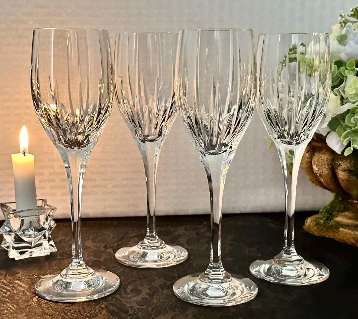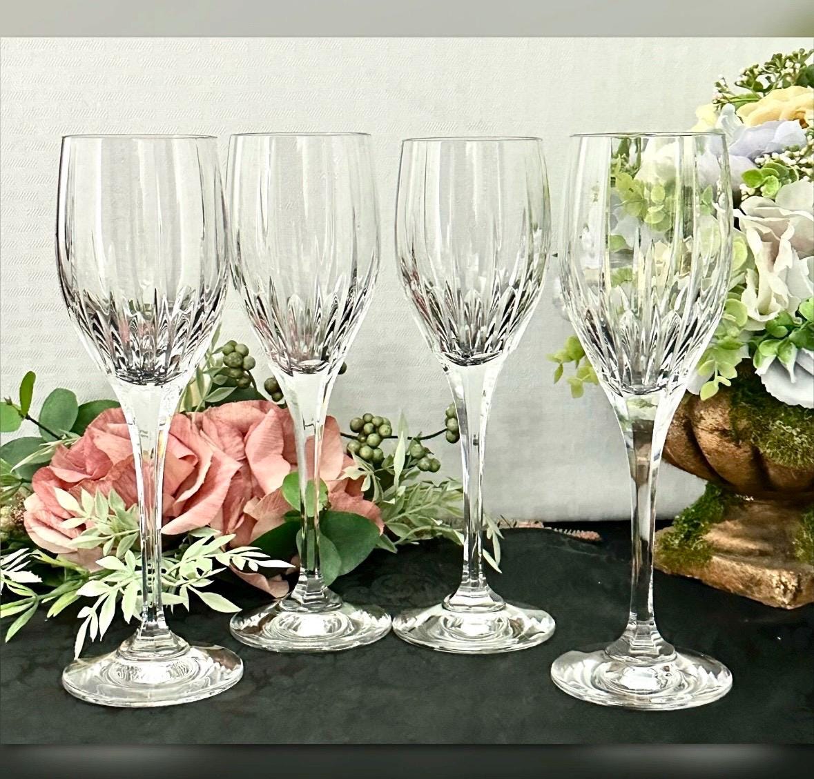 This is for a beautiful set of 4 vintage Mikasa Crystal glasses in the Arctic Lights pattern. These Mikasa glasses have deep vertical cuts on the bowl that lead to a multisided stem. These are beautiful statement glasses in the Wine Glass size . These measure: 8.25 inches tall and have a 2 1/4inch diameter bowl and hold 6 oz of liquid.