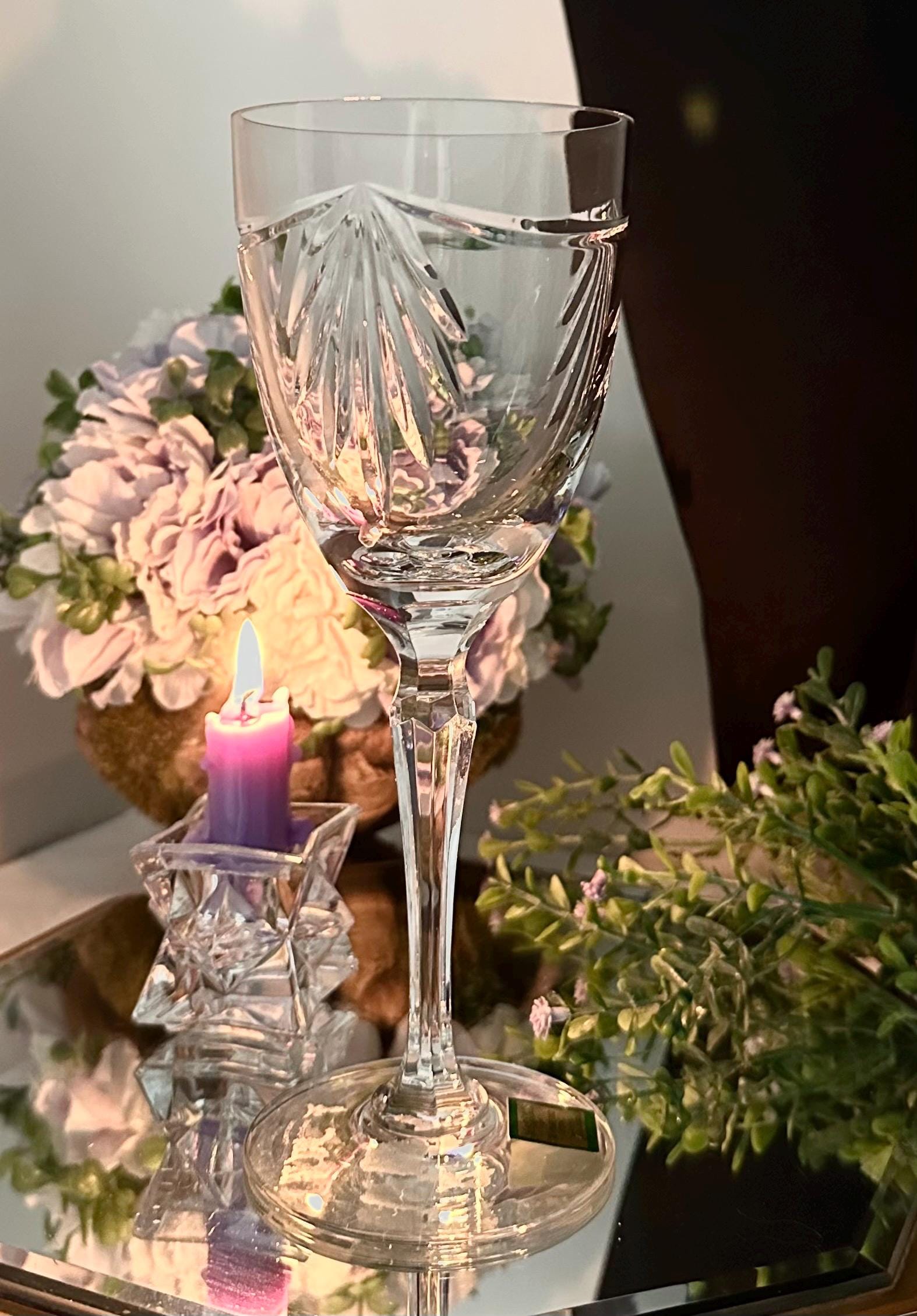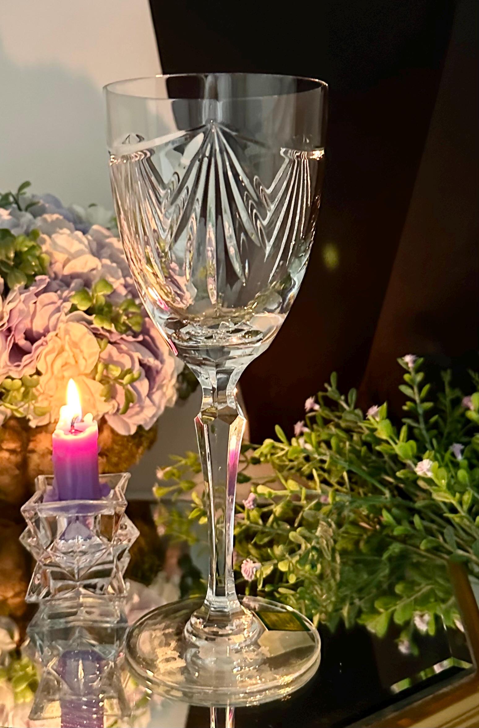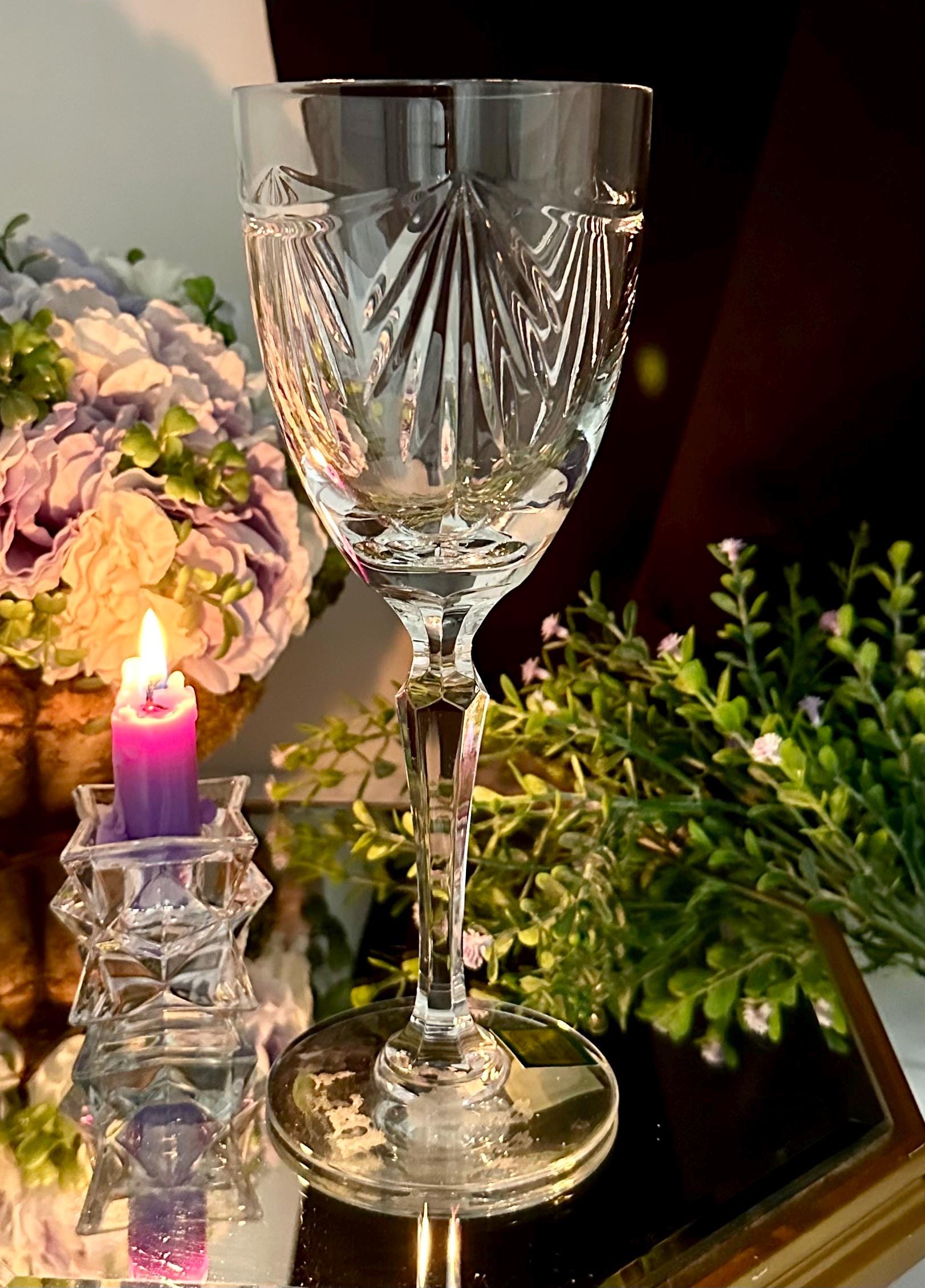This Water Glass is a vintage collectible wine glass made of elegant glass, featuring an all-over pattern and a contemporary style. The Bowl of this lovely glass is decorated with a Garland cut and a fan with a multi sided stem.