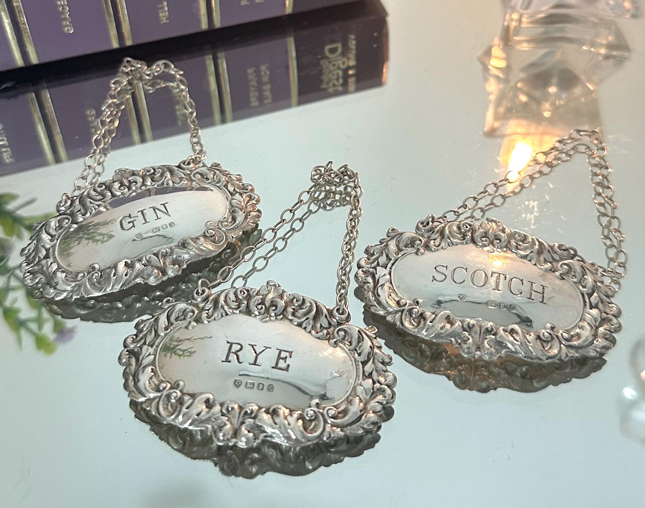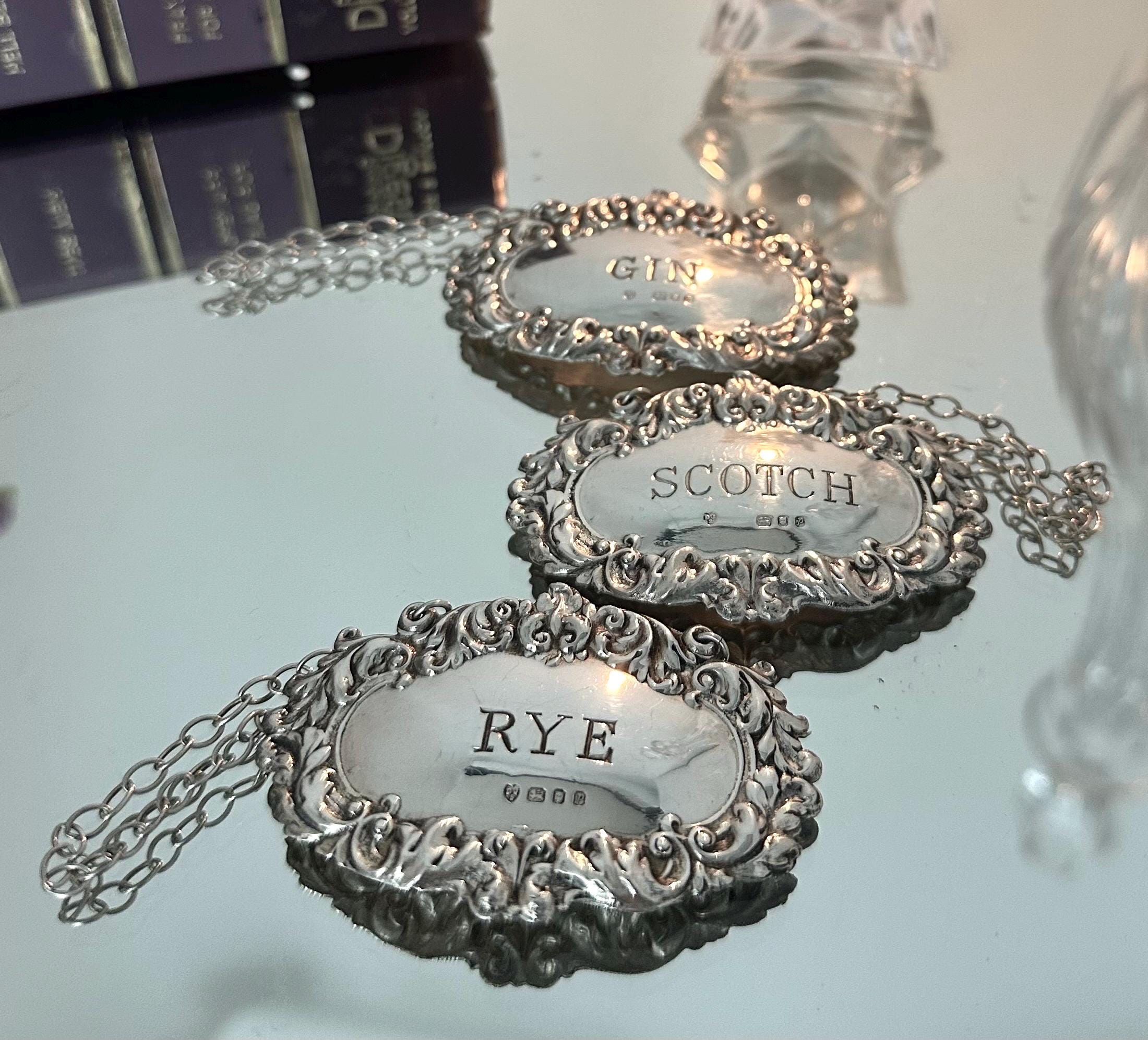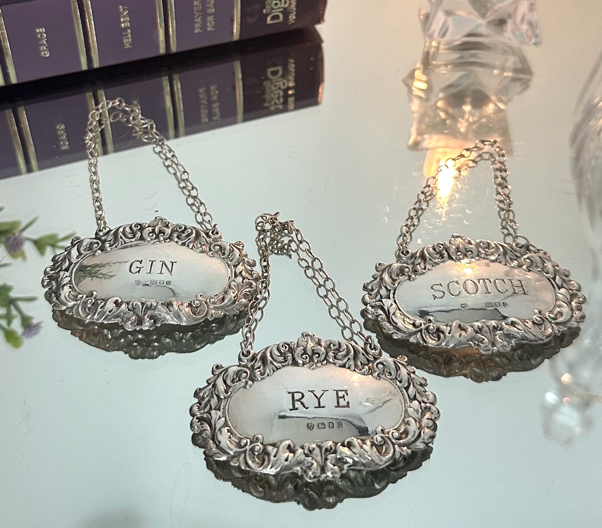 These Vintage Sterling pieces add a touch of elegance to your barware collection. The rococo shell and floral pattern and sterling silver material give them a sophisticated look, perfect for all occasions. Each label is designed for a specific liquor - Scotch, Rye and Gin - and includes a sterling chain for easy hanging. Each Tag weighs .45 Oz. of .925 Silver.