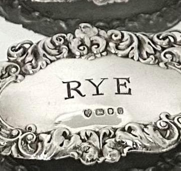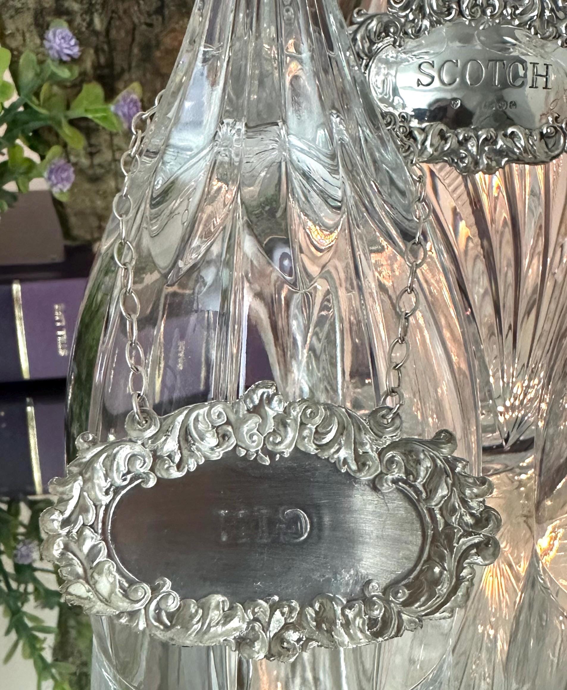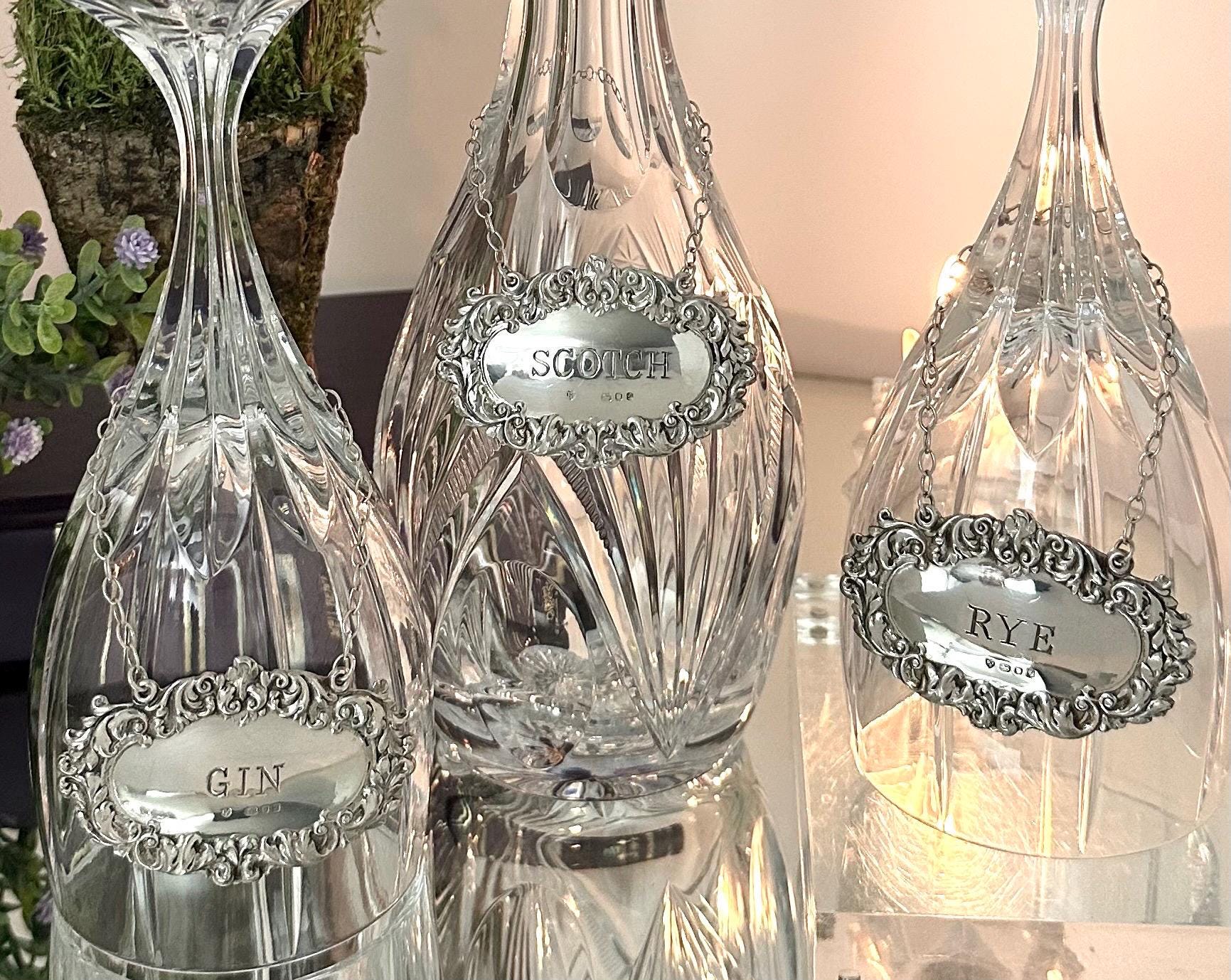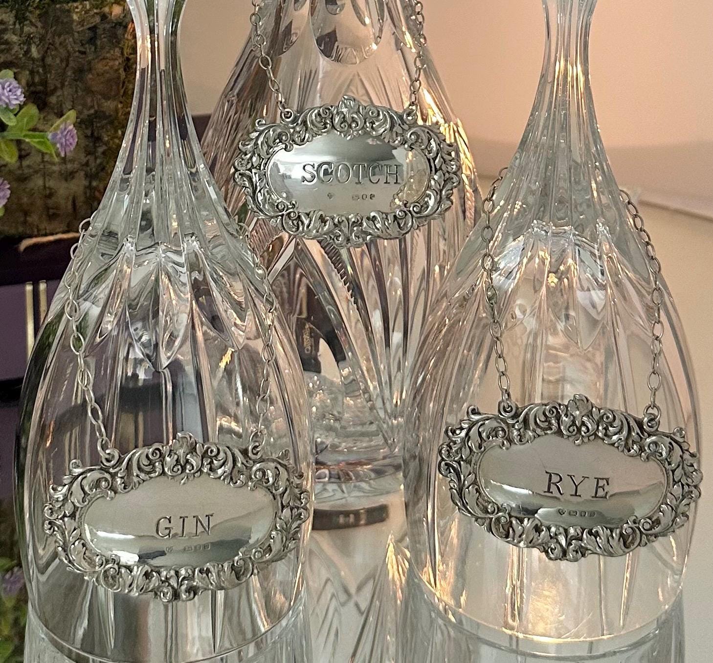 These Vintage Sterling pieces add a touch of elegance to your barware collection. The rococo shell and floral pattern and sterling silver material give them a sophisticated look, perfect for all occasions. Each label is designed for a specific liquor - Scotch, Rye and Gin - and includes a sterling chain for easy hanging. Each Tag weighs .45 Oz. of .925 Silver.