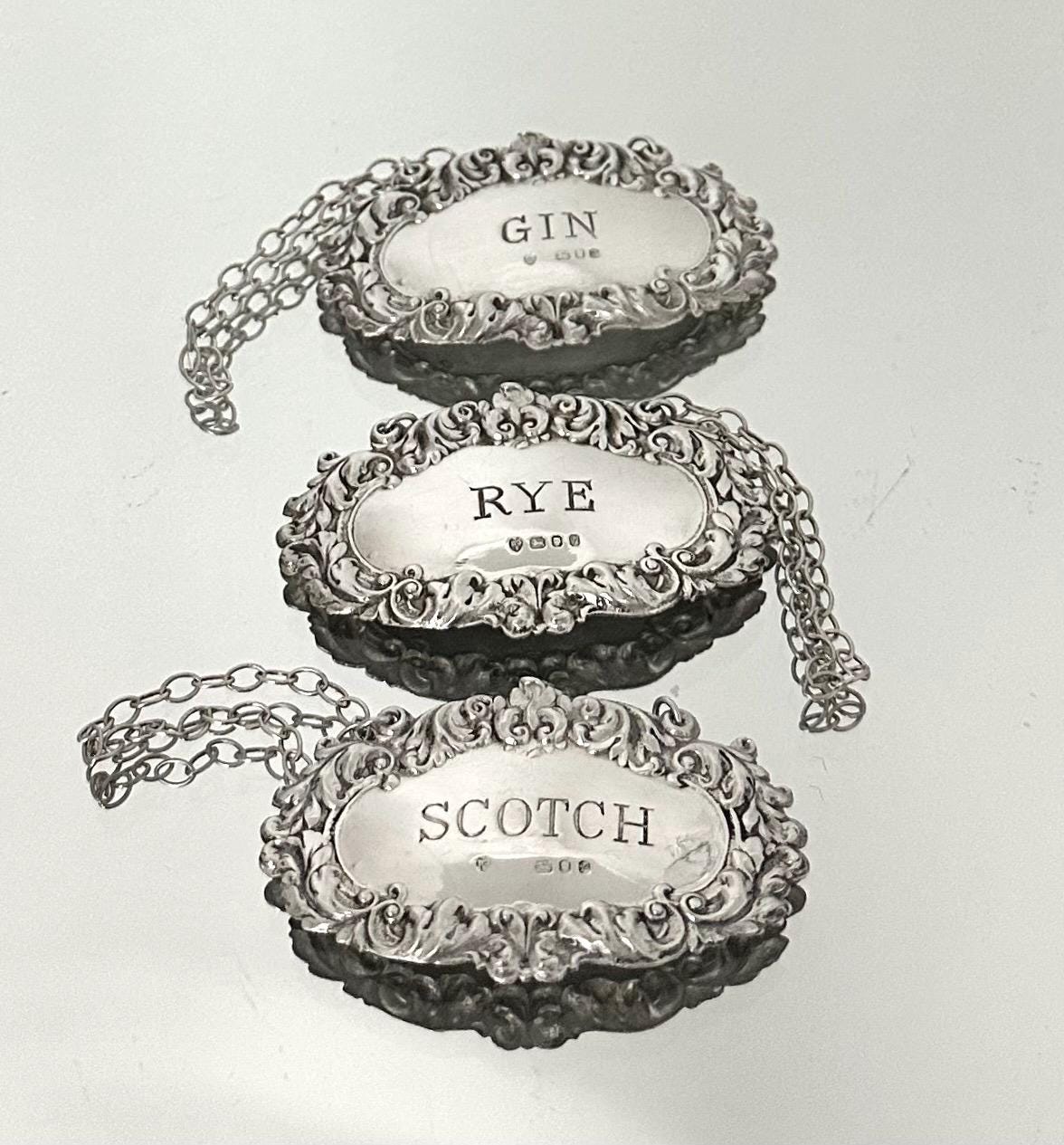 This is for a Vintage 3 piece set of Victorian Rococo styled English Sterling Silver Decanter Labels from Sheffield / England. These are letter dated to 1988. The maker marks are from David J Shackleton.