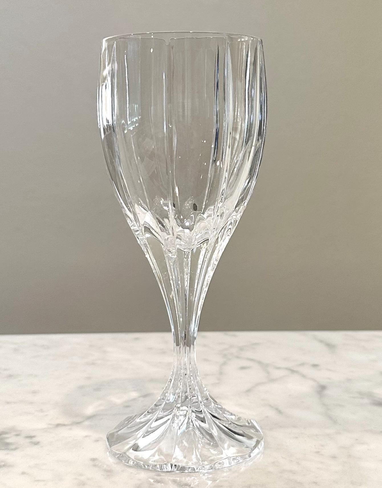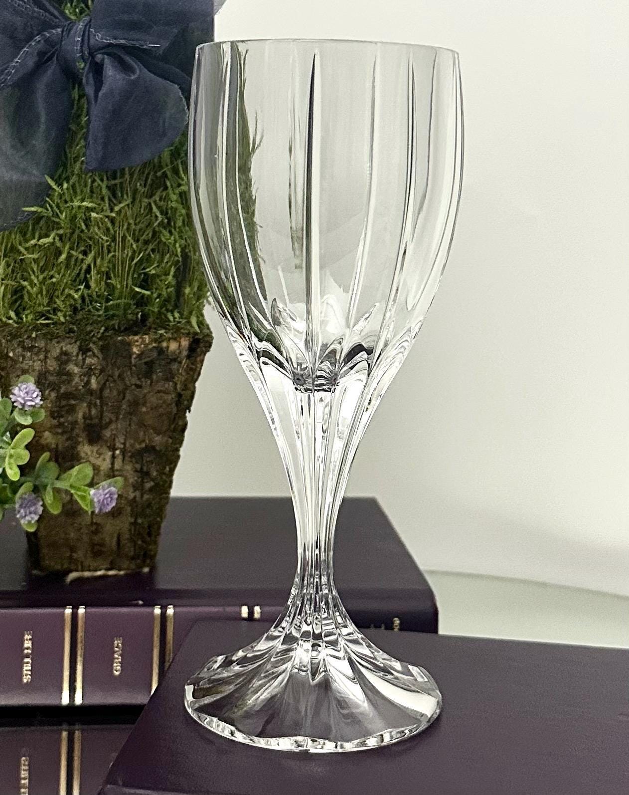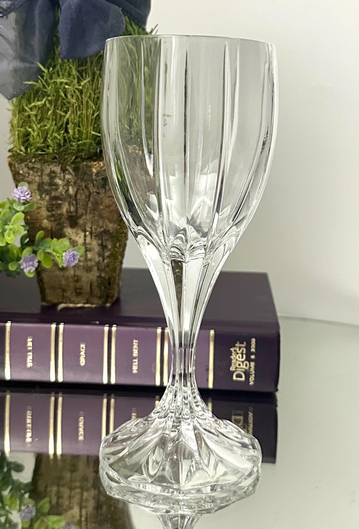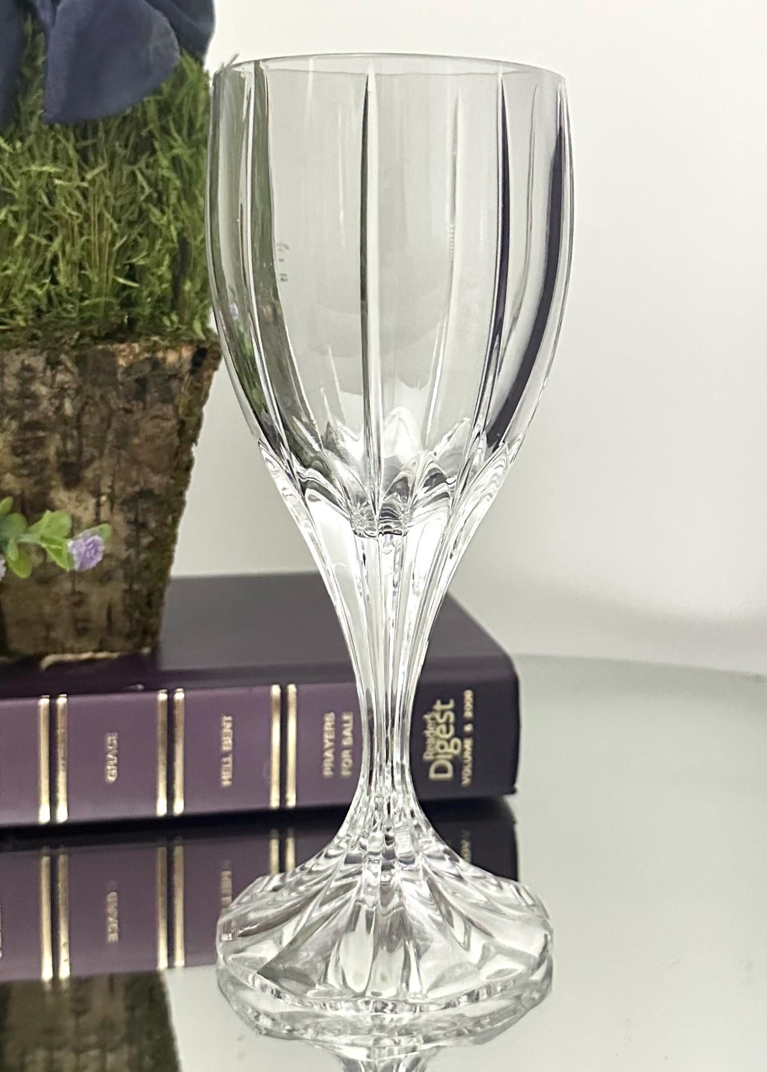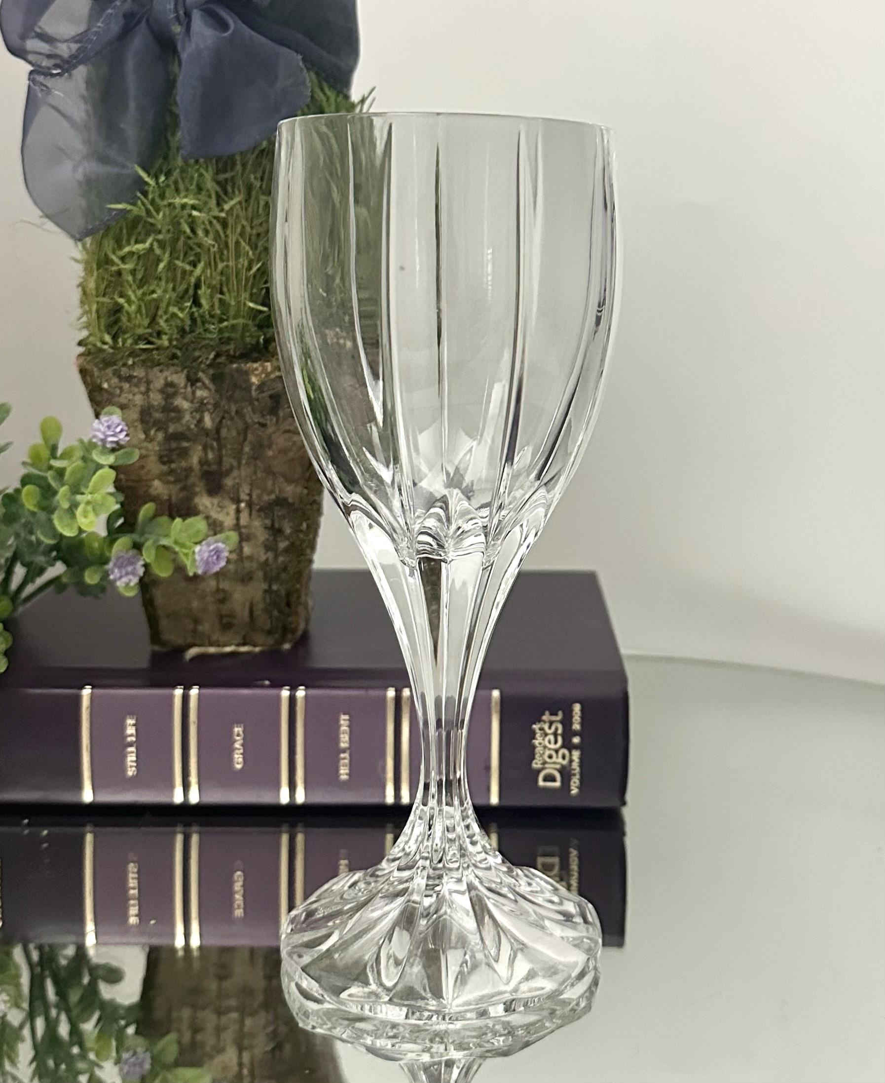 This is for 1 Mikasa Berkeley Water Goblet. This is a lovely elegant vintage glassware with a vertical textured design, perfect for all occasions. Made of clear glass with a diameter of 2 7/8 inches and a height of 7.25 inches, these water goblets are part of the Berkeley franchise by Mikasa, produced between 1989 to 2004.