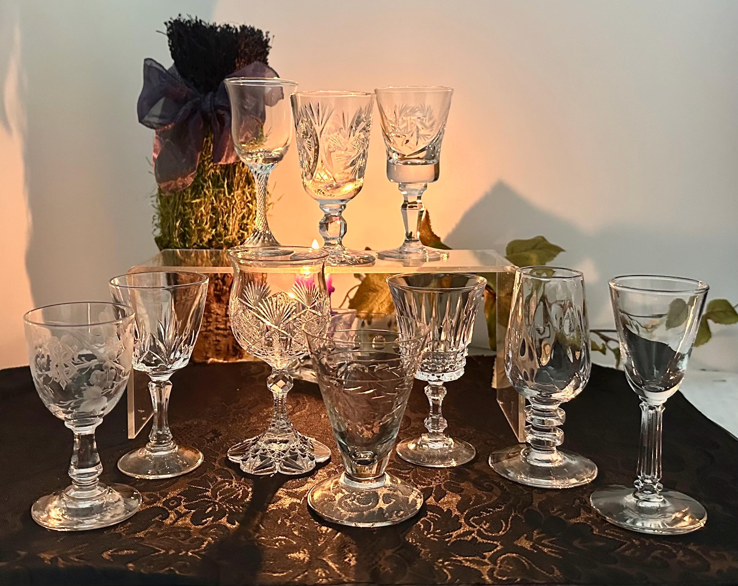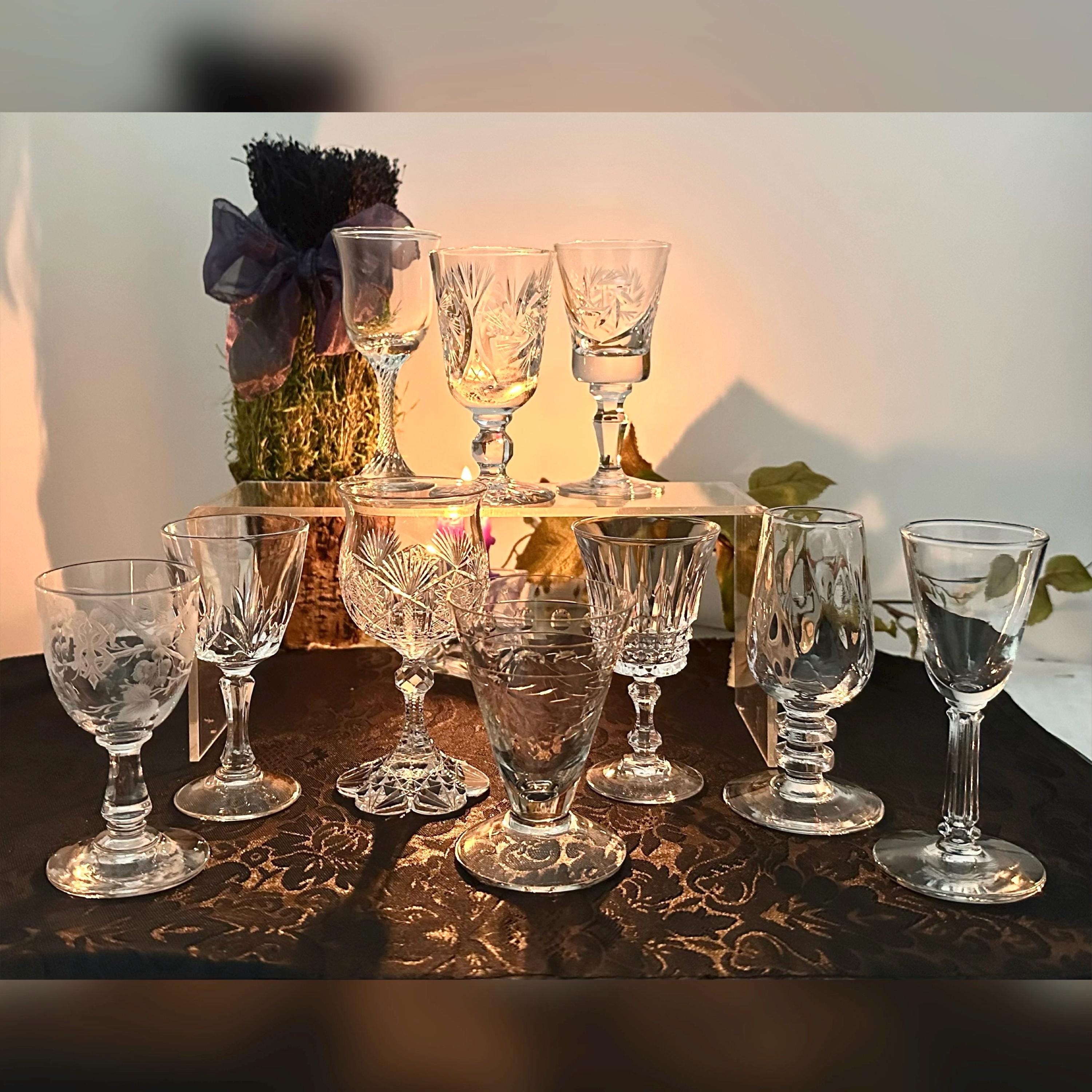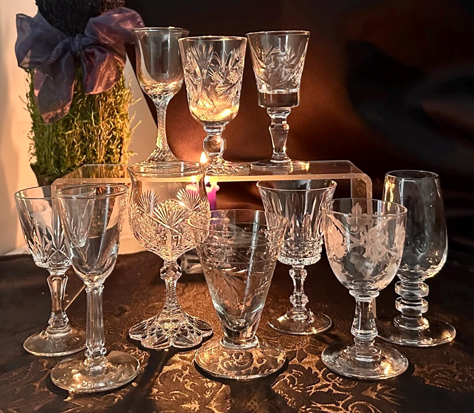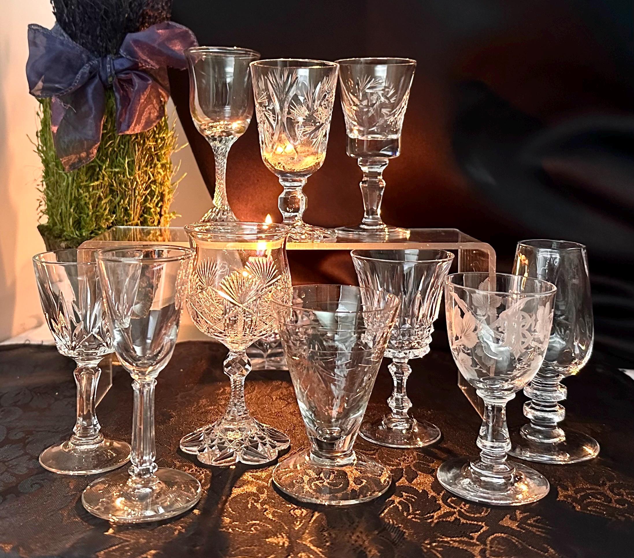 This is for a set of 10 cordial Glasses / Aperitifs Digestifs Stemware / mixed set of Crystal and Glass pieces. These measure between 3.25 inches tall to 4.25 inches tall and hold between 1 oz to 3 oz of liquid.