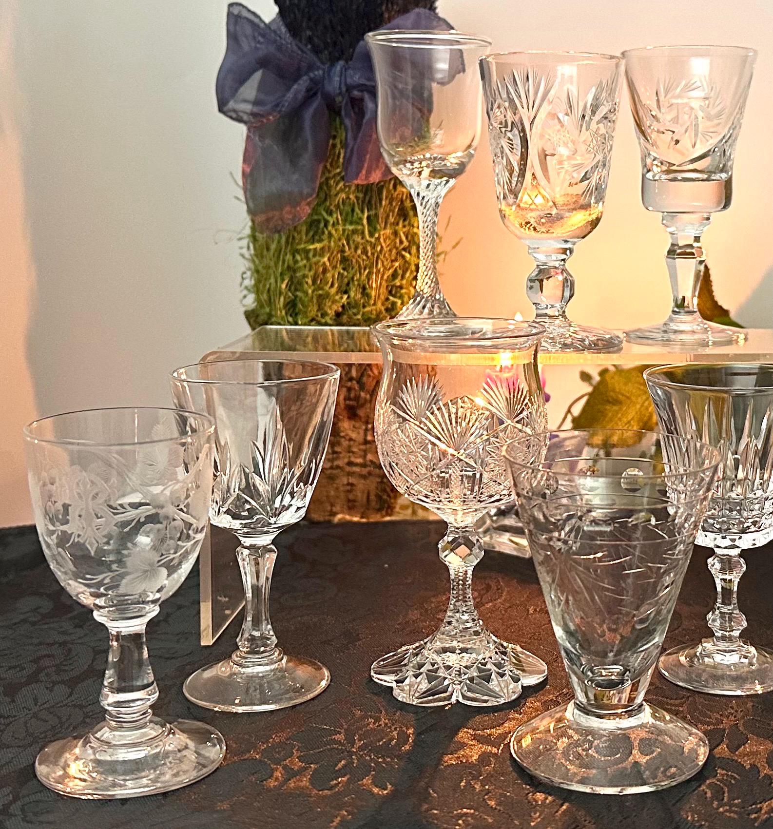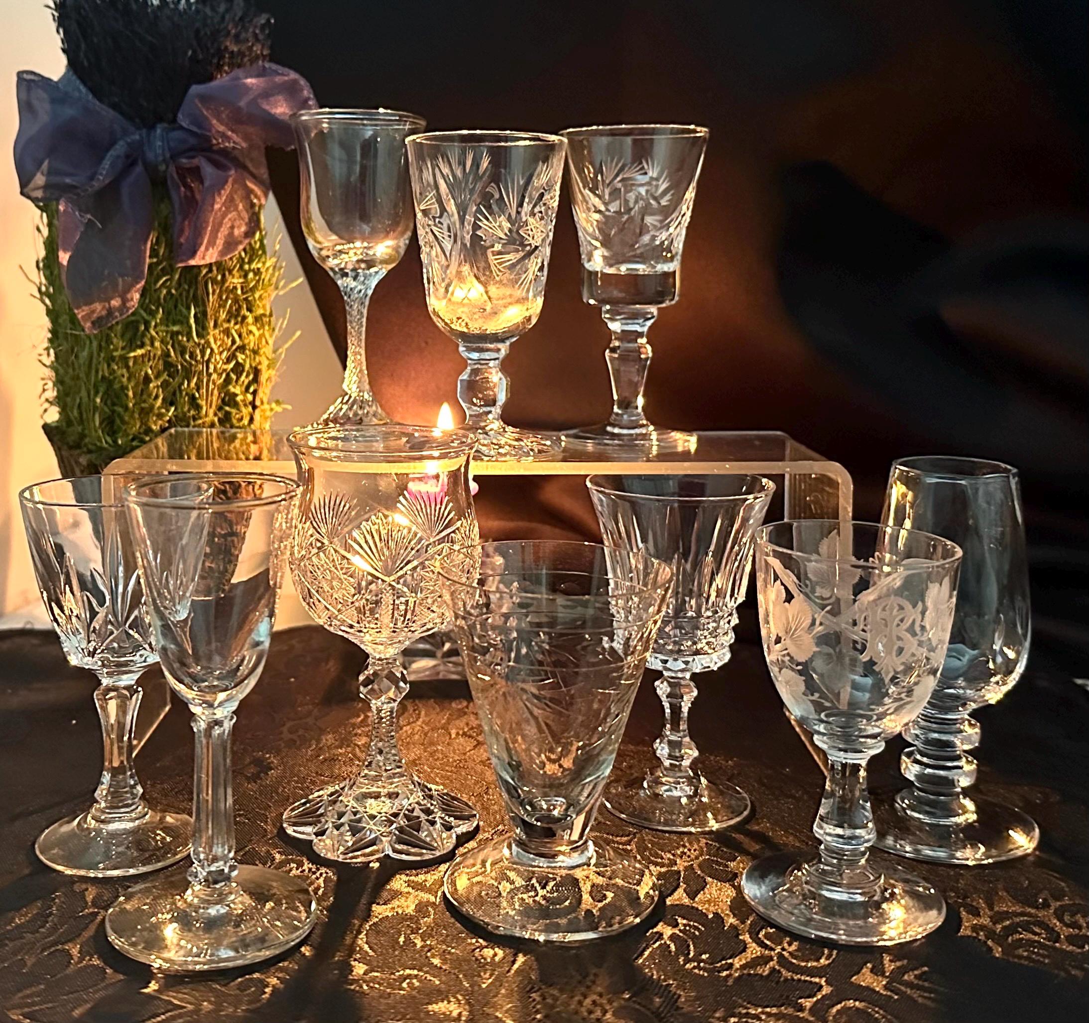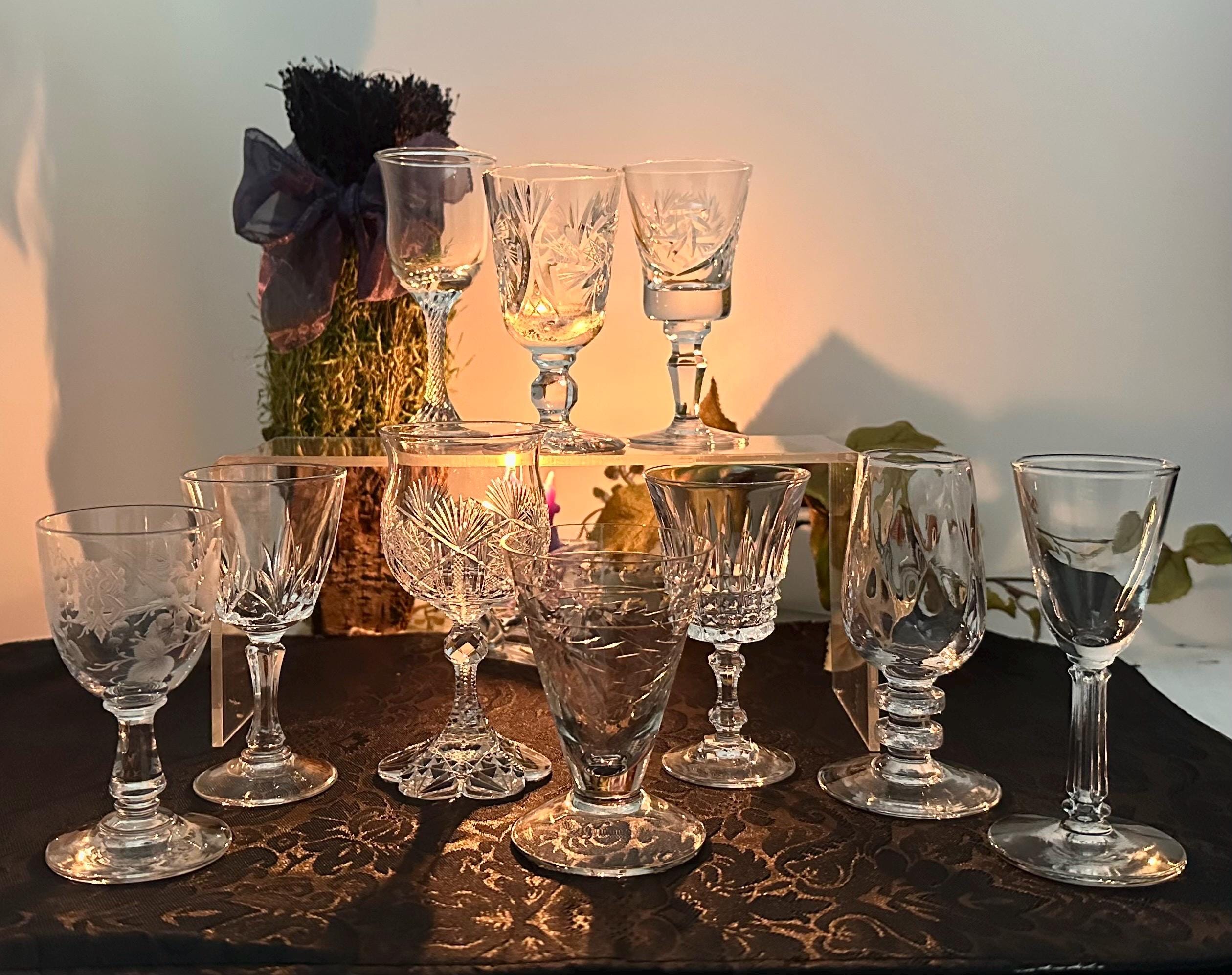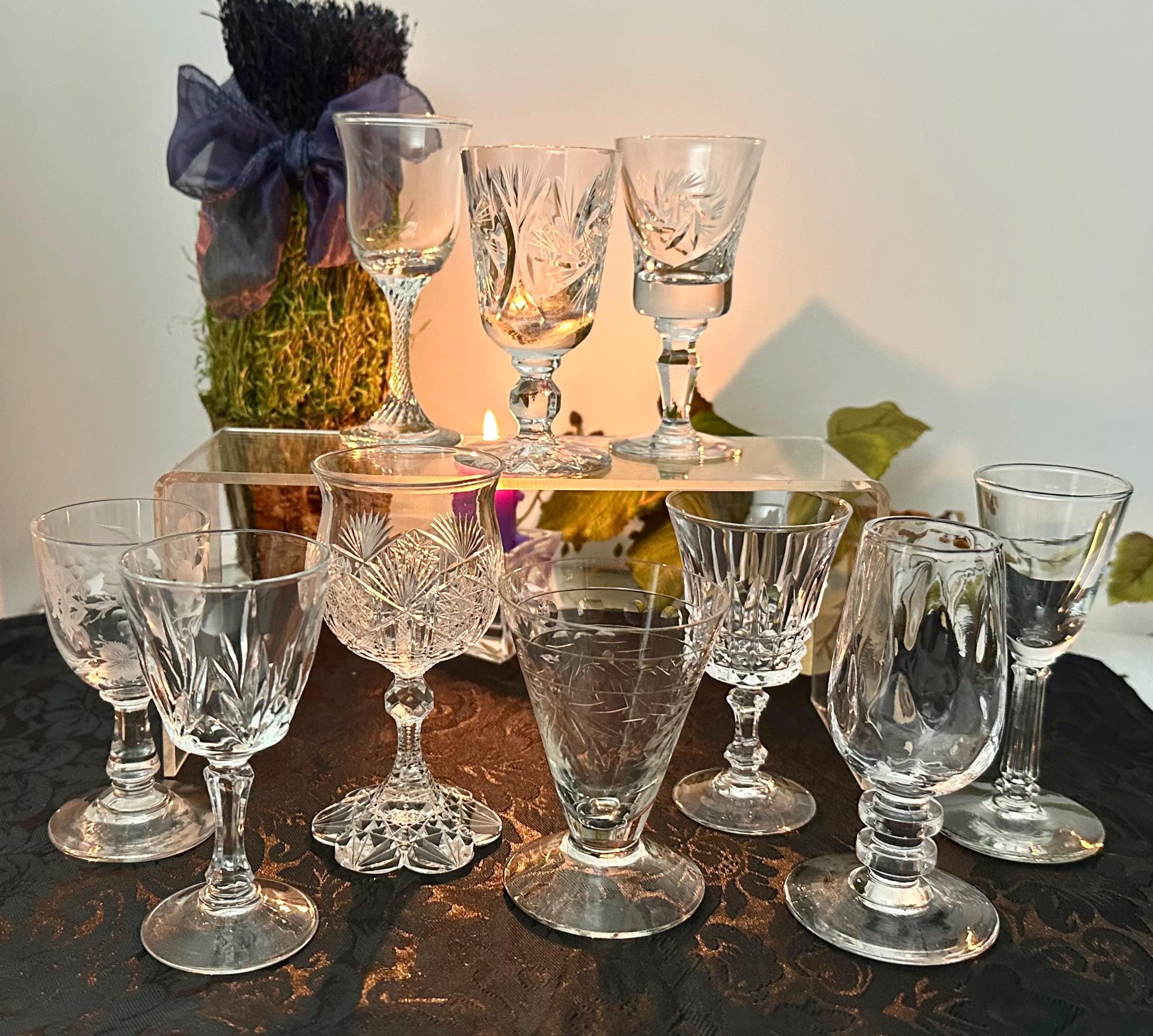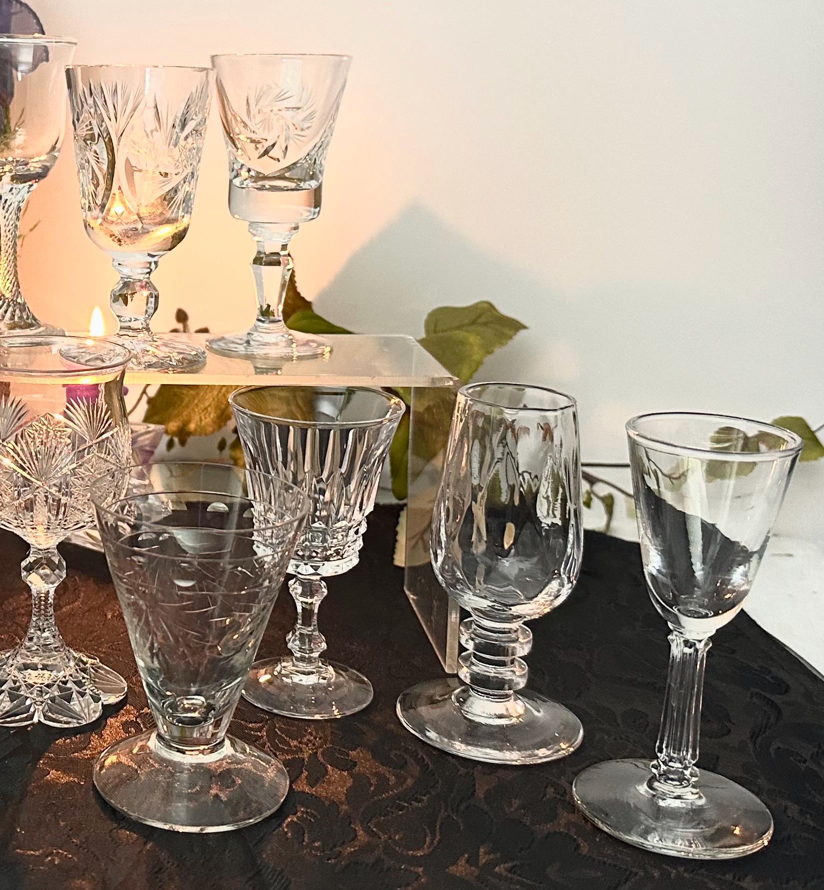 This is for a set of 10 cordial Glasses / Aperitifs Digestifs Stemware / mixed set of Crystal and Glass pieces. These measure between 3.25 inches tall to 4.25 inches tall and hold between 1 oz to 3 oz of liquid.