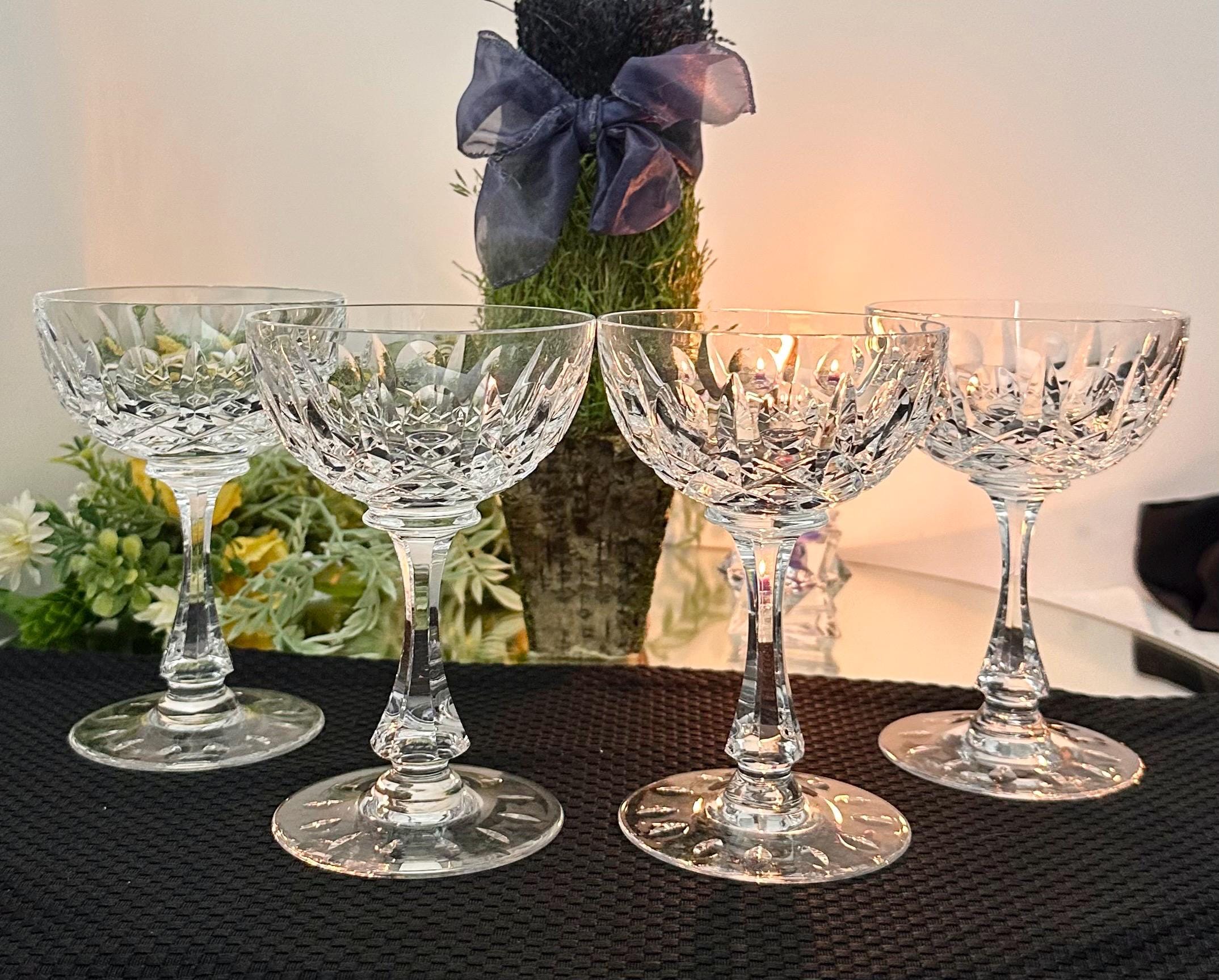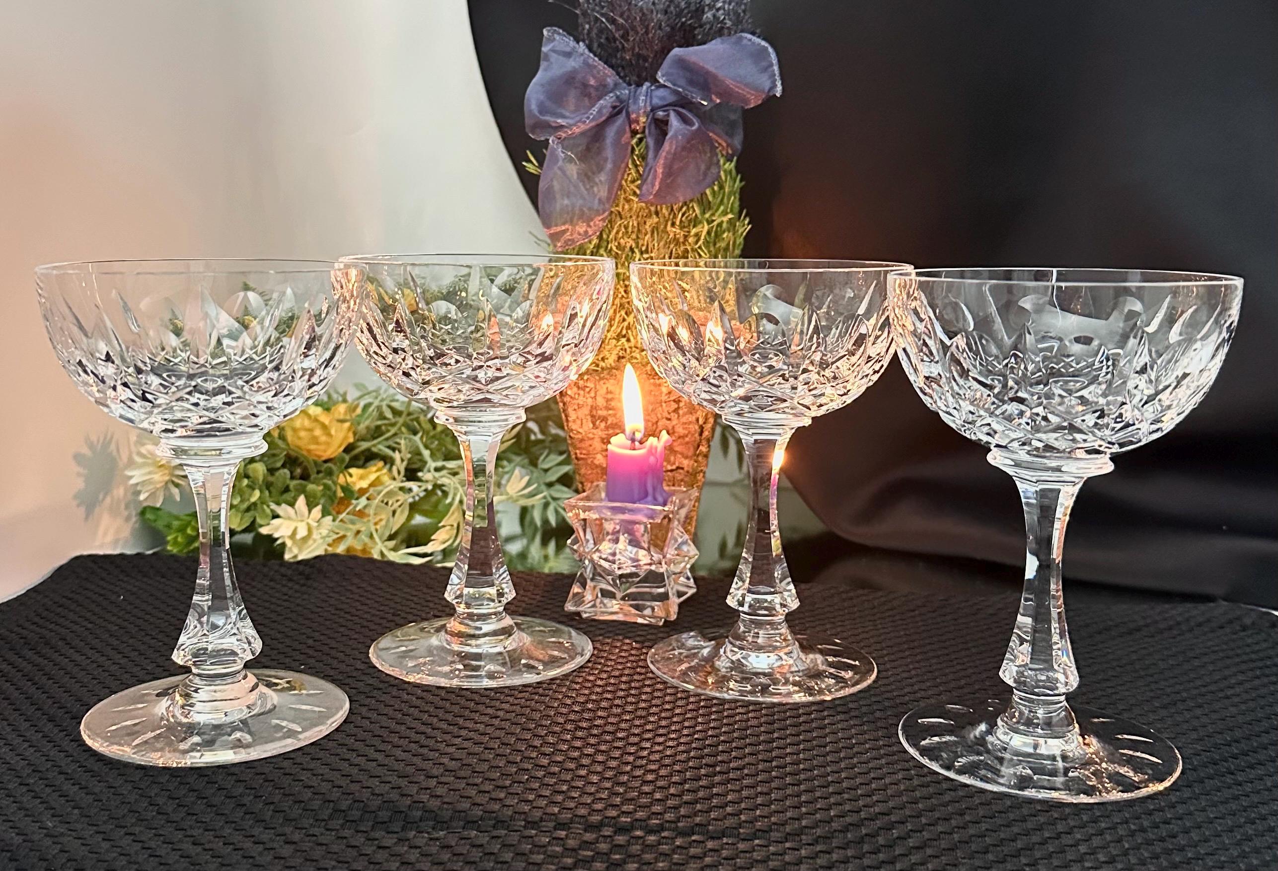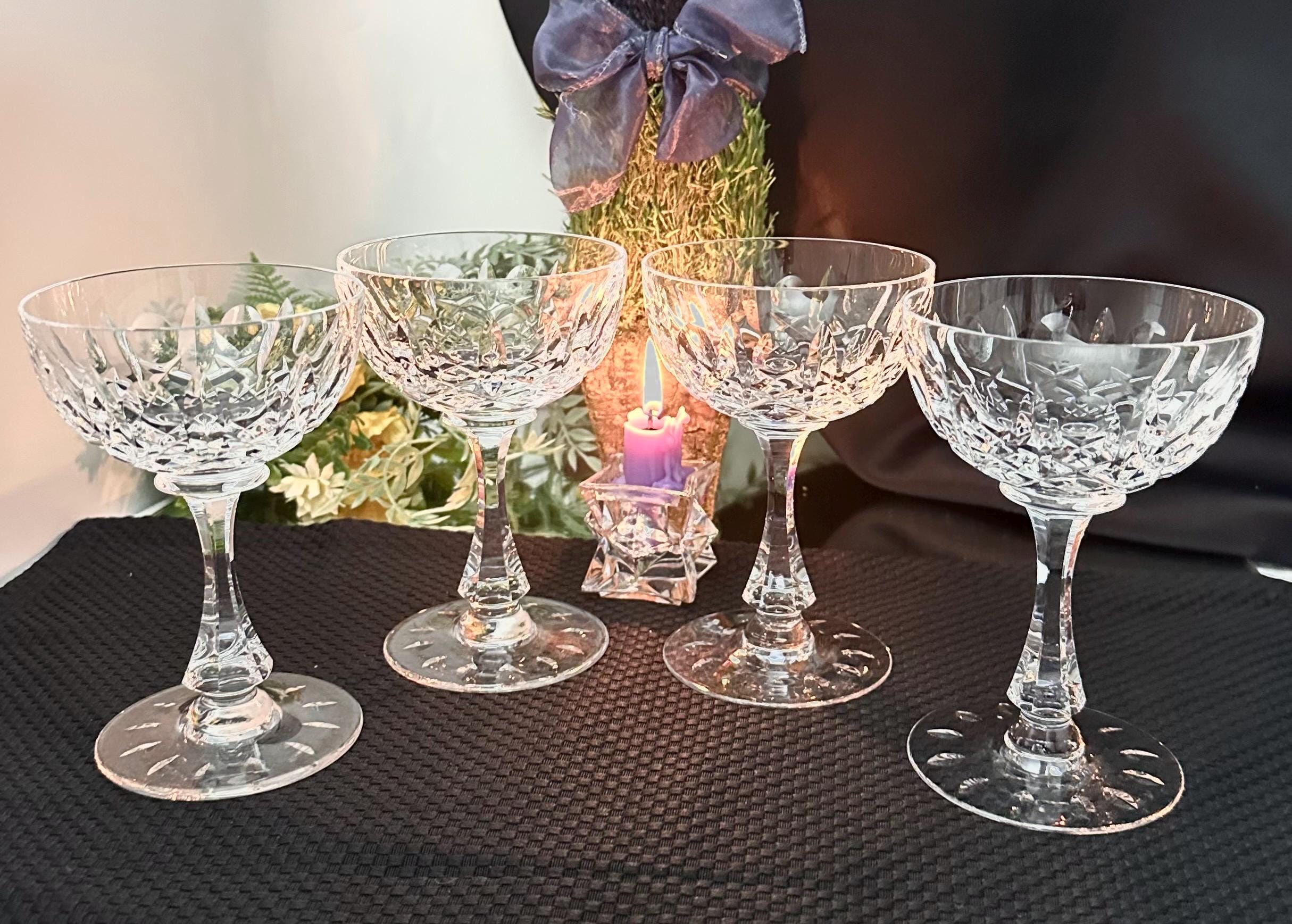 This is for a set of 4 Vintage Josair elegant tall Dessert Cup / Champagne Coupe crystal glasses. These are in the cut blown glass pattern of Monte Claire. This pattern has lovely deep cuts in the hand blown crystal. These toasting glasses were produced from 1964 to 1988 and are discontinued.