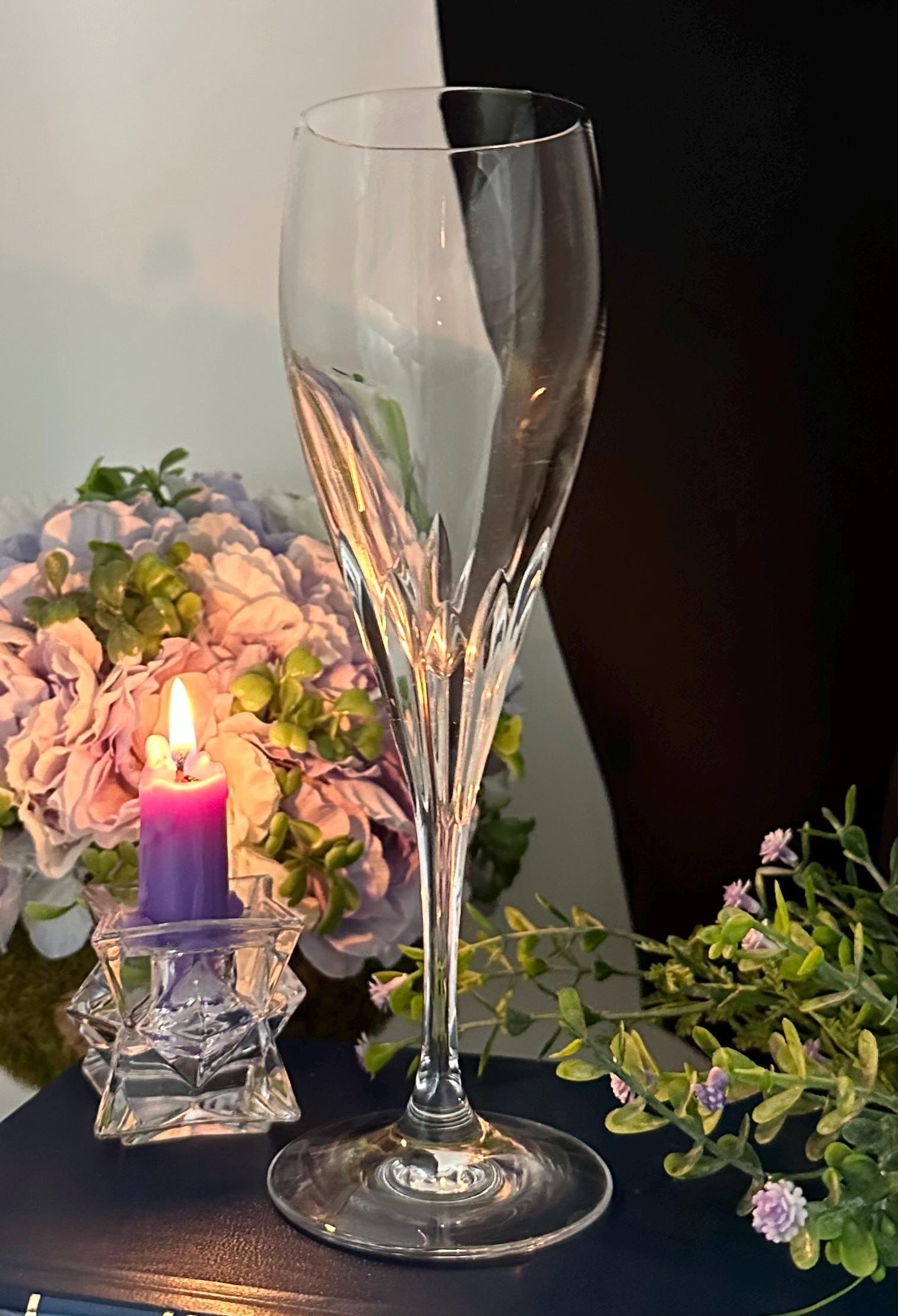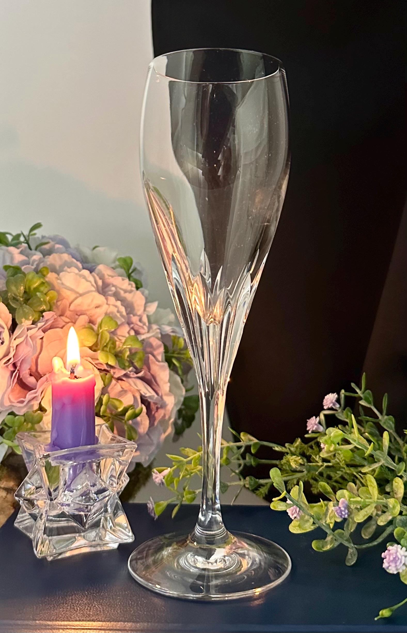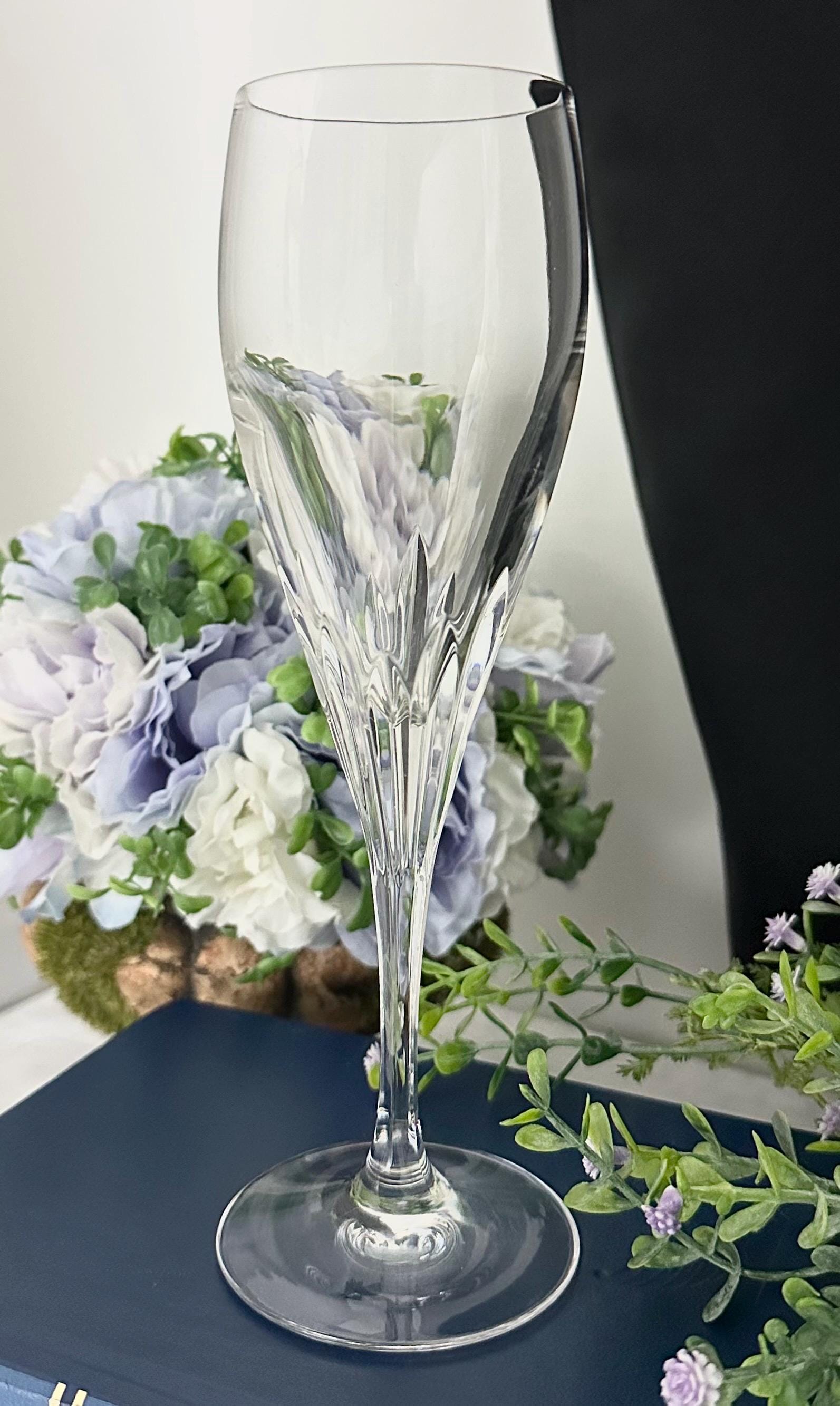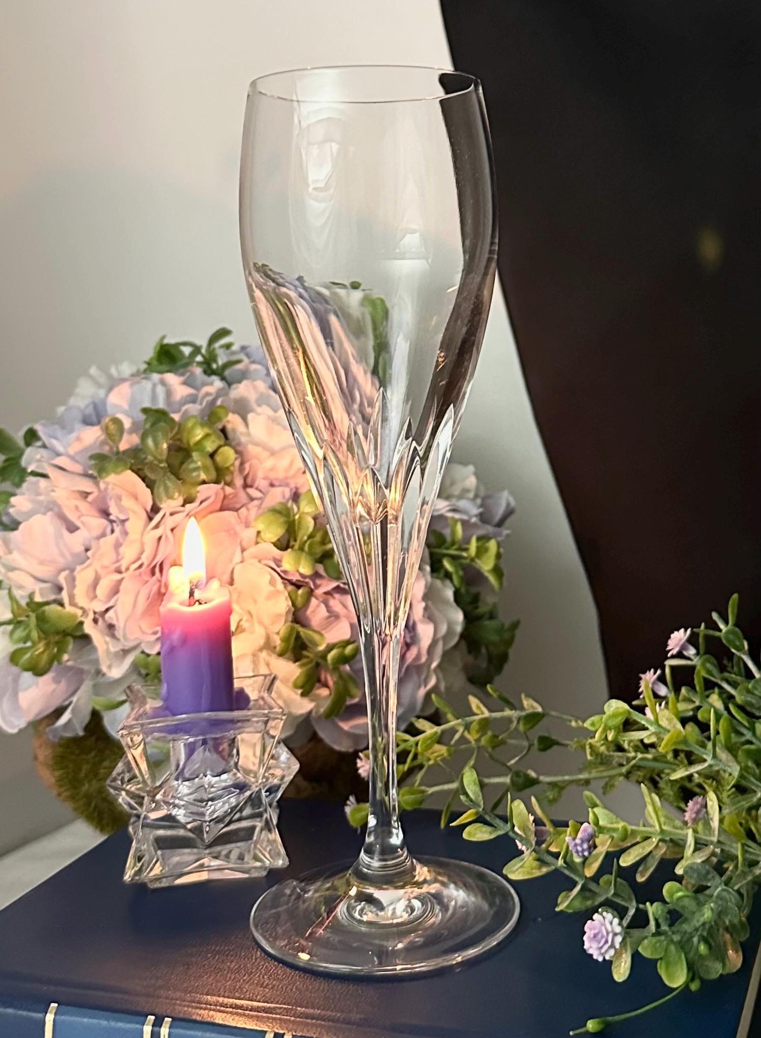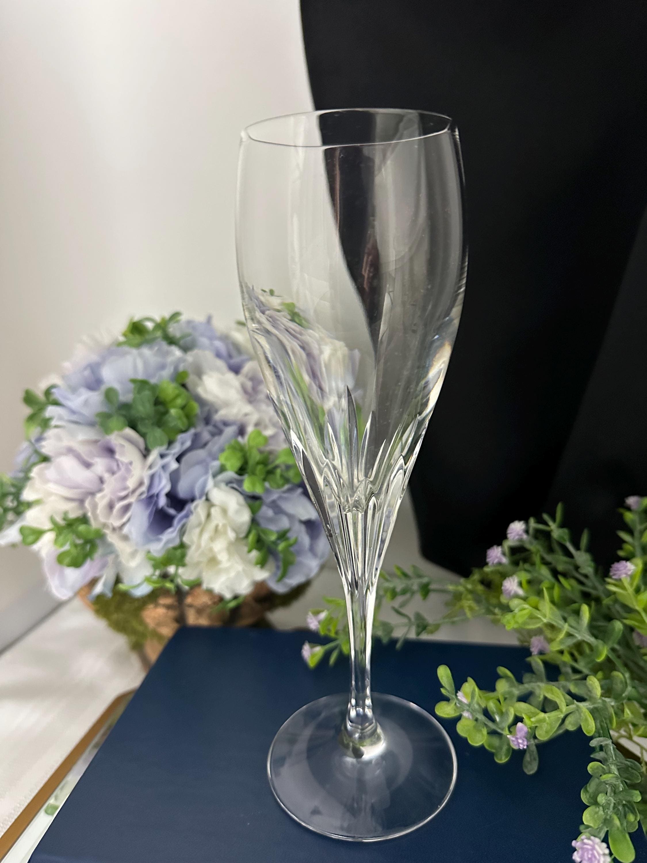 This is for 1 Turning Point Noritake Champagne Glass. This Vintage Turning Point Champagne Flute is a stylish and elegant toasting glass that is perfect for all celebration occasions. Made of clear glass with vertical cuts on the base of the bowl, this handmade champagne flute stands at 8 3/8 inches tall with a diameter of 2 1/4 inches.