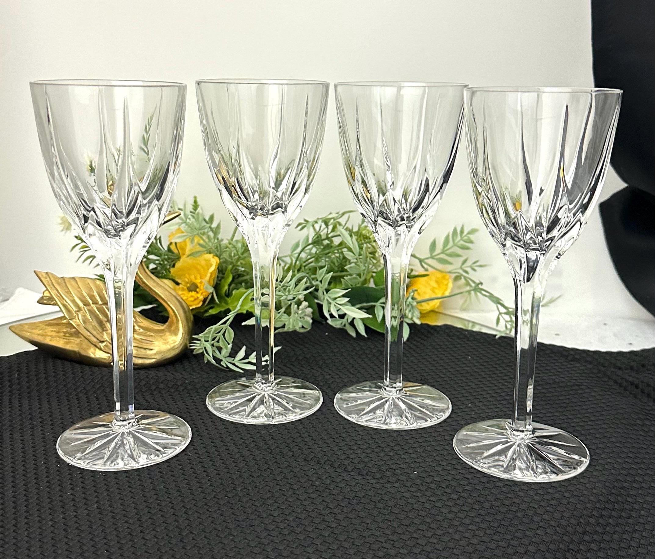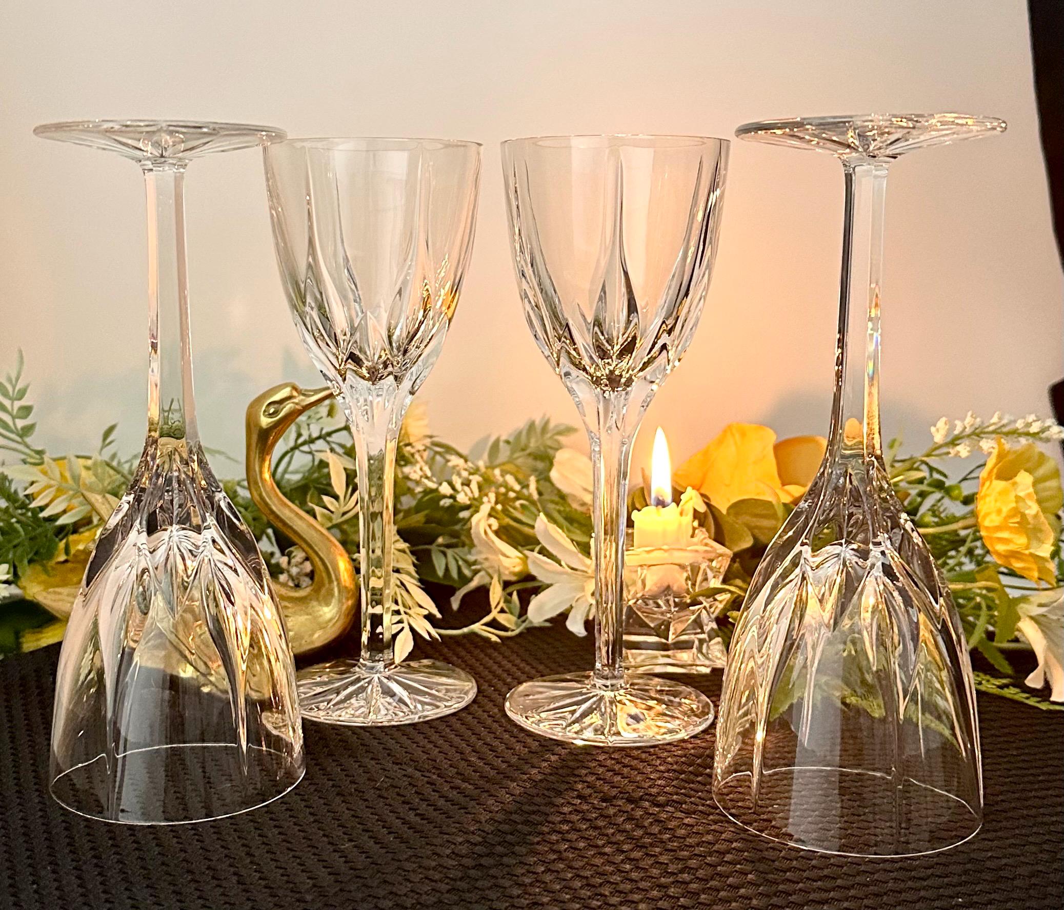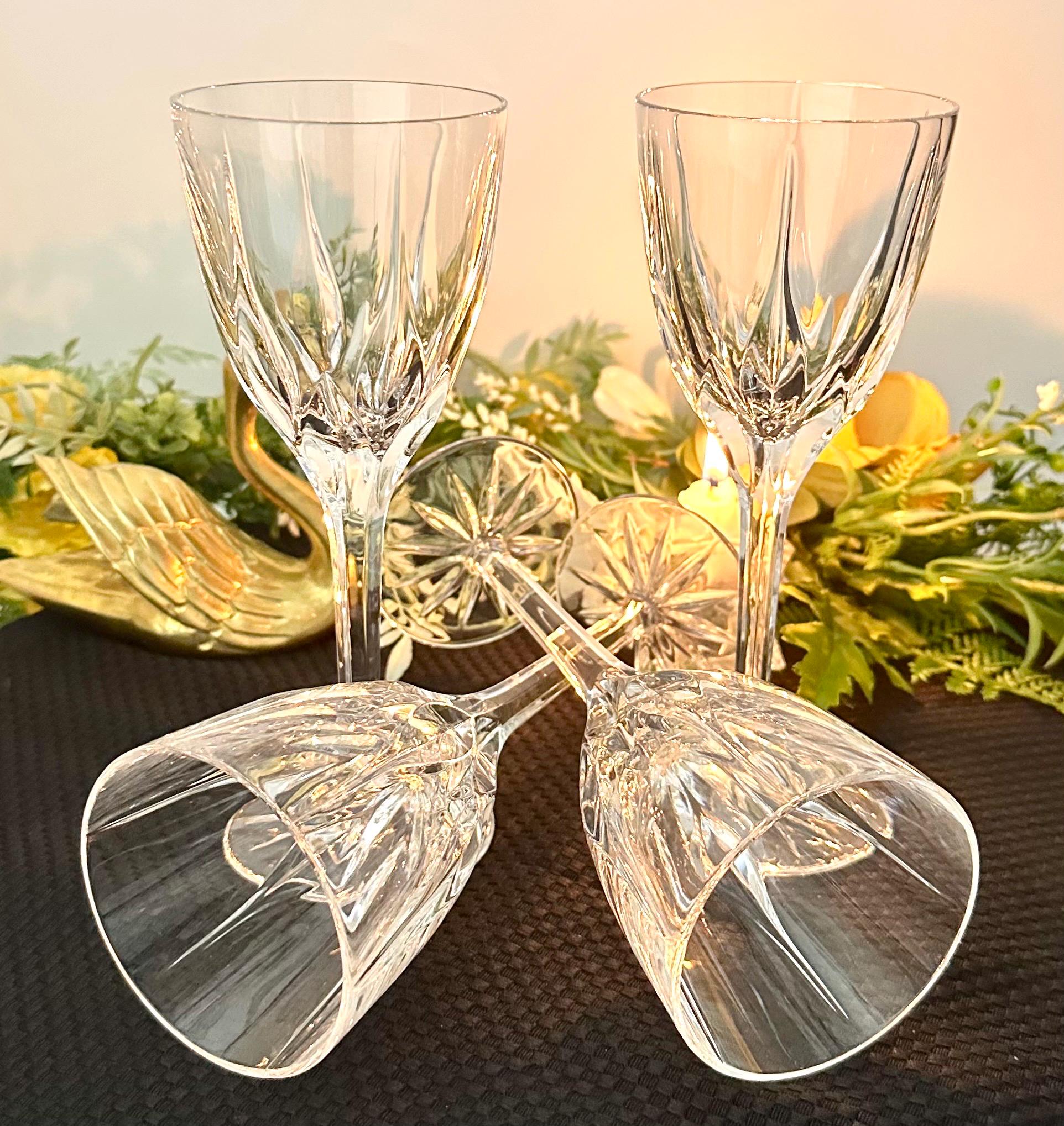 This is for a set of 4 Mikasa Apollo Wine glasses that were produced in 1991 to 2006. They are blown glass that measure: 7 5/8 inches tall x 3 inches diameter. They are clear with a leaf type cuts that lead to a multisided stem and a patterned foot.