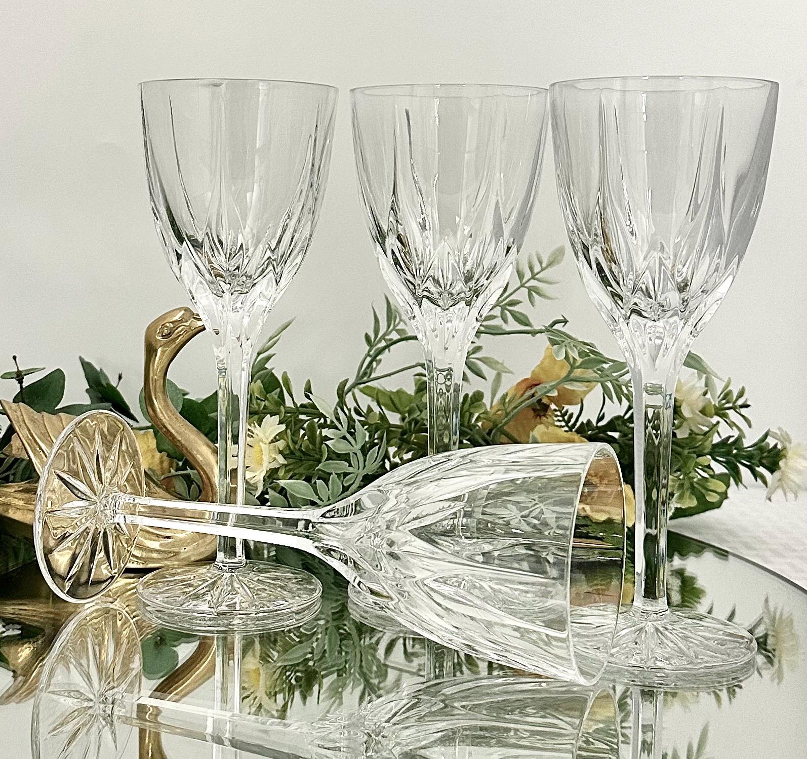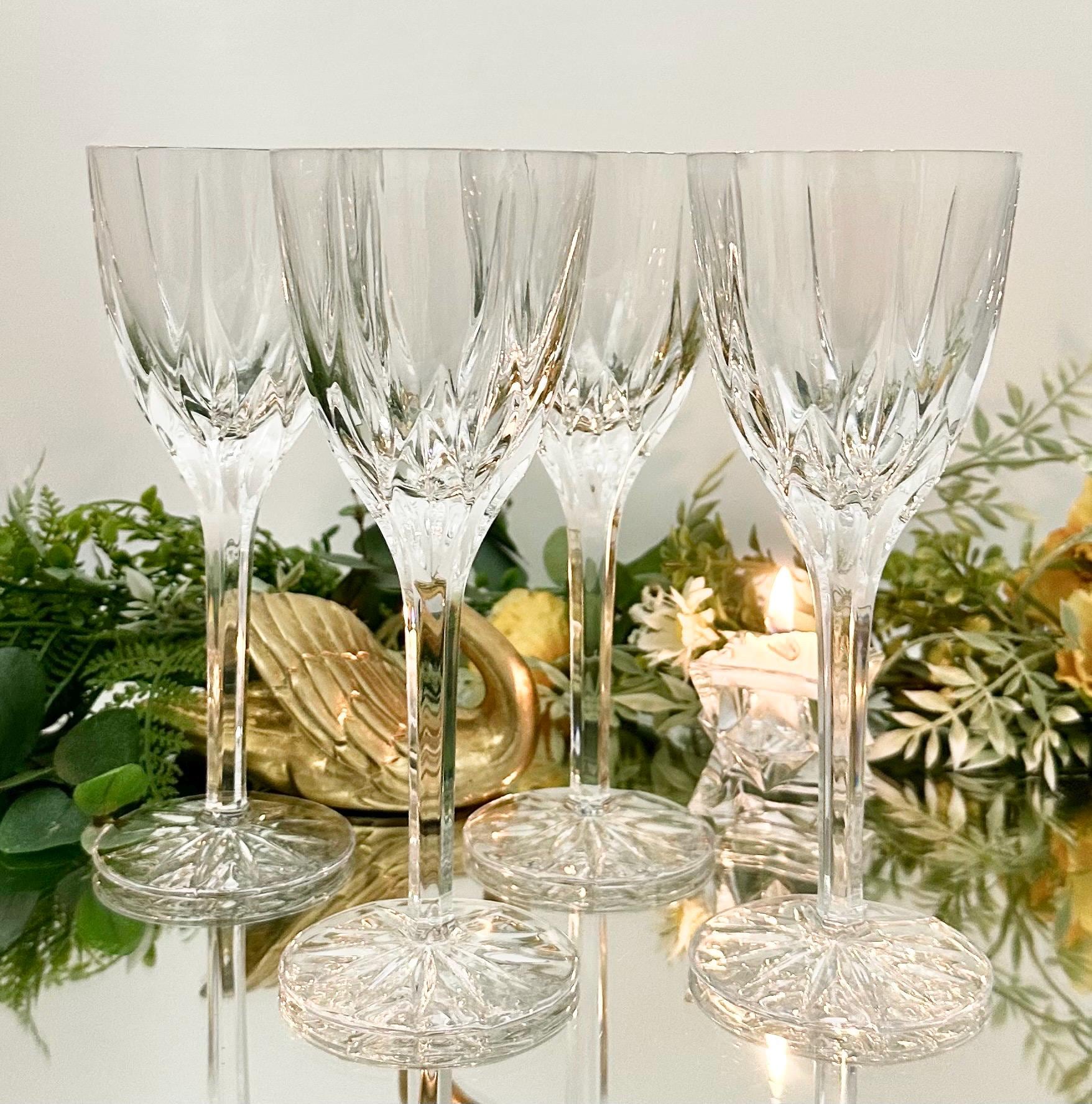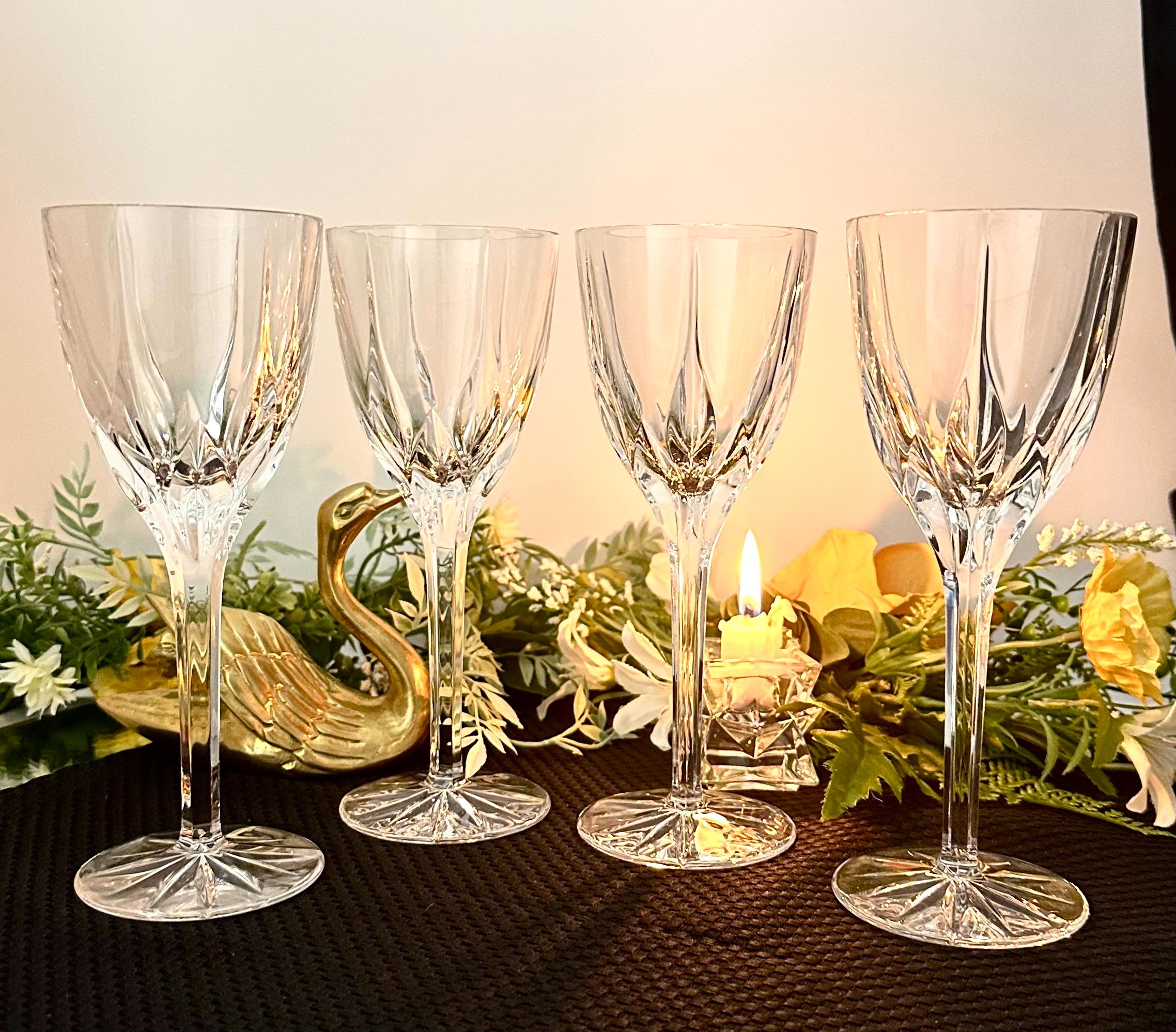 This is for a set of 4 Mikasa Apollo Wine glasses that were produced in 1991 to 2006. They are blown glass that measure: 7 5/8 inches tall x 3 inches diameter. They are clear with a leaf type cuts that lead to a multisided stem and a patterned foot.