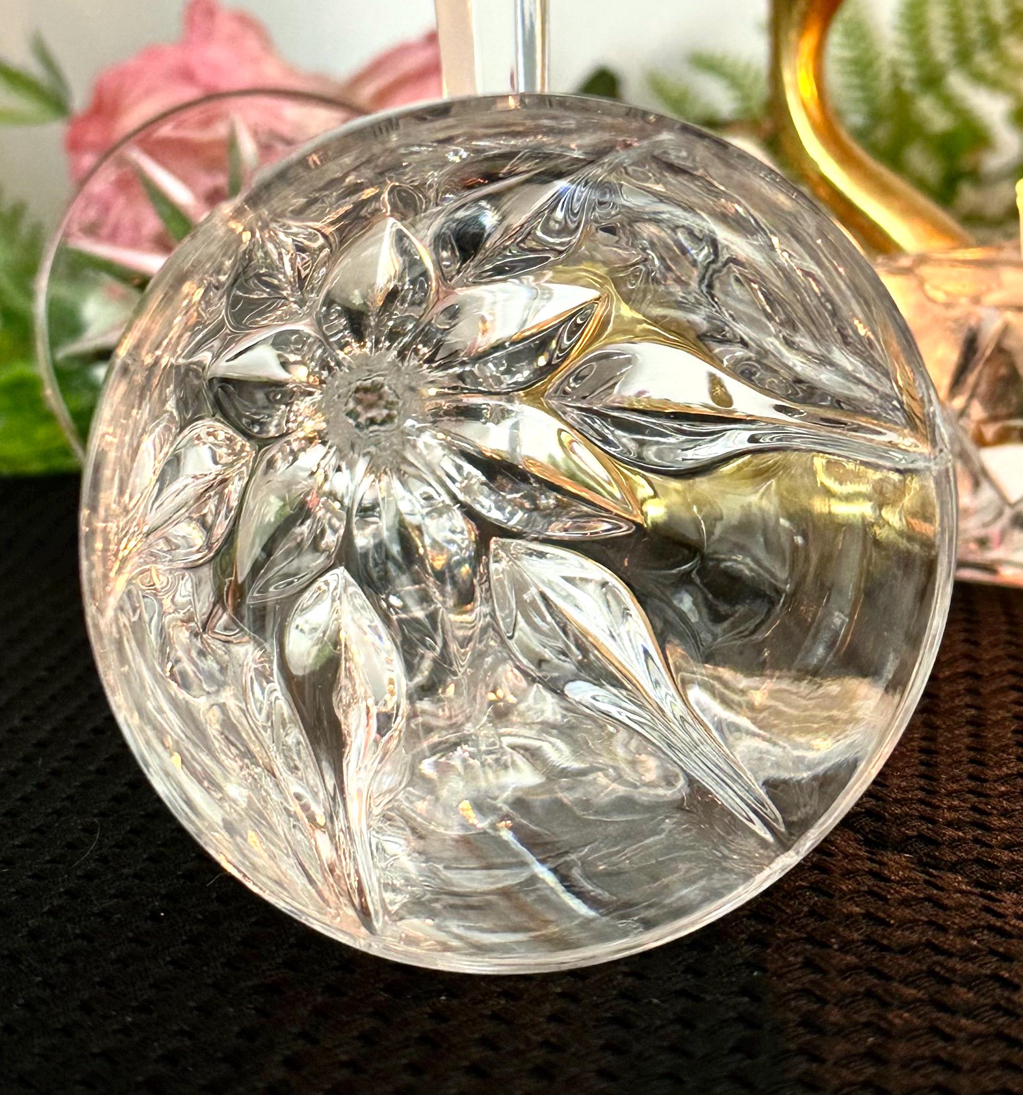 The Water Goblets are clear with leaf type cuts that lead to a multisided