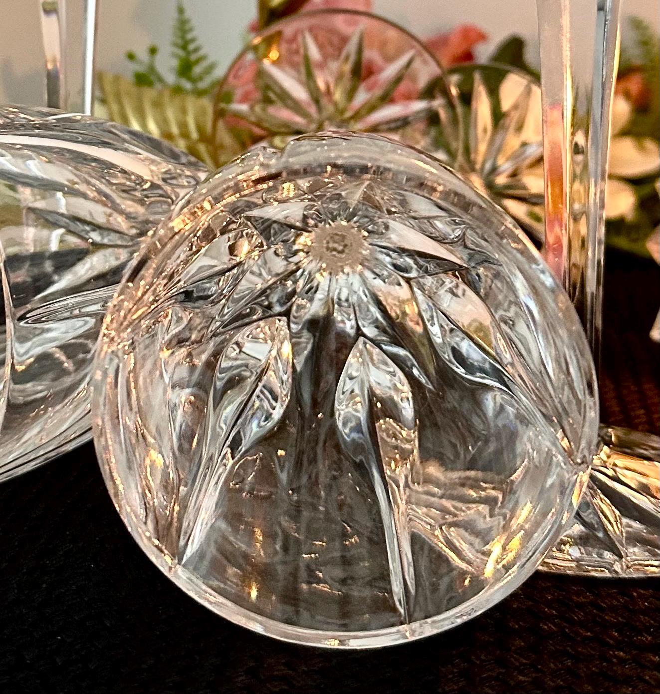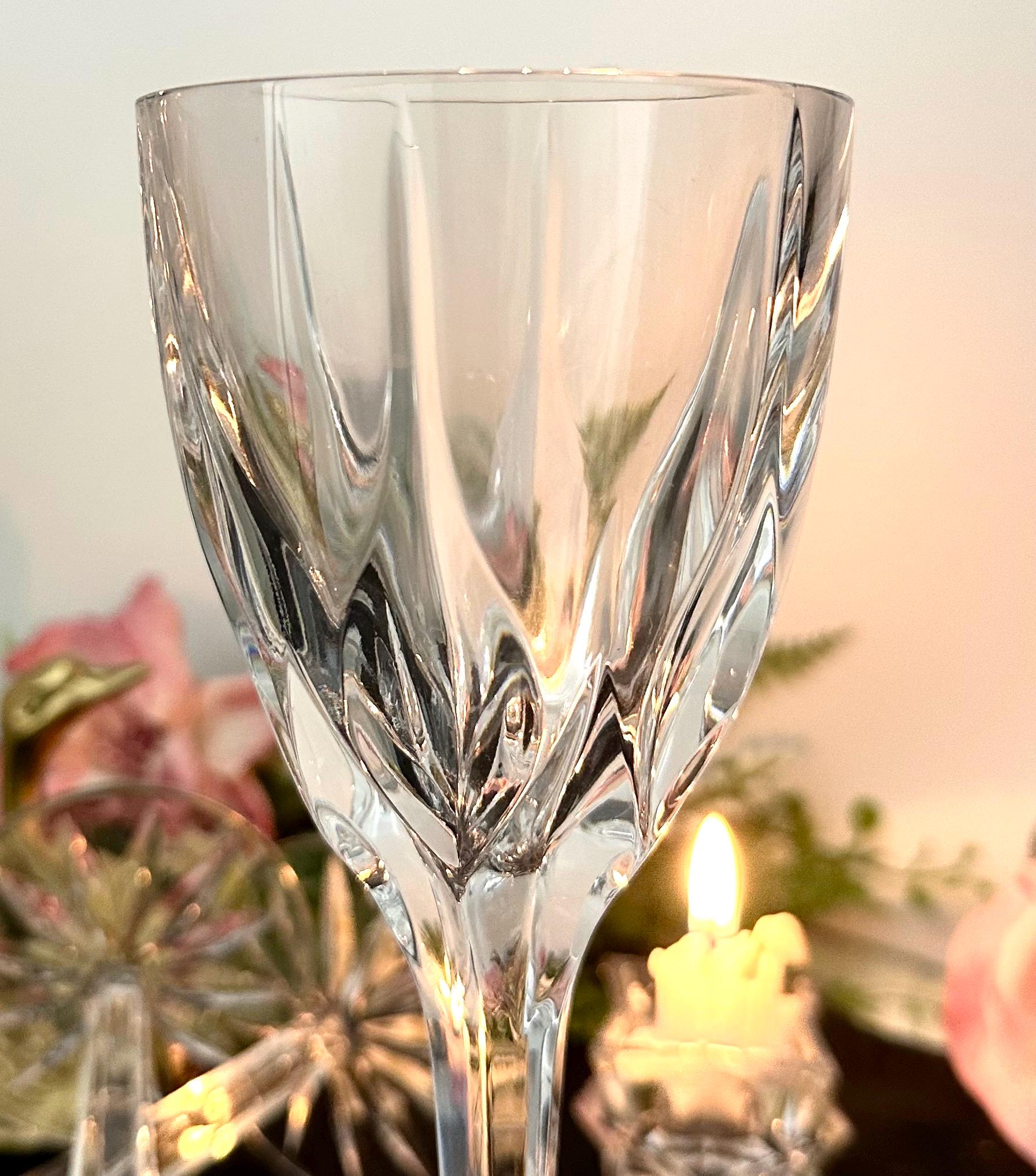 The Water Goblets are clear with leaf type cuts that lead to a multisided