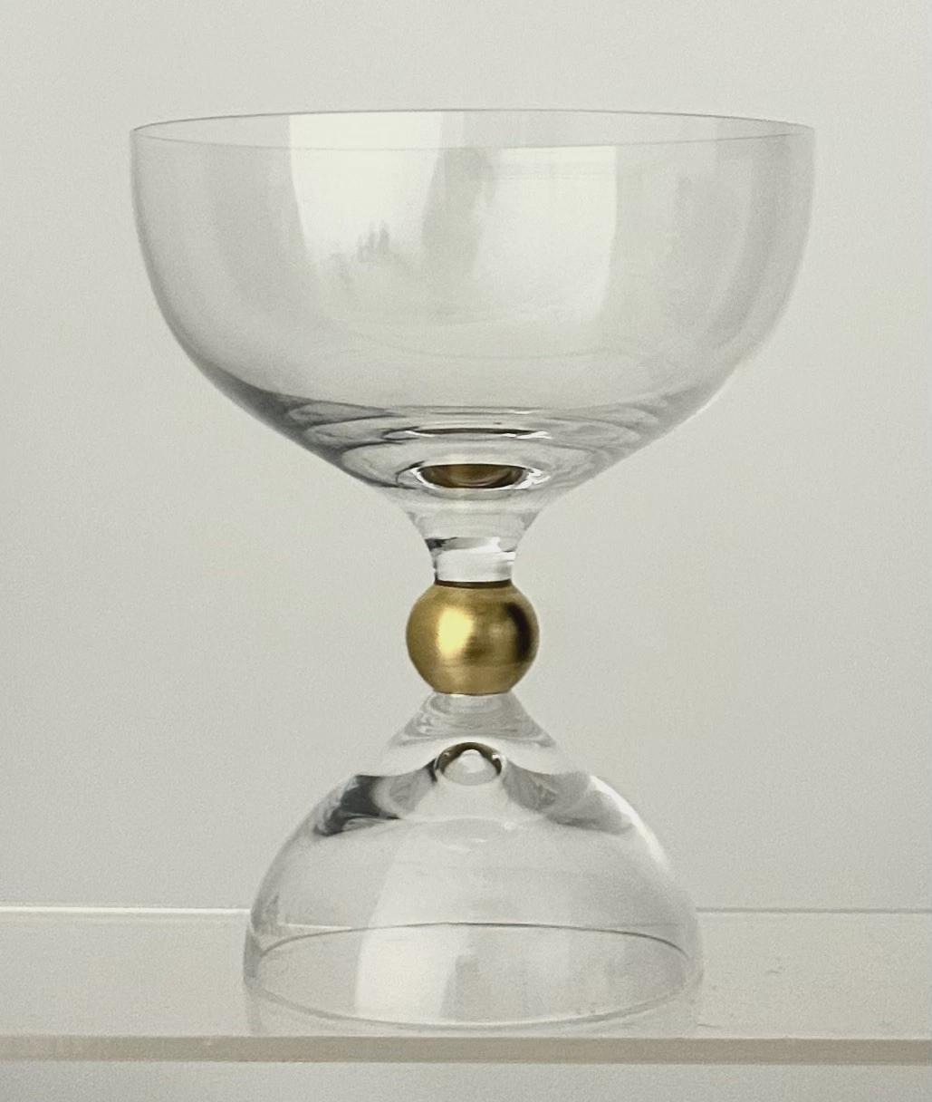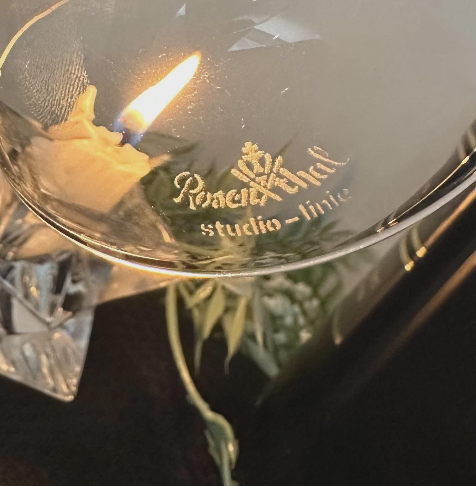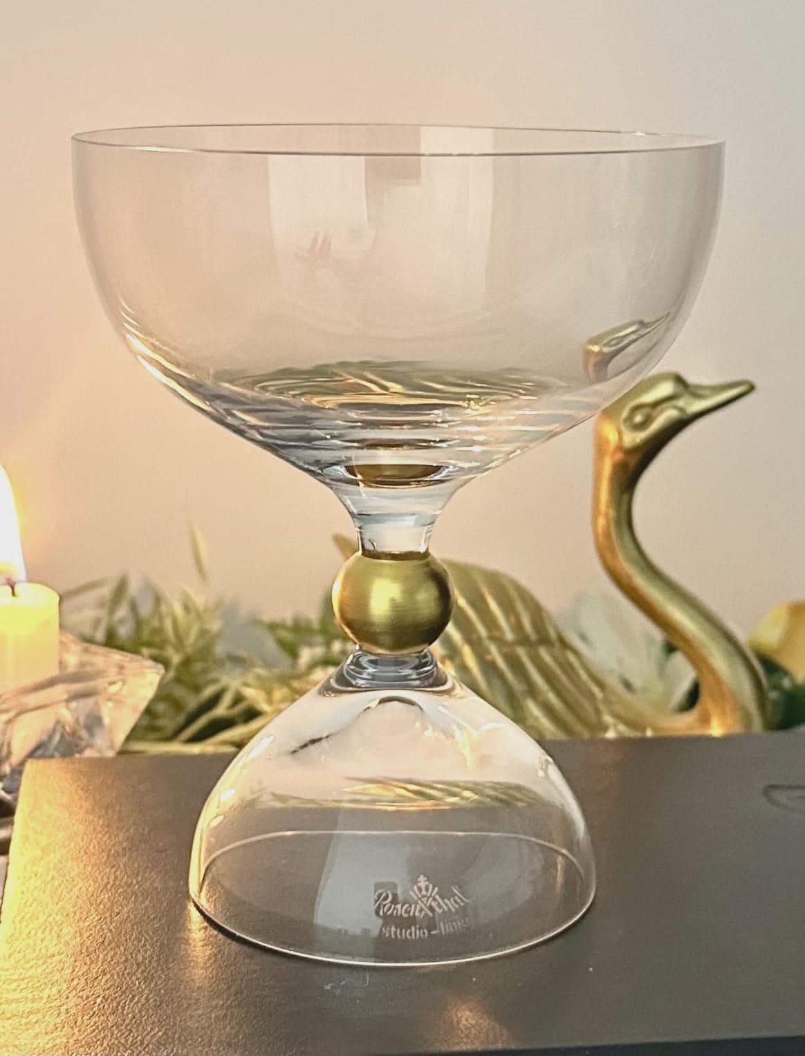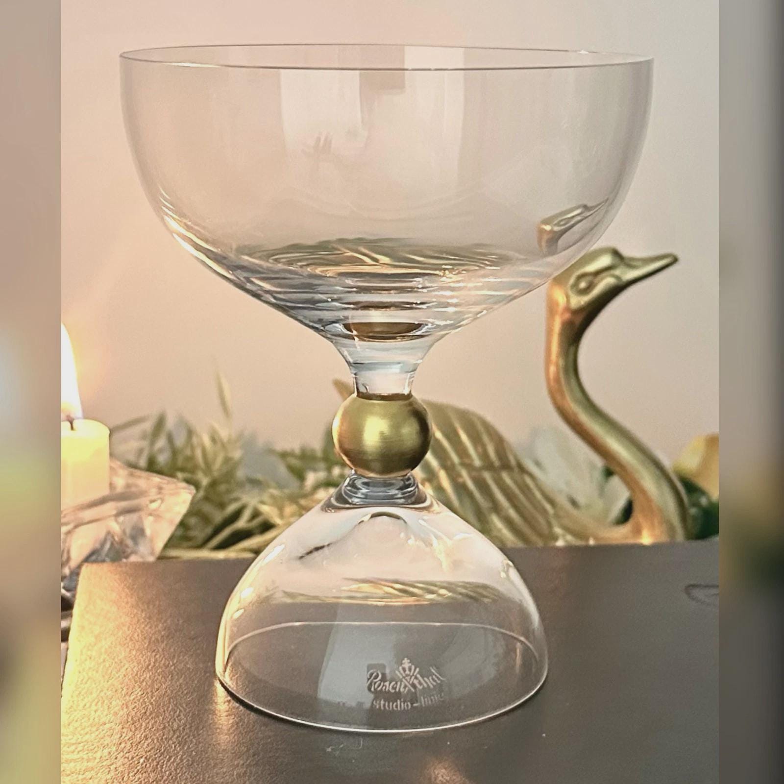 This is for 1 Rosenthal Magic Champagne / Tall Sherbet Glass. The Stem has a Gilt 24K Orb and is from the Studio Line. This beautiful MCM vintage Champagne Coupe is an elegant glass designed by Bjorn Wiinblad. The Rosenthal name and "Studio Line" are marked on the foot of the glass. This was hand crafted in Germany in the 1980s. The height for the glass is 4 7/8 inches and has a diameter of 4 inches.