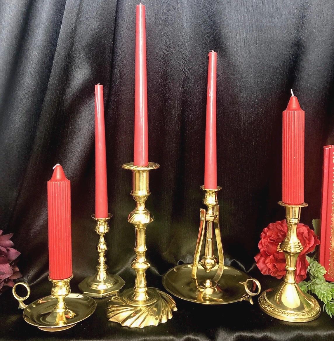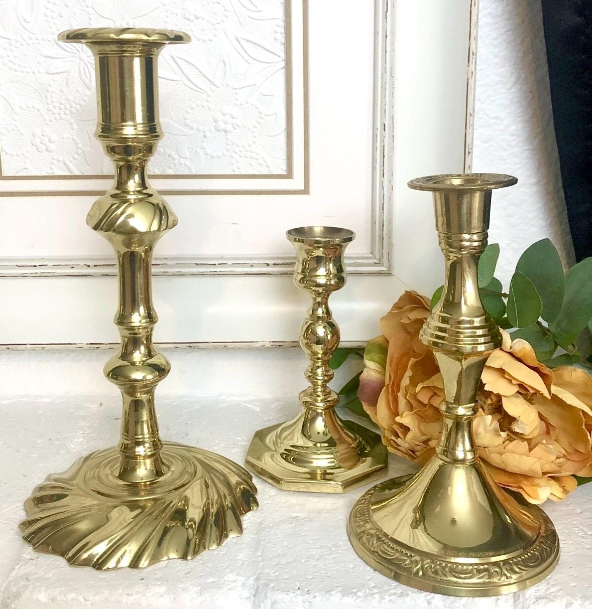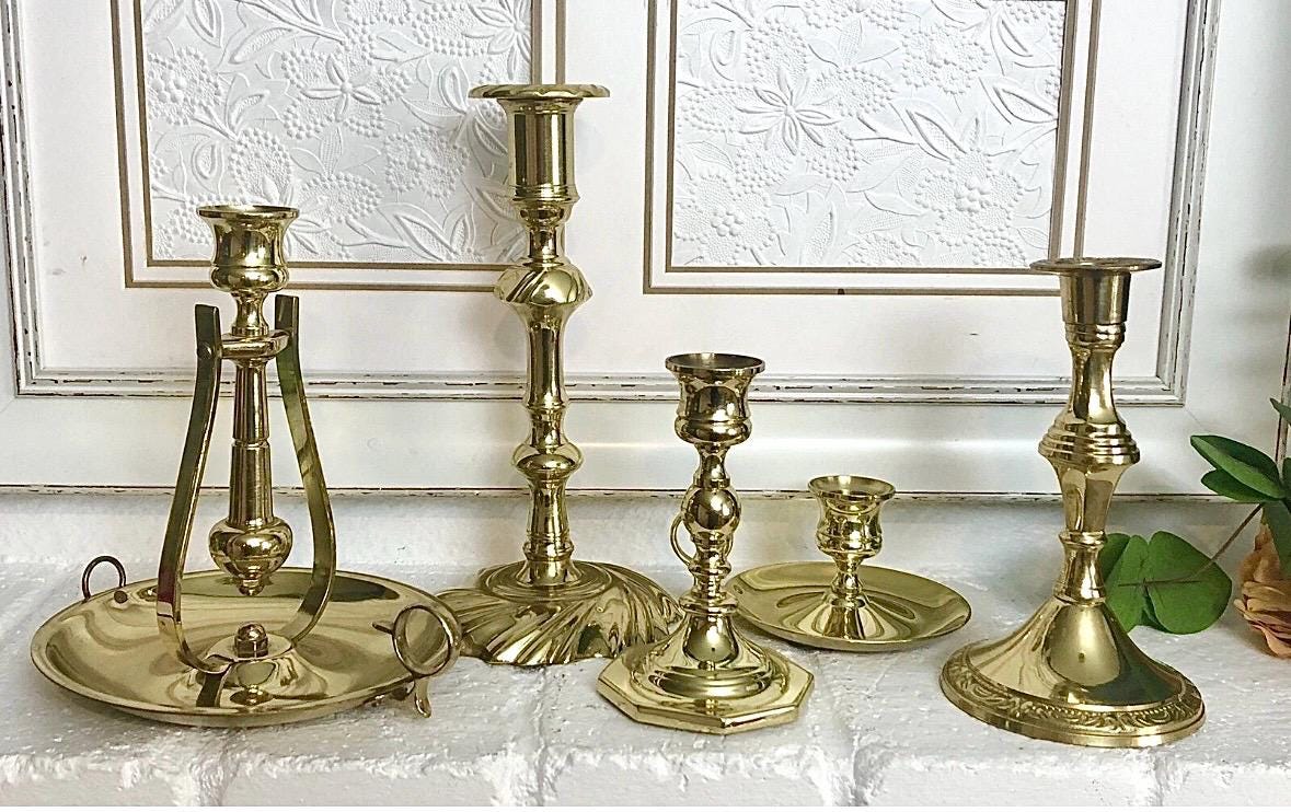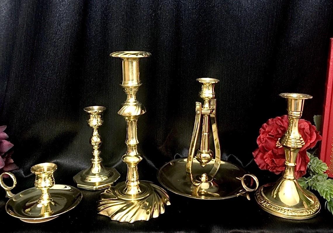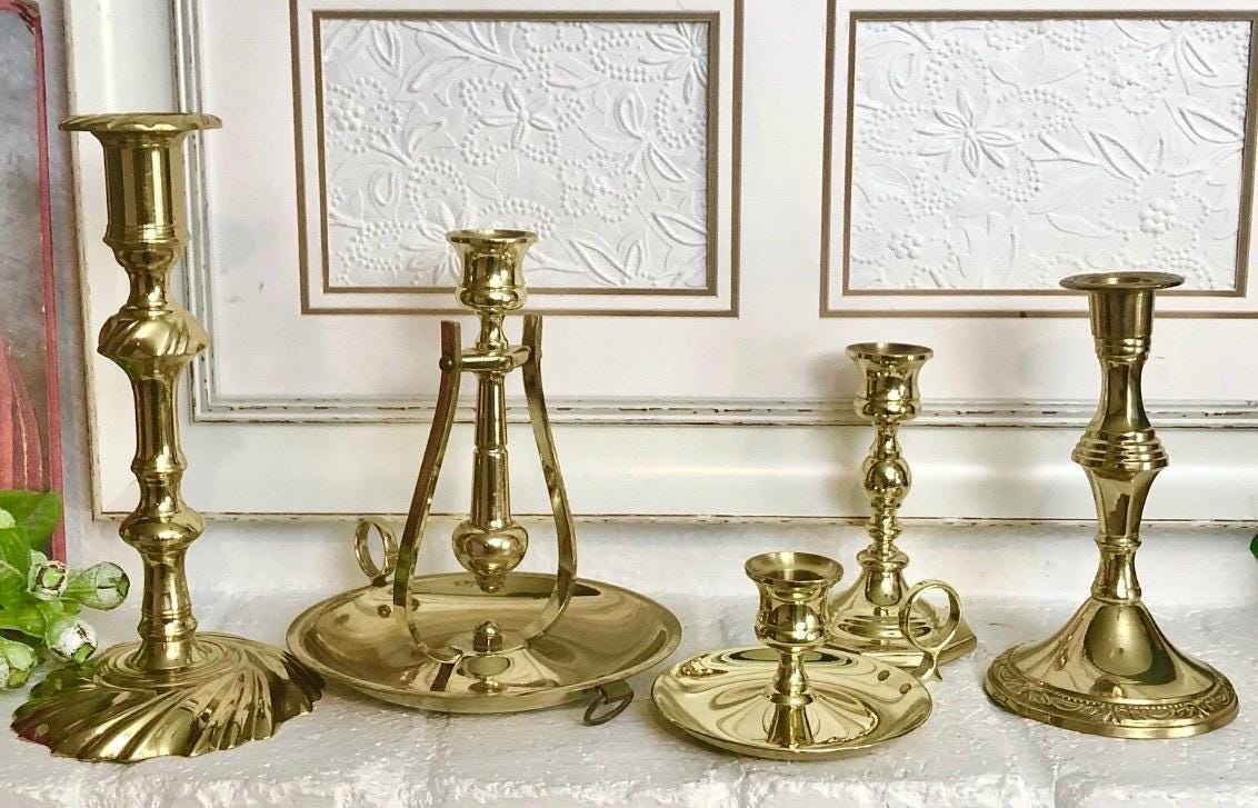 This is for a mixed lot of 5 Vintage Solid brass candle holders. These hold dinner taper candles and will great sitting together perhaps on a mantle or as part of a centerpiece. They are wonderful for weddings, buffet tables, or for the holidays. These are lacquered and won't need polishing.