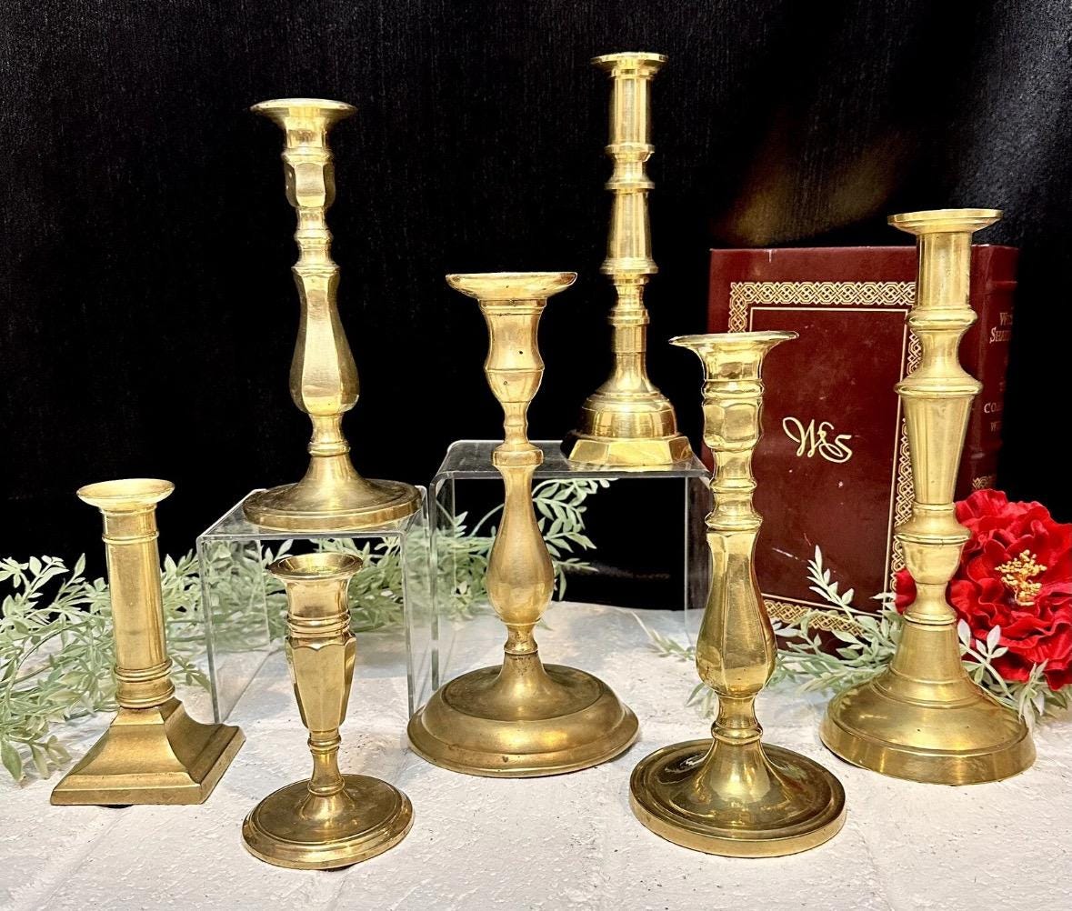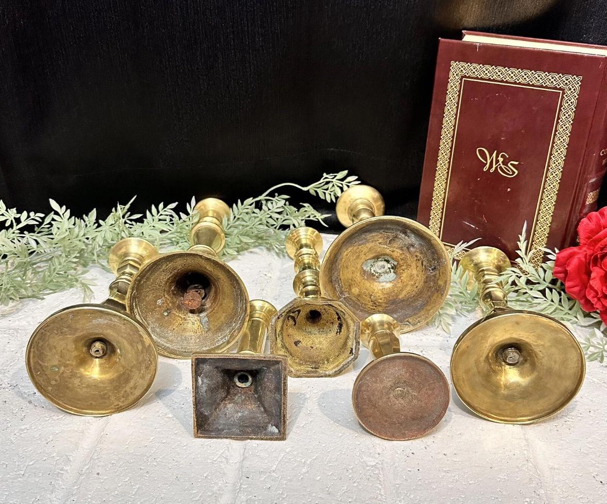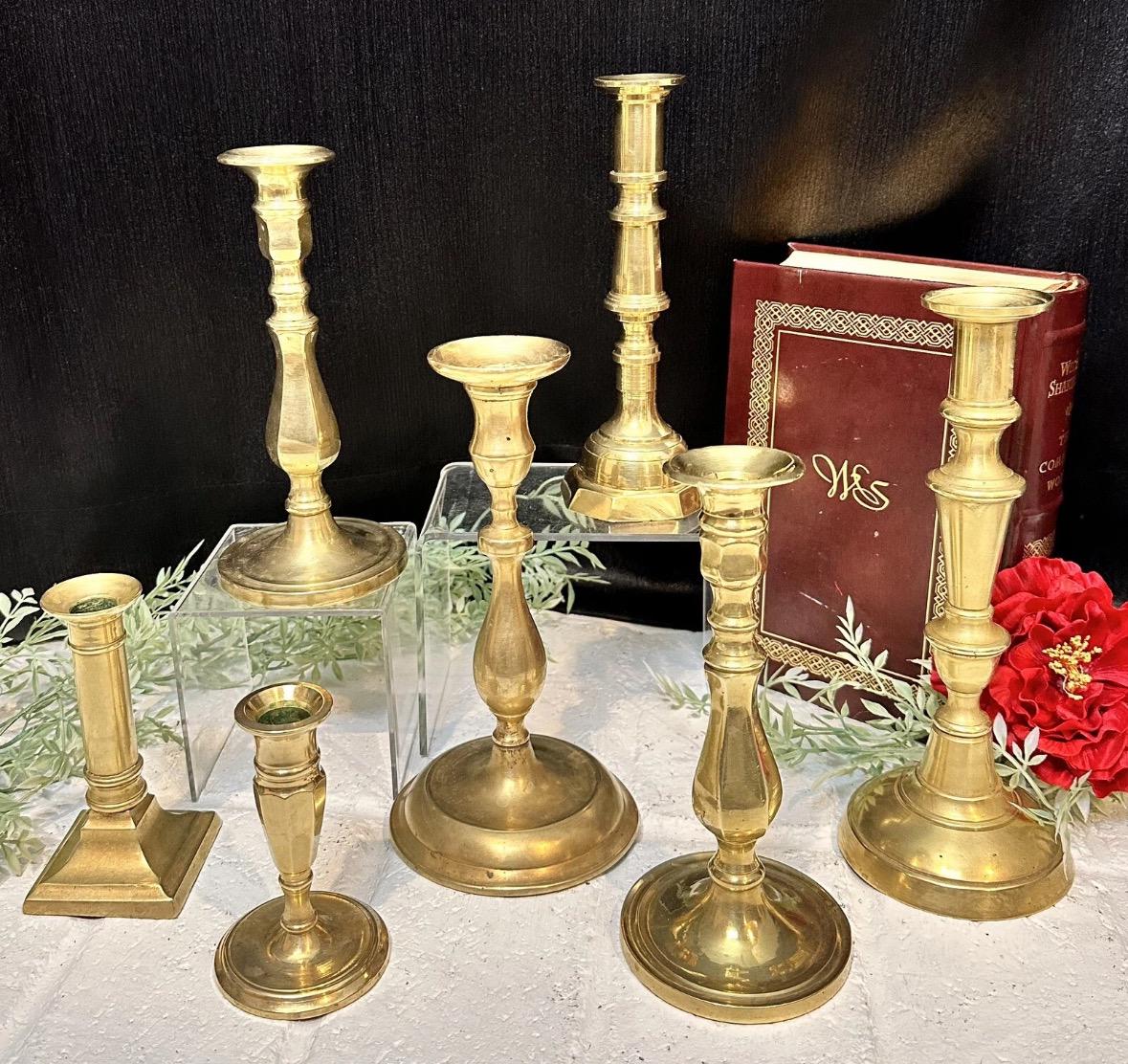 This is for a mixed lot of 7 Solid brass candle holders. This set of candlesticks are in what I refer to as English Brass due to the older deeper Gold color of the brass vs the newer brighter brass. These are not marked with makers names but when have had candle sticks this color of brass they have been English or Older American makers and the brass is always thicker and they weigh more then most.