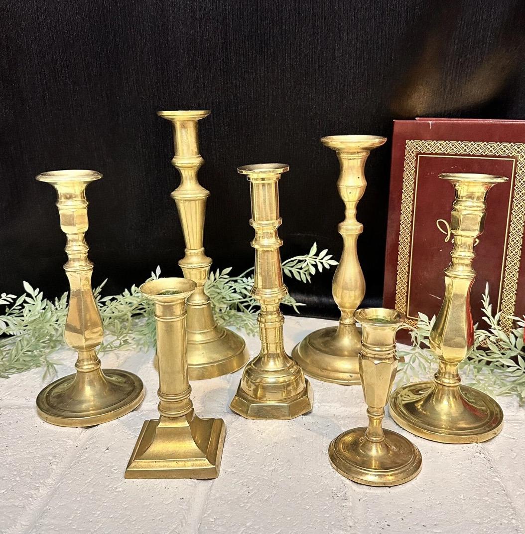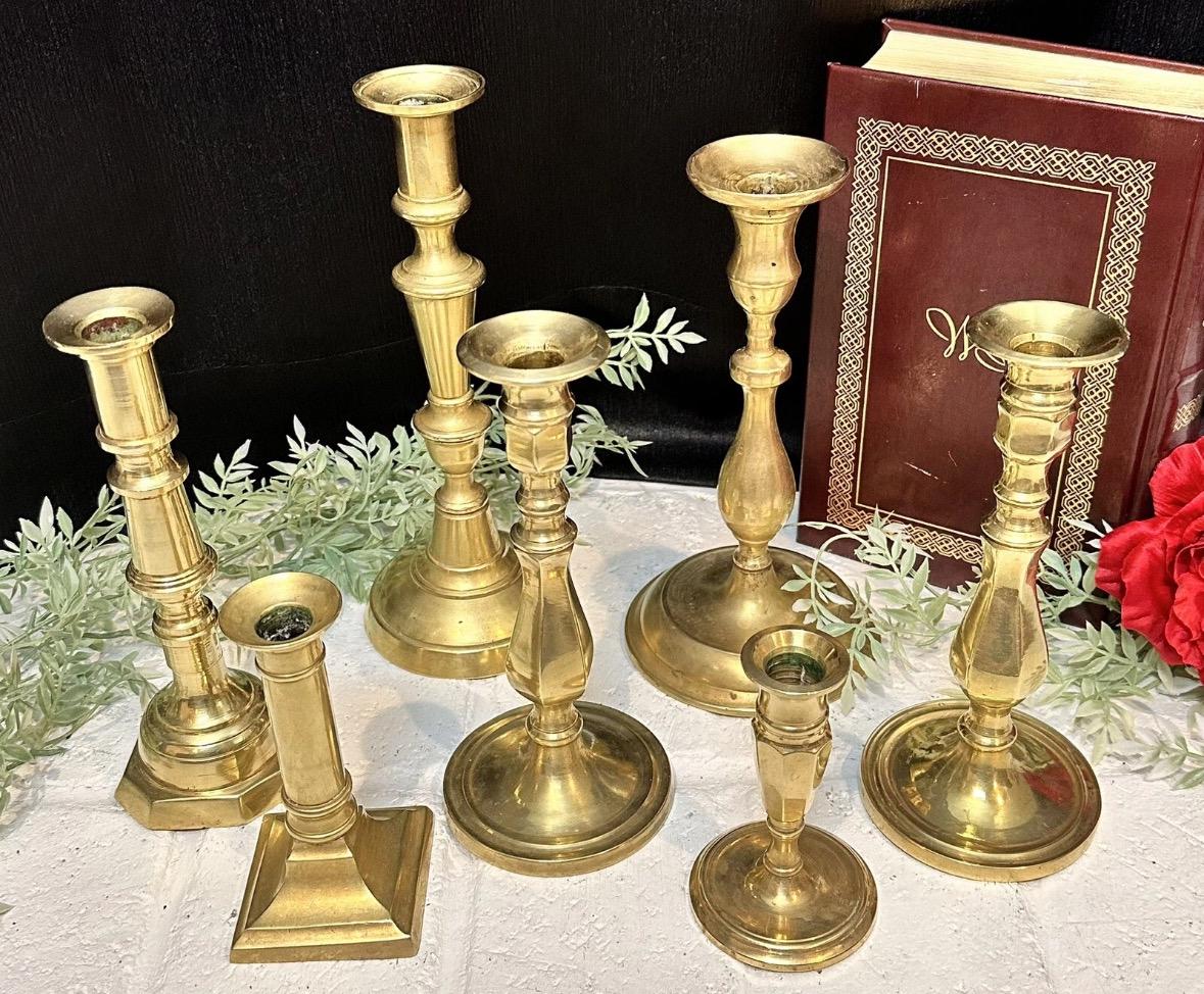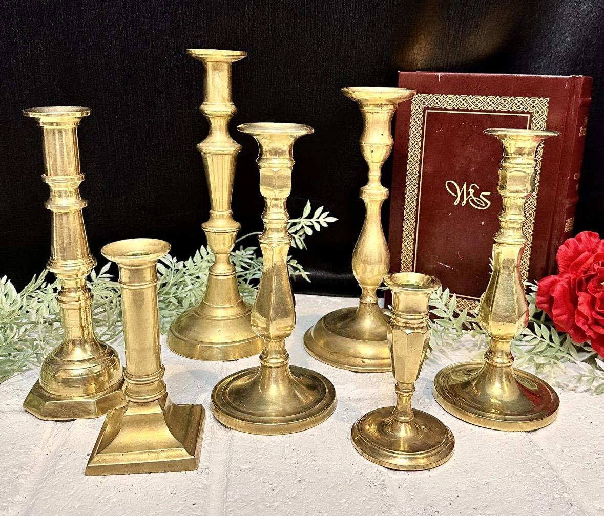 This is for a mixed lot of 7 Solid brass candle holders. This set of candlesticks are in what I refer to as English Brass due to the older deeper Gold color of the brass vs the newer brighter brass. These are not marked with makers names but when have had candle sticks this color of brass they have been English or Older American makers and the brass is always thicker and they weigh more then most.