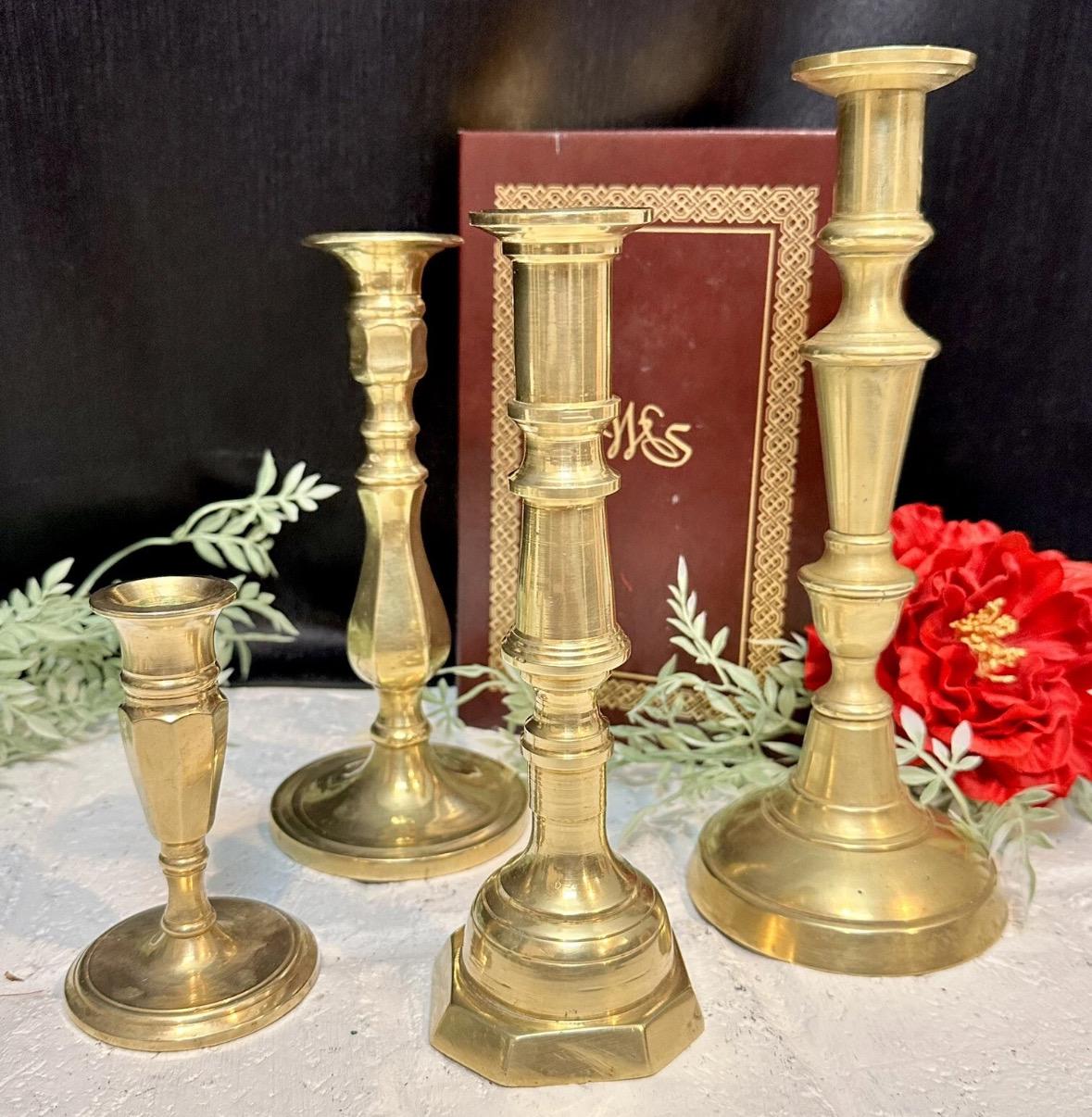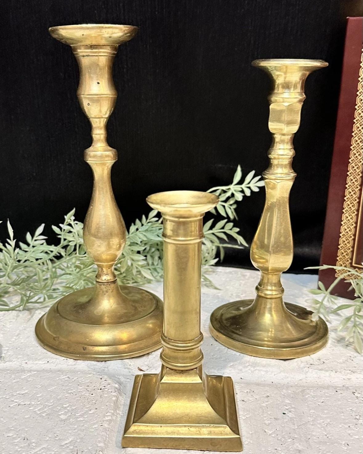 These Vintage candlesticks hold dinner / taper candles. The brass candle holders and will look great sitting together perhaps on a mantle or as part of a centerpiece. They are wonderful for weddings, buffet tables, or for the holidays. These are polished solid brass and not lacquered - and will gain a patina over time. With the size differences in the candle holders these are pretty even without candles in them to bring some shine to any place they are used.