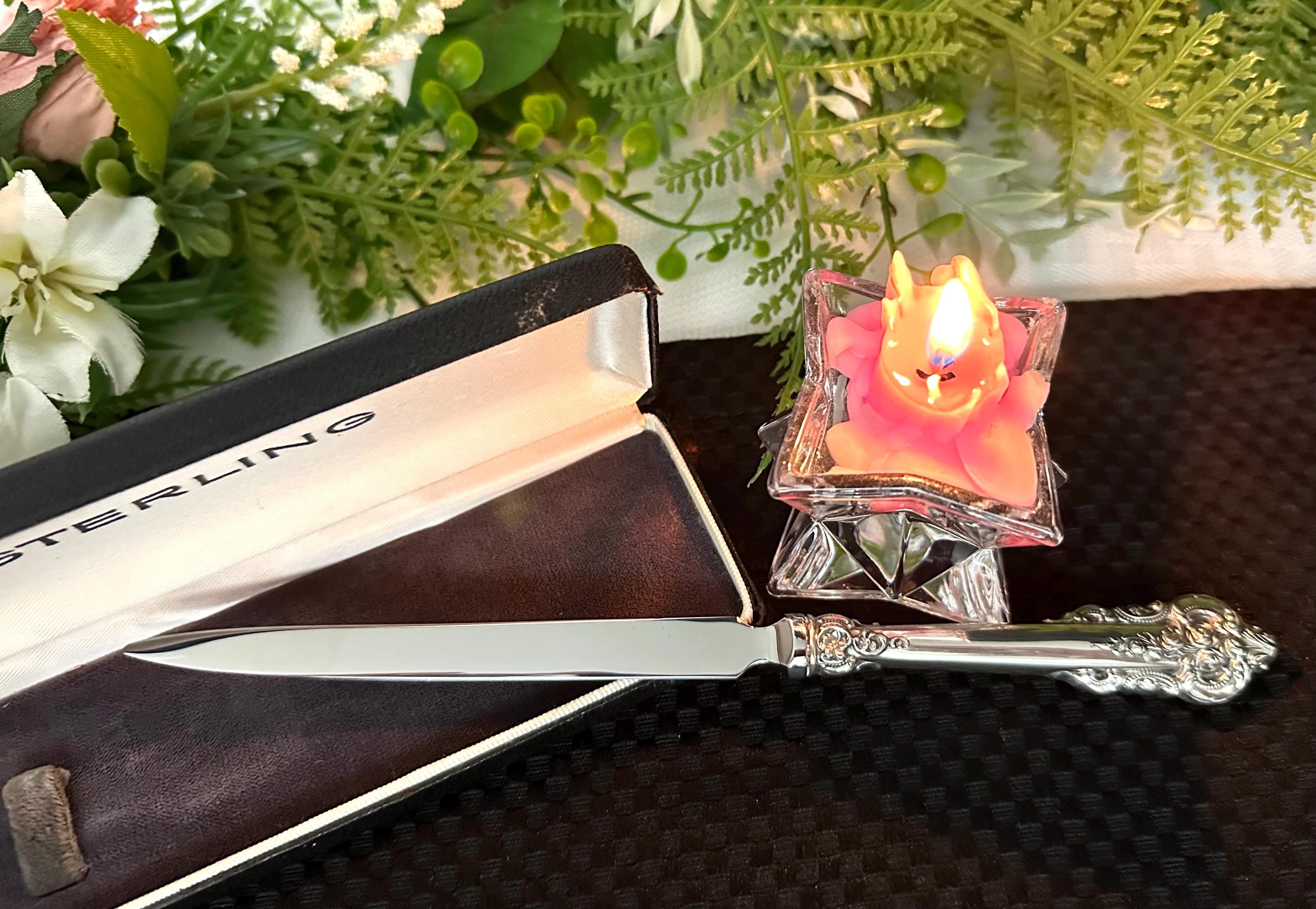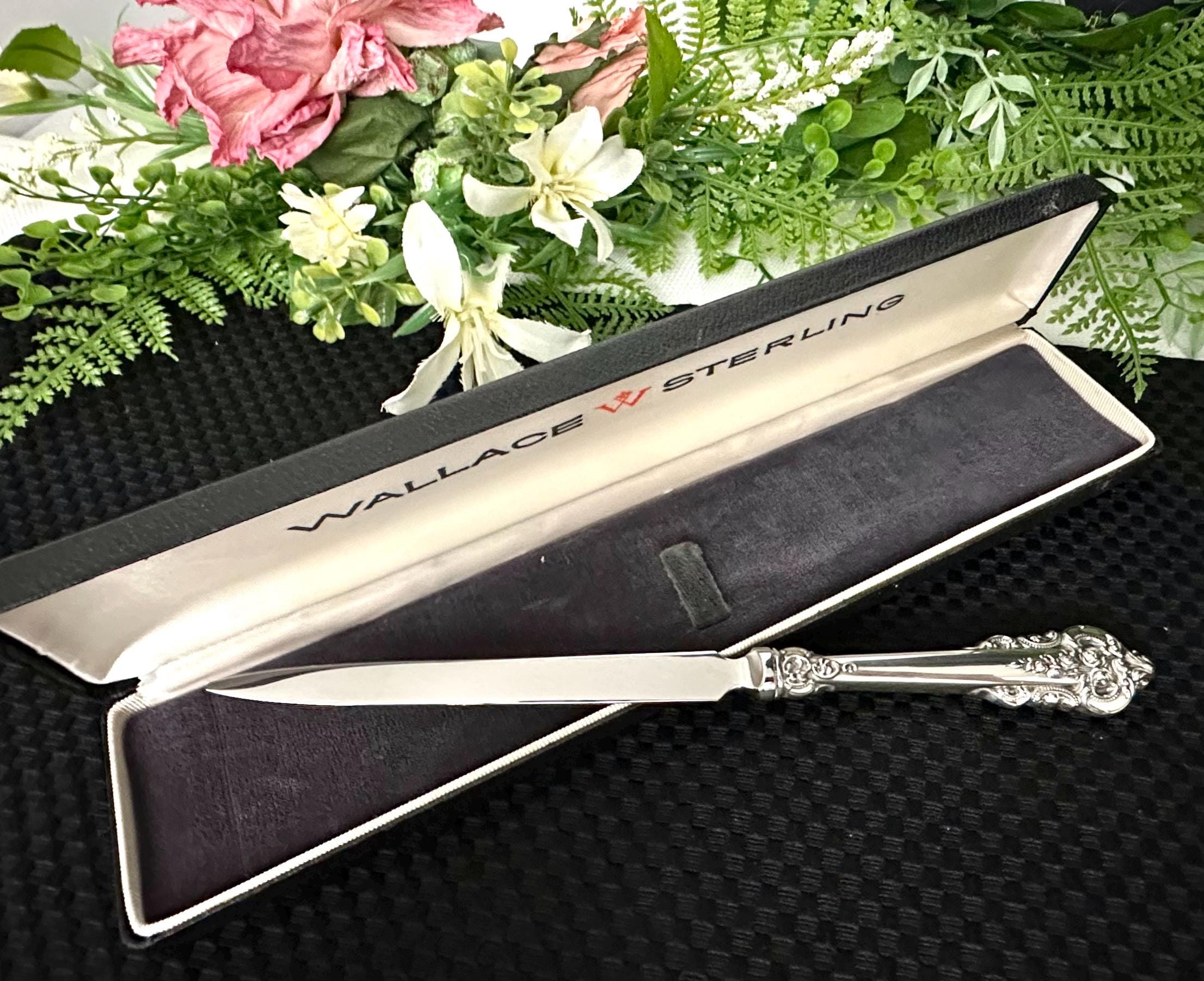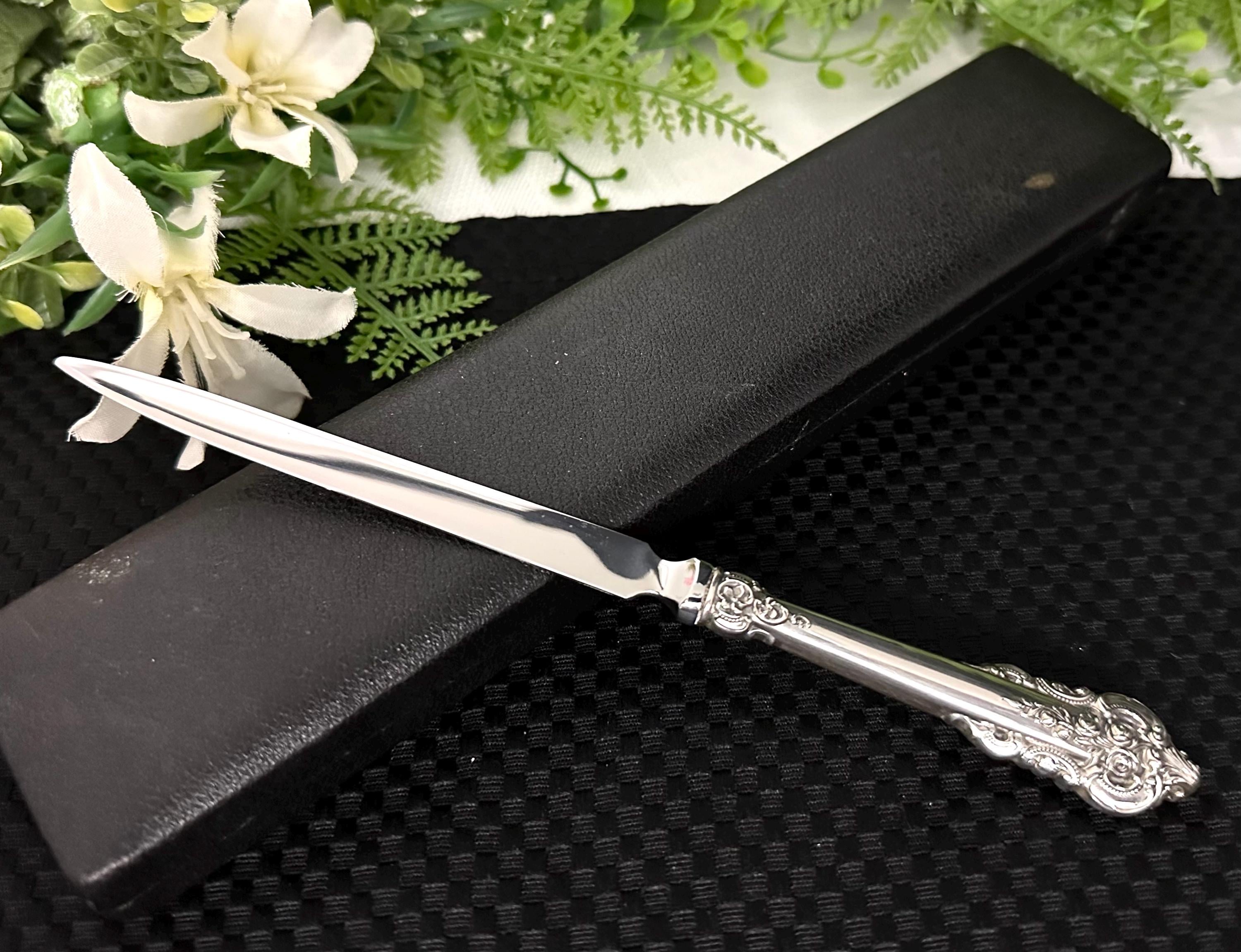 This is for a vintage Sterling silver Gorham Grand Baroque Letter Opener. This is a luxurious and elegant desk accessory made from sterling silver with a stainless blade. The pieces measures 7.75 inches long x 3/4 inches wide. This comes with the original box.