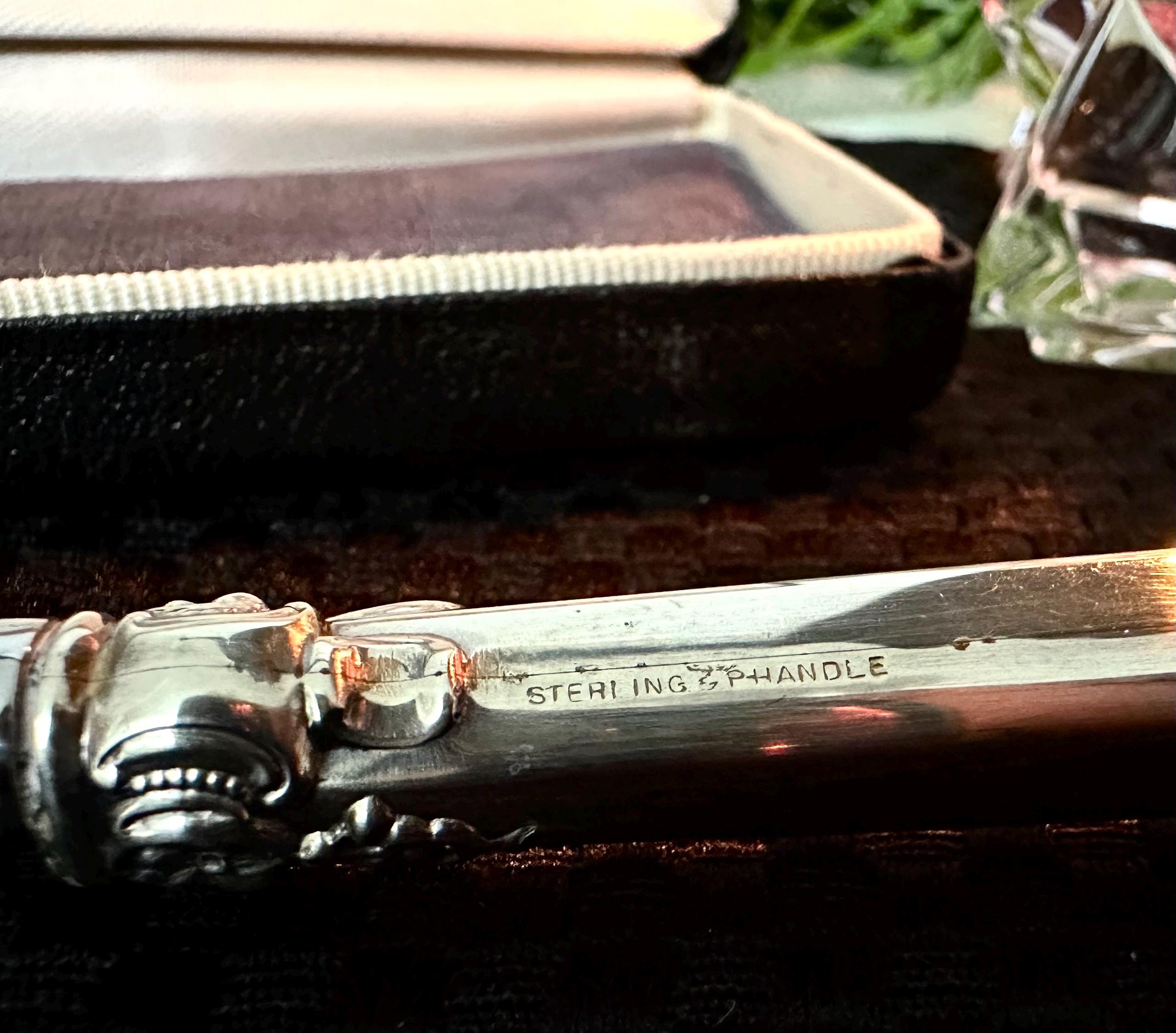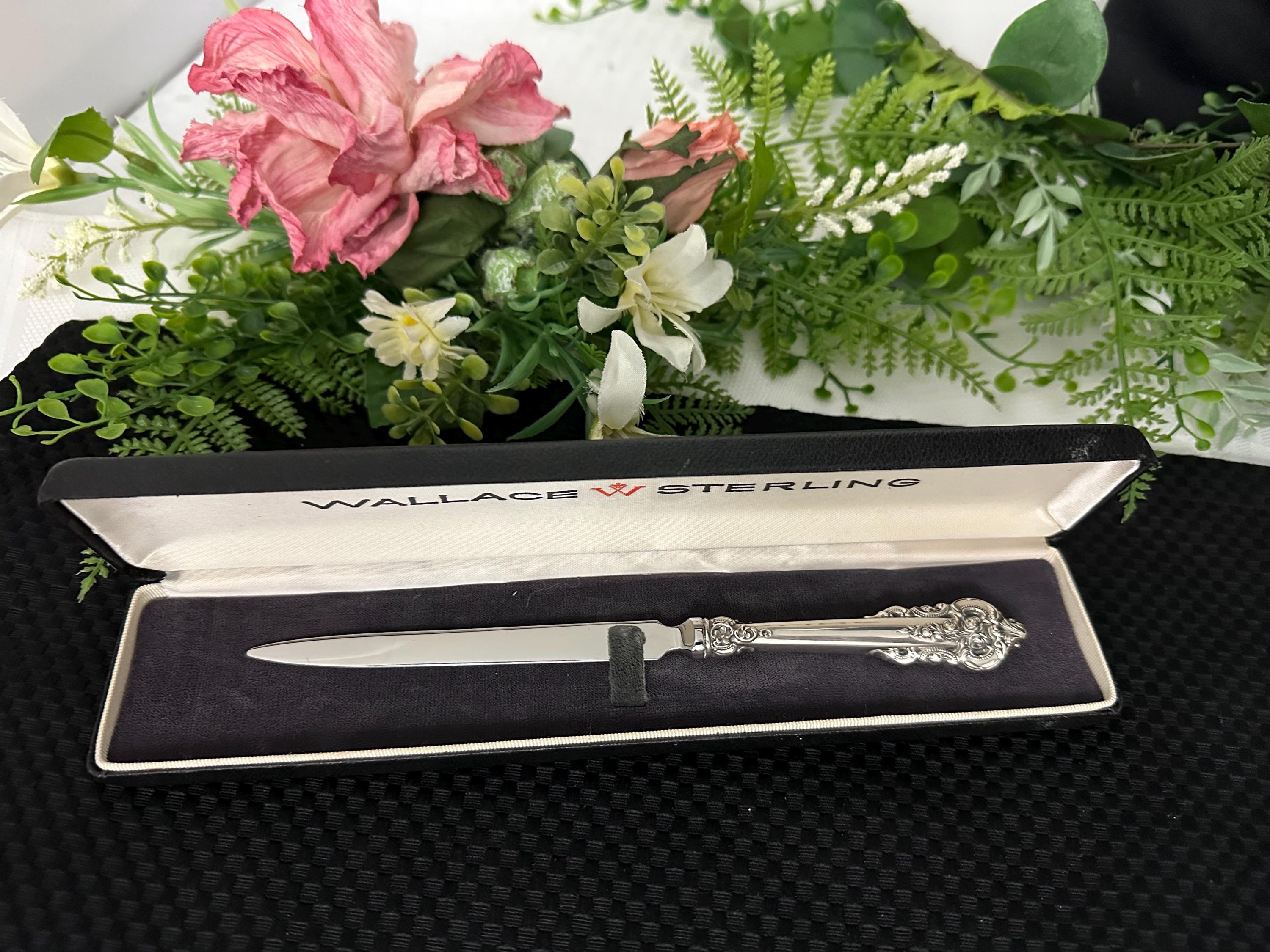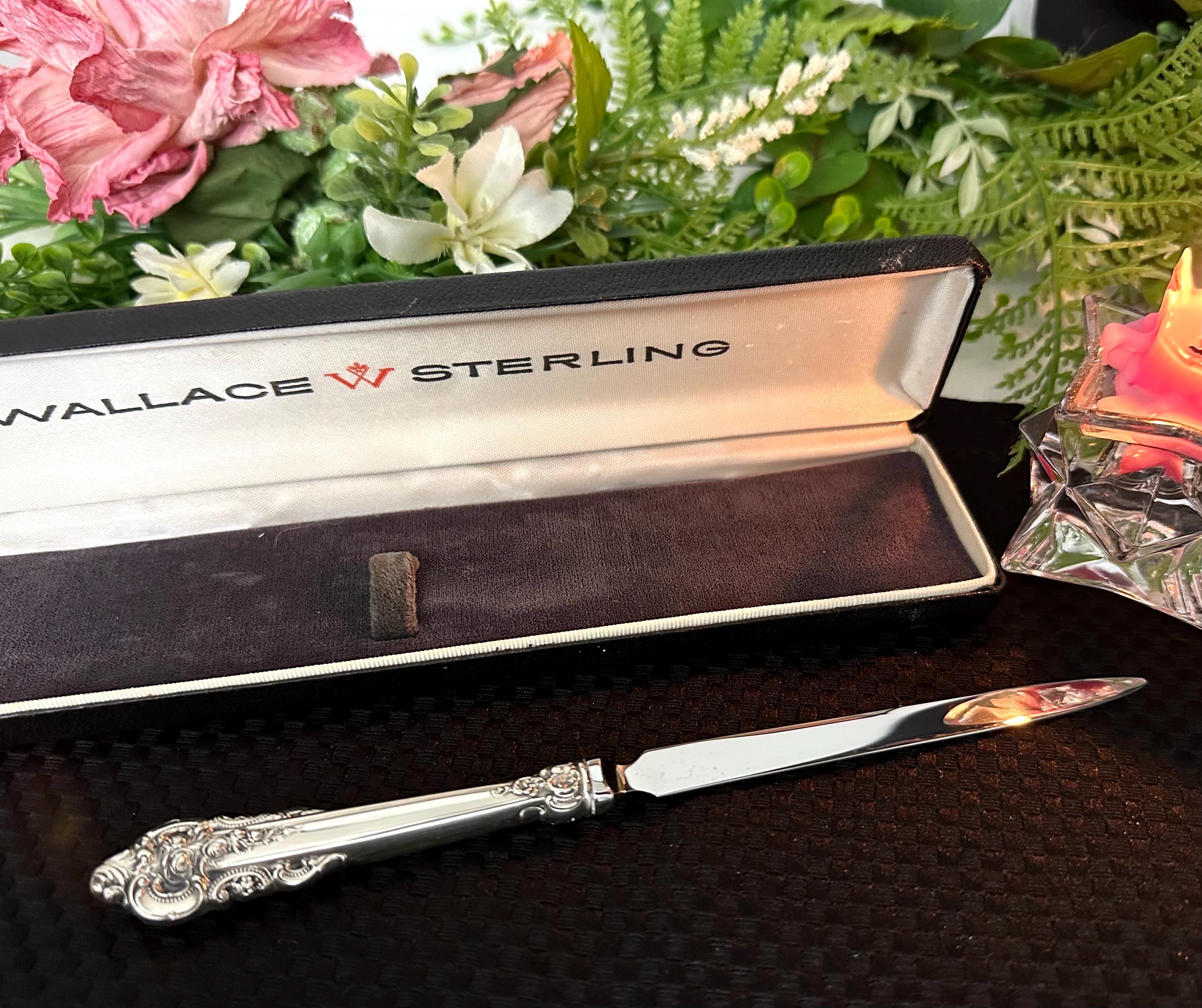 This is for a vintage Sterling silver Gorham Grand Baroque Letter Opener. This is a luxurious and elegant desk accessory made from sterling silver with a stainless blade. The pieces measures 7.75 inches long x 3/4 inches wide. This comes with the original box.