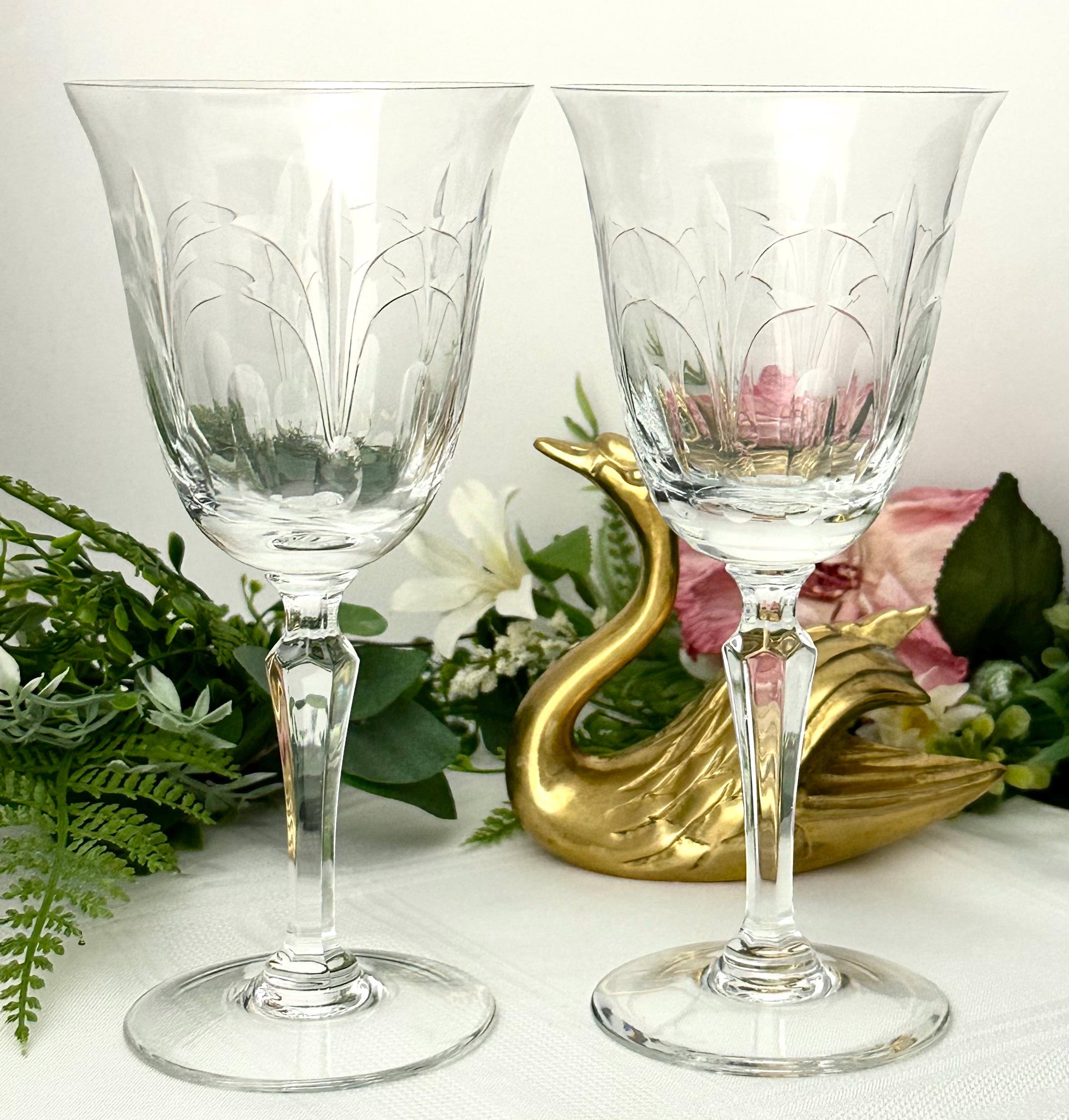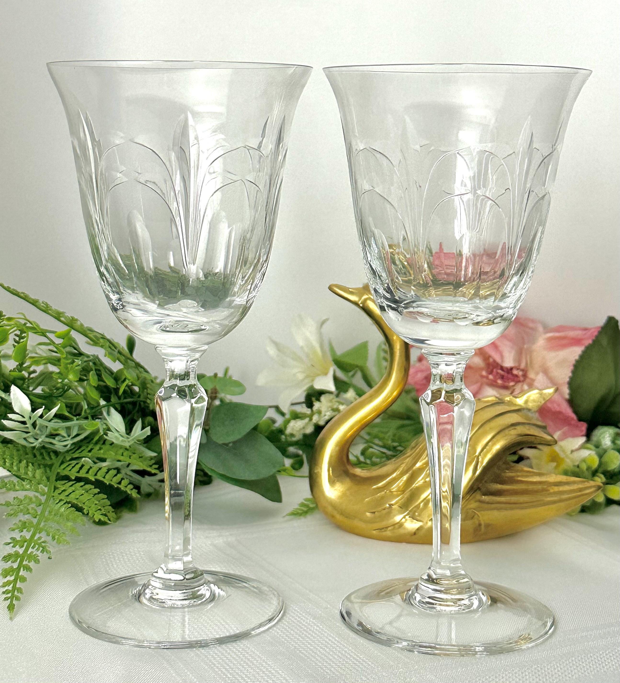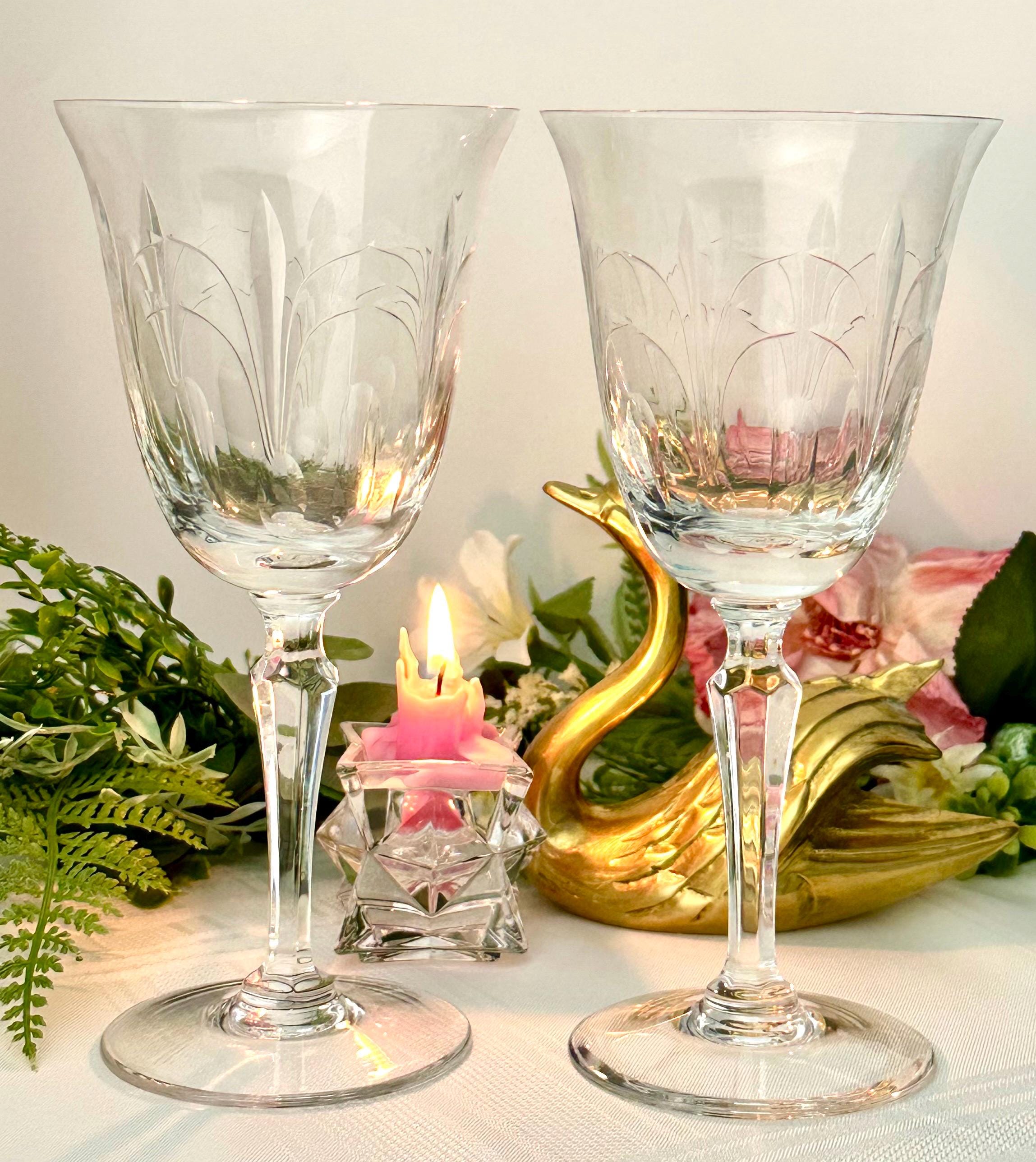 This is for 2 glasses From Tiffin-Franciscan in the Chardonnay pattern. These have stem #17683 and a cut bowl. These were produced from 1975 to 1979. They are blown glass crafted in the United States. These have a highly decorative cut pattern on the bowl and with a multisided stem.