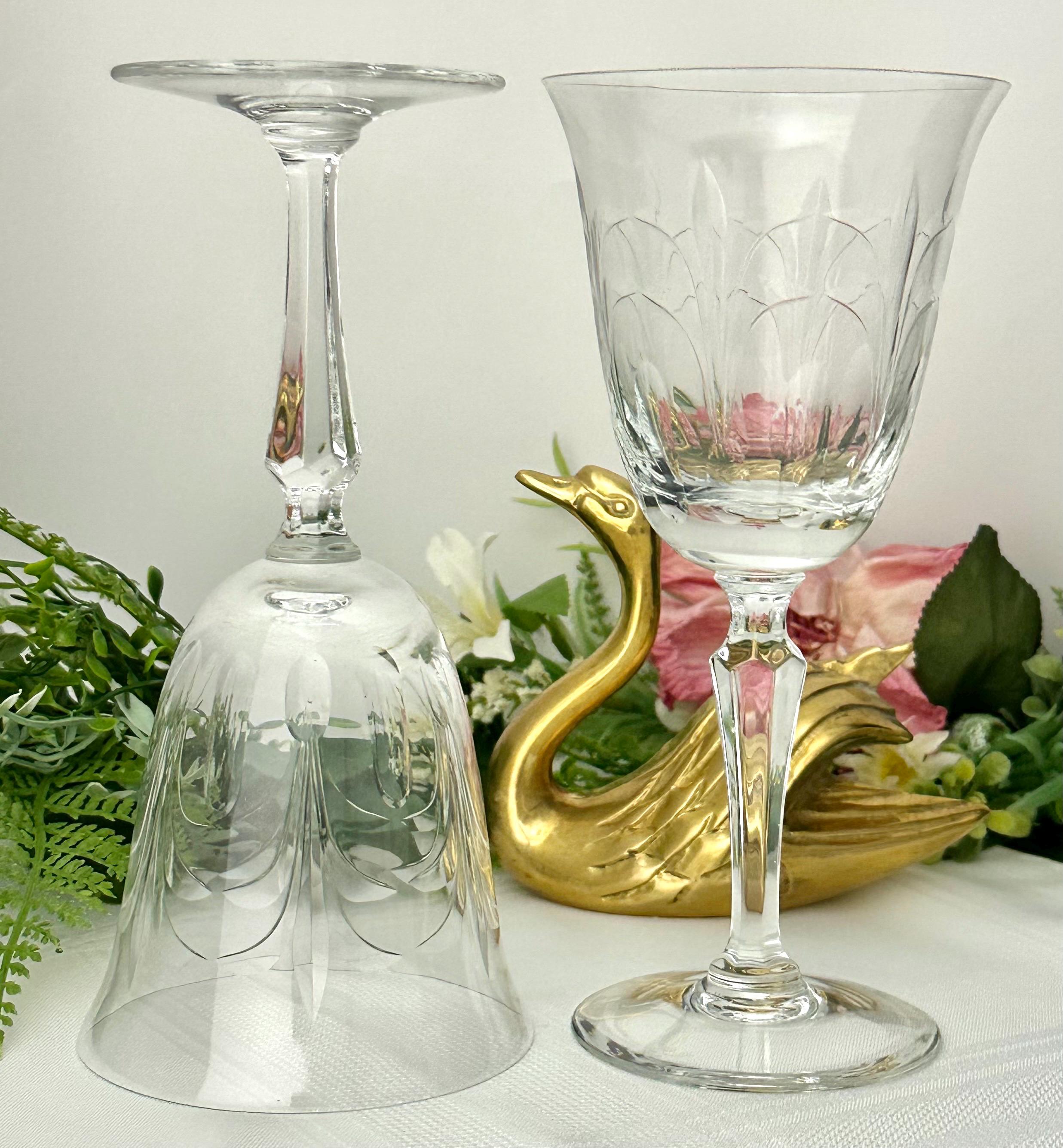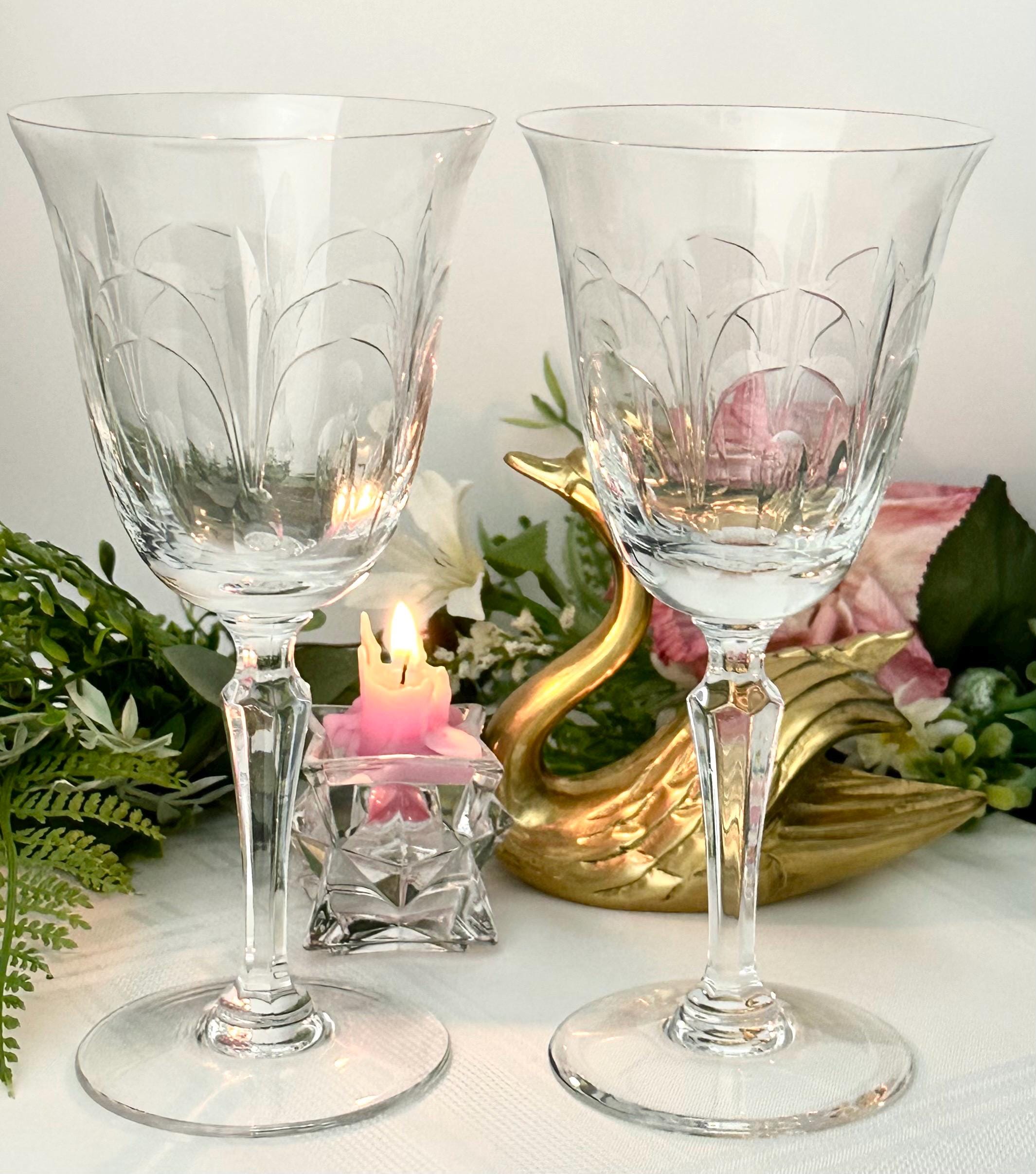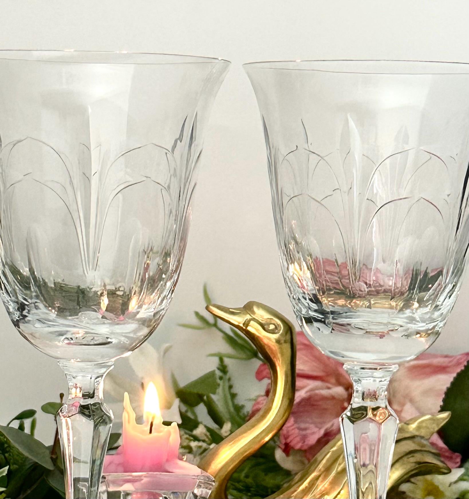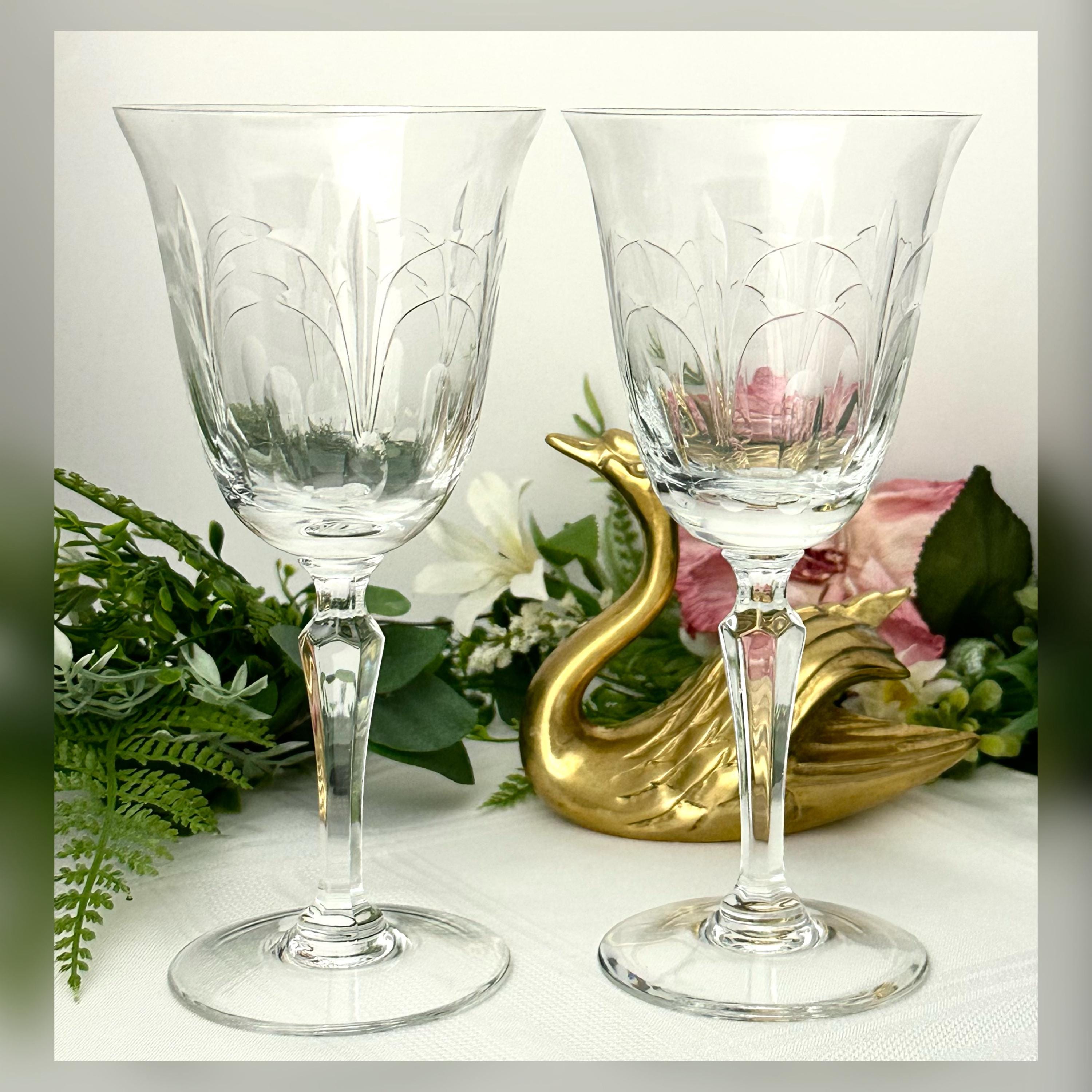 This is for 2 glasses From Tiffin-Franciscan in the Chardonnay pattern. These have stem #17683 and a cut bowl. These were produced from 1975 to 1979. They are blown glass crafted in the United States. These have a highly decorative cut pattern on the bowl and with a multisided stem.