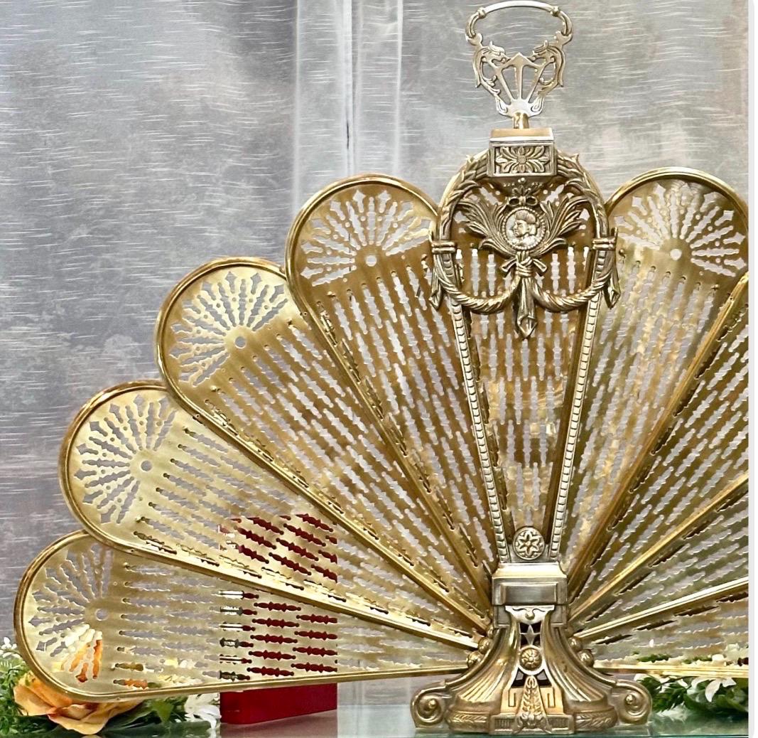 This is for a wonderful Vintage brass "peacock fan" fireplace screen. It looks lovely open and yet still very decorative when sitting closed. This lovely piece has an ornate design and is two sided with a Vintage style Cameo Face mounted on the front with a raised motif. It also is adorned with a Finial/handle in a dragon motif on the top for carrying it.