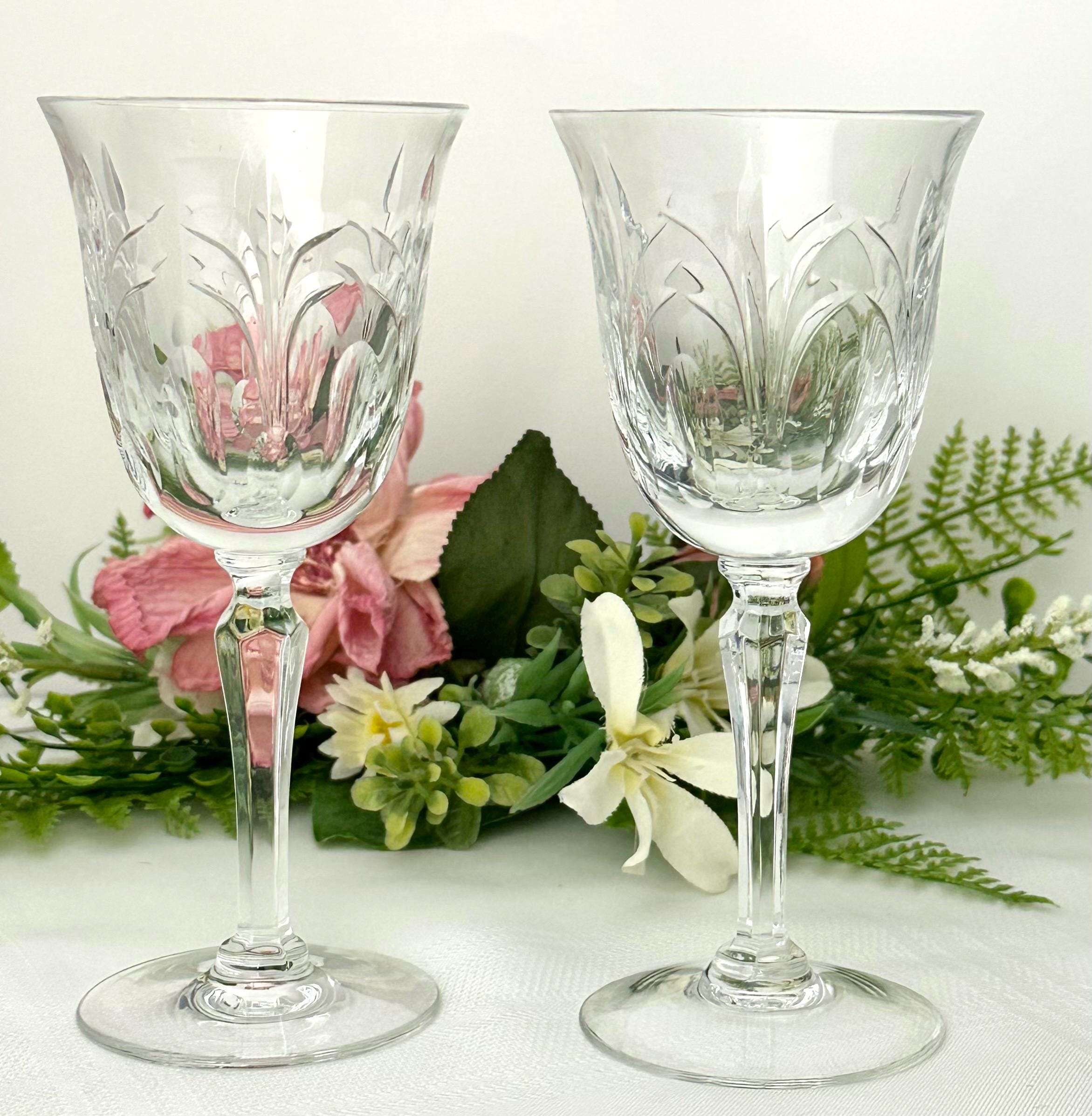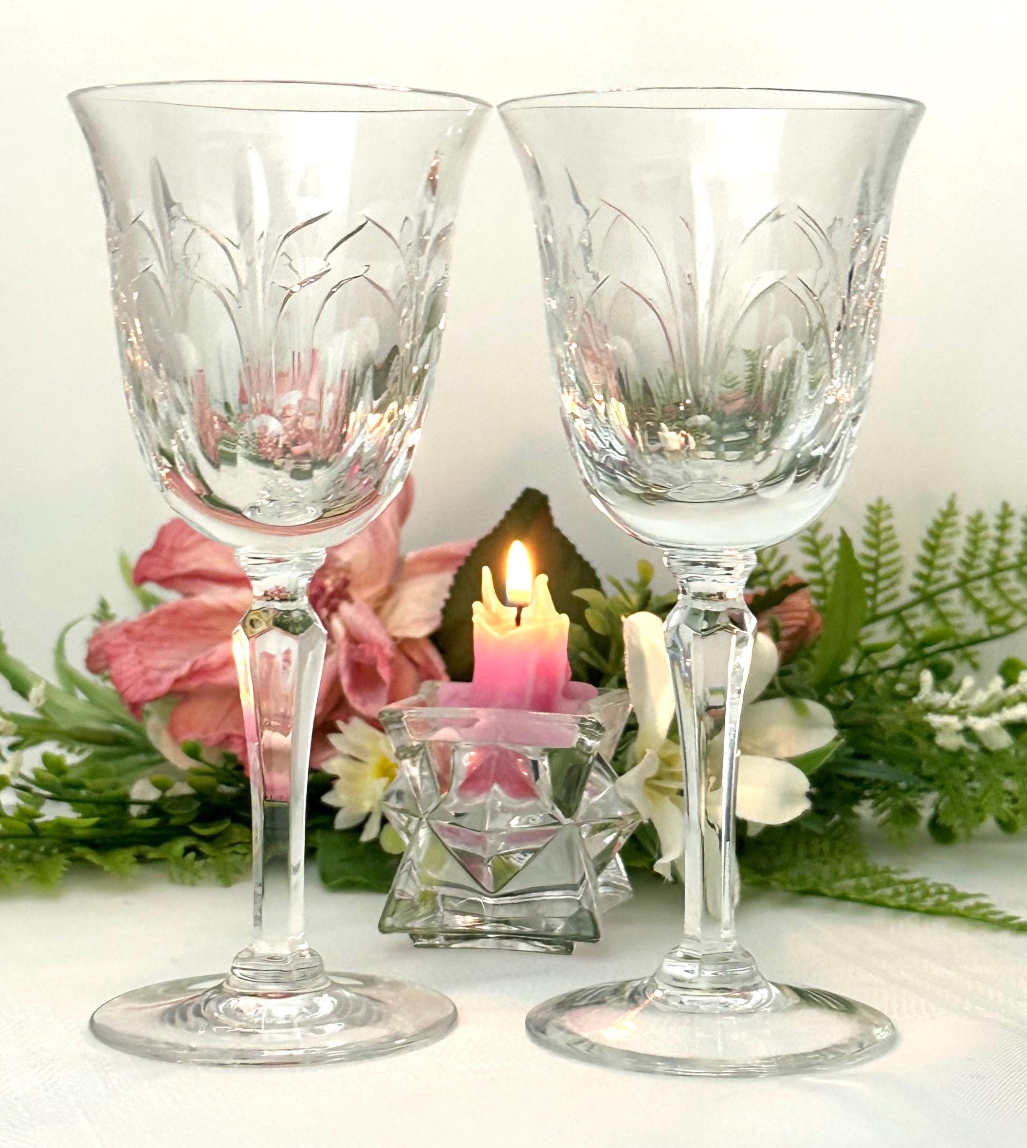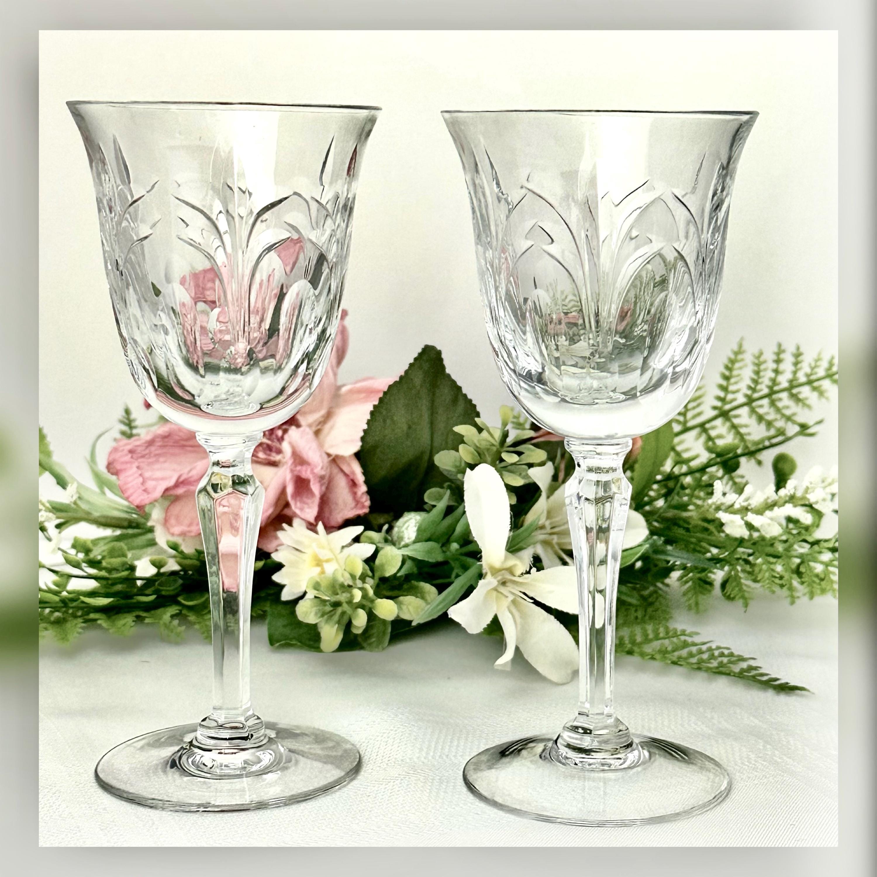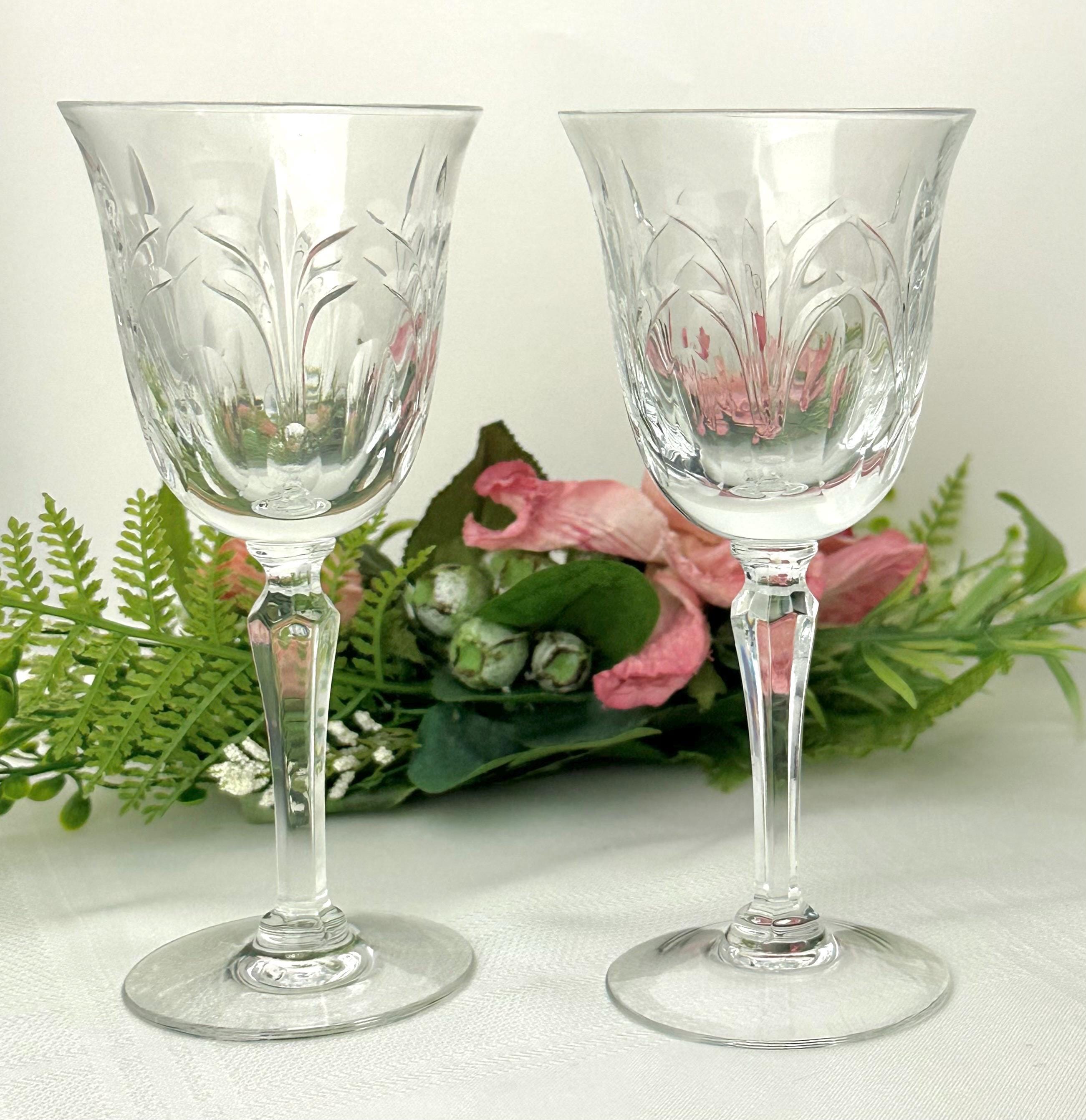 This is for a pair of Wine glasses From Tiffin-Franciscan in the Chardonnay pattern. These have stem #17683 and a cut bowl. These were produced from 1975 to 1979. They are blown glass crafted in the United States. These have a highly decorative cut pattern on the bowl and with a multisided stem.