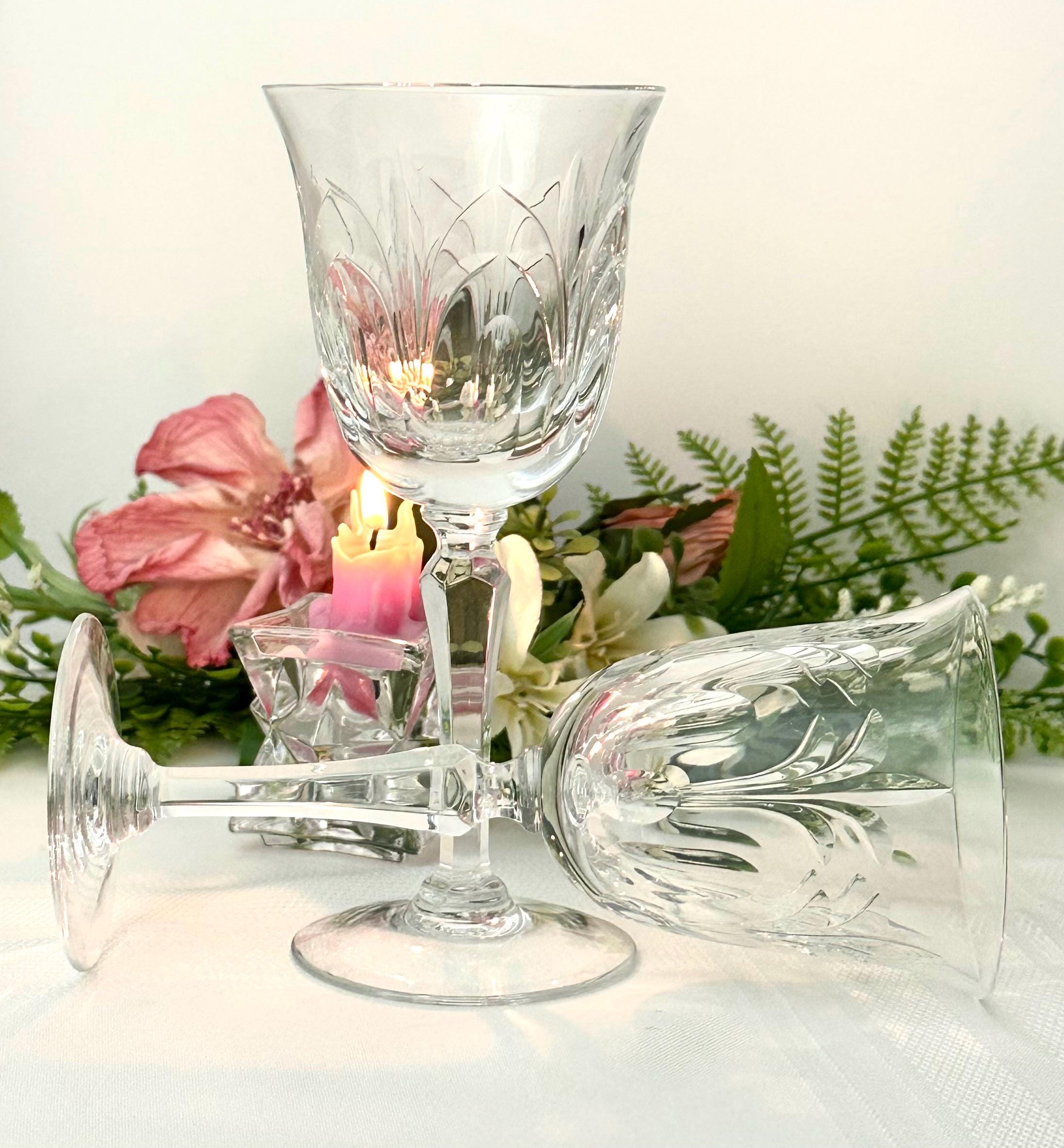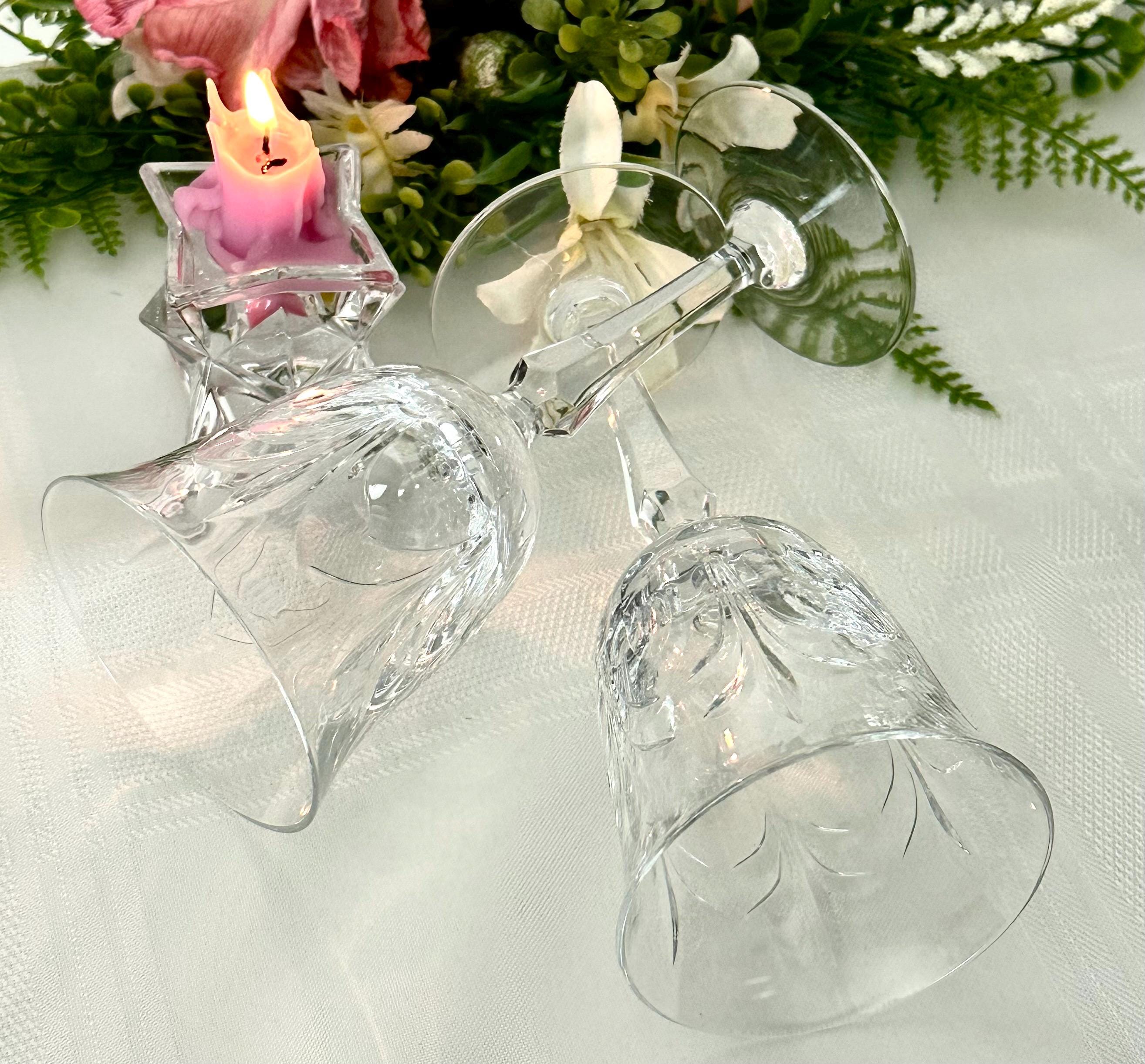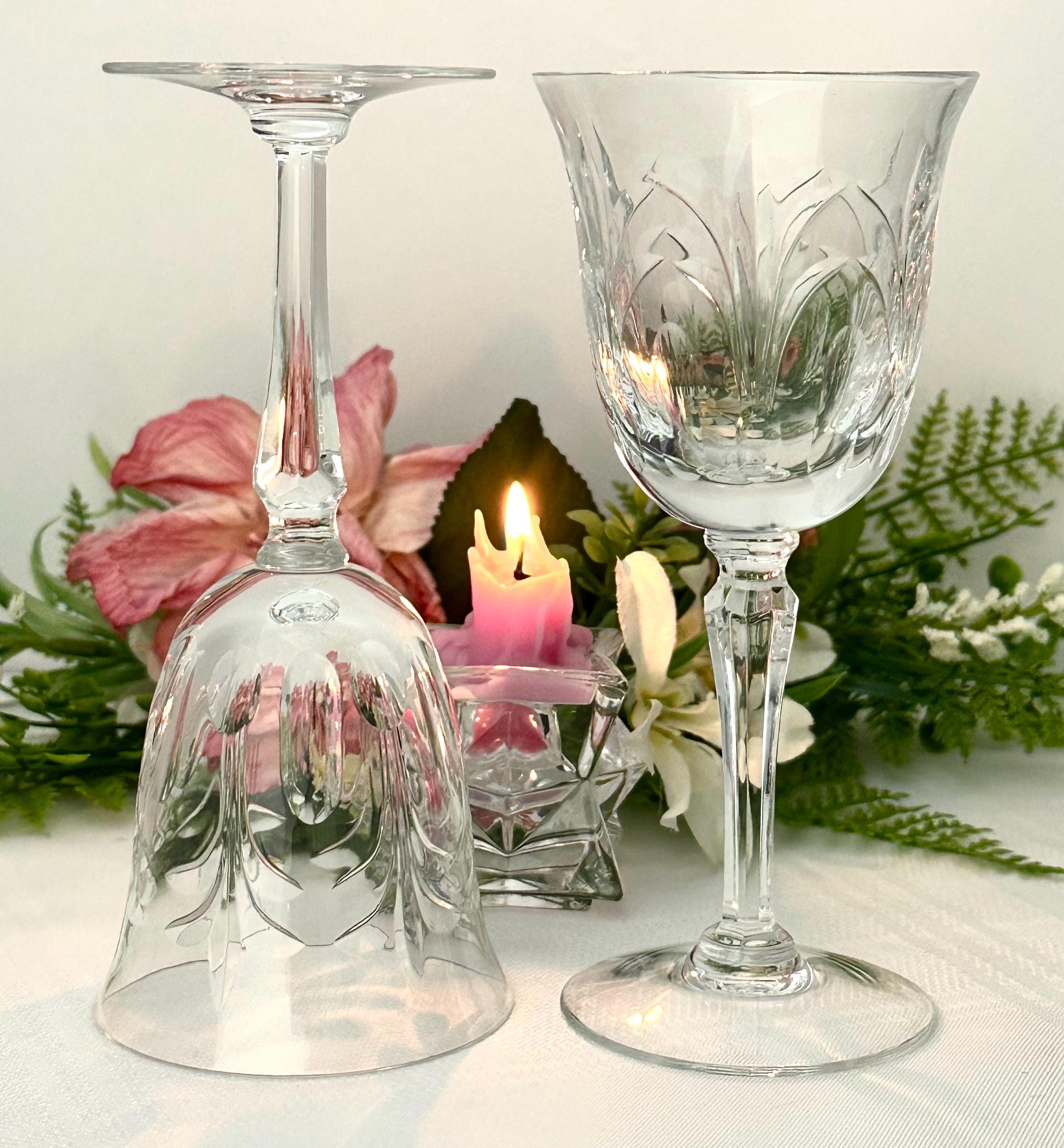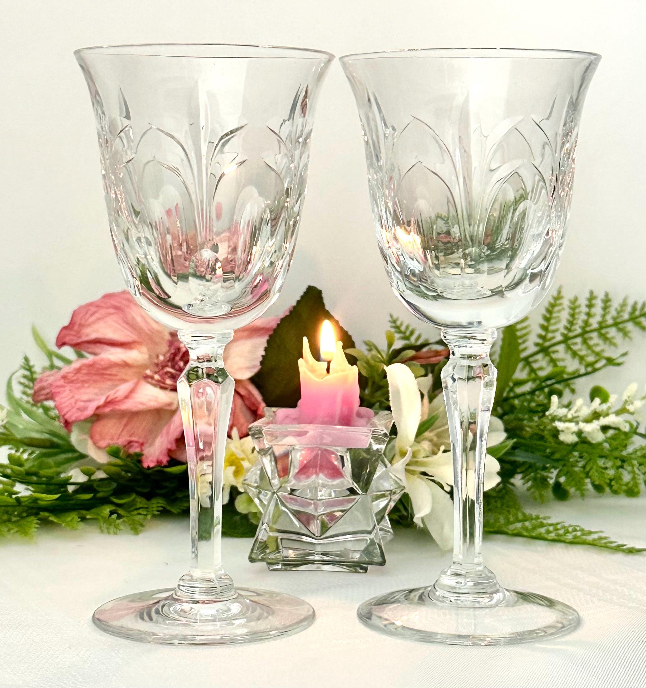 This is for a pair of Wine glasses From Tiffin-Franciscan in the Chardonnay pattern. These have stem #17683 and a cut bowl. These were produced from 1975 to 1979. They are blown glass crafted in the United States. These have a highly decorative cut pattern on the bowl and with a multisided stem.